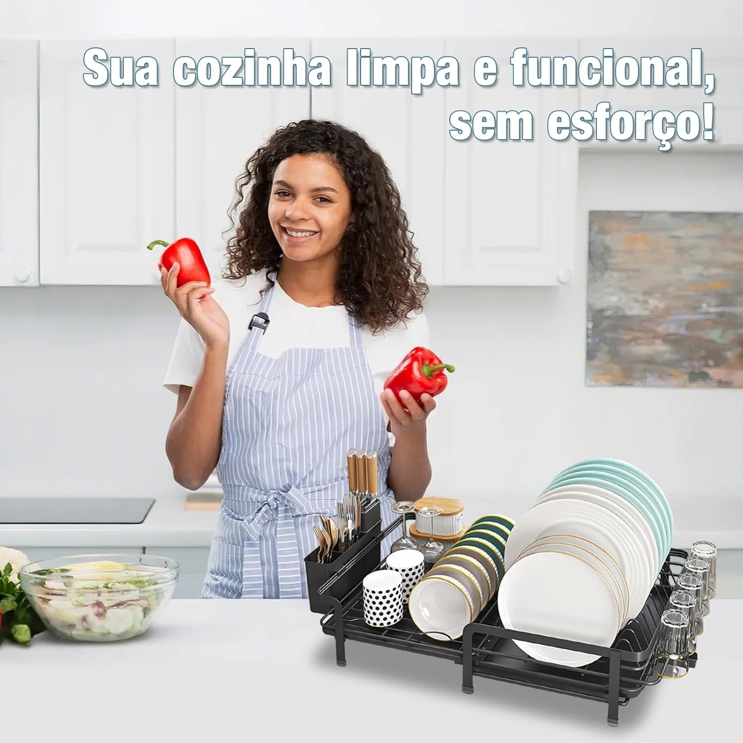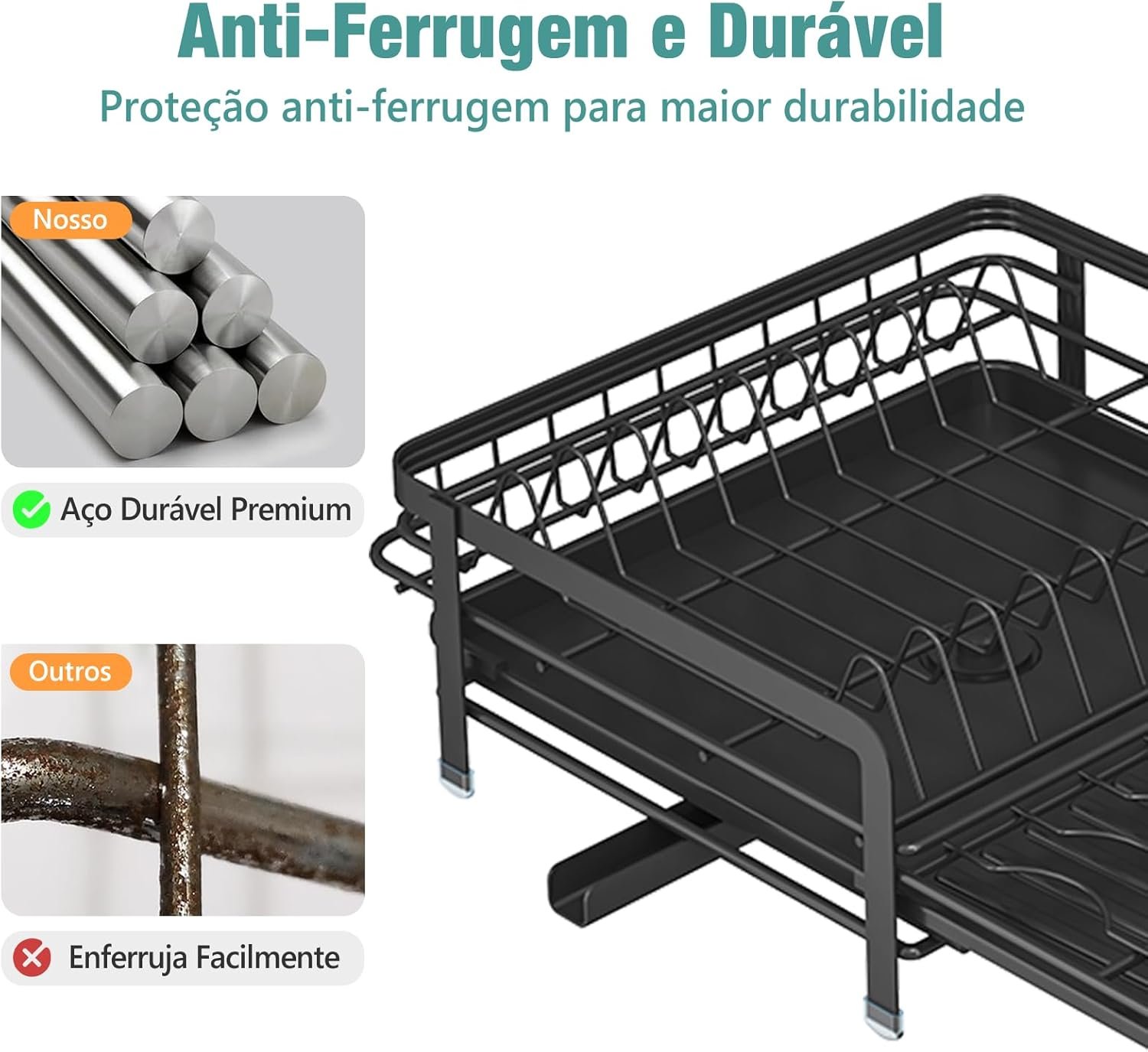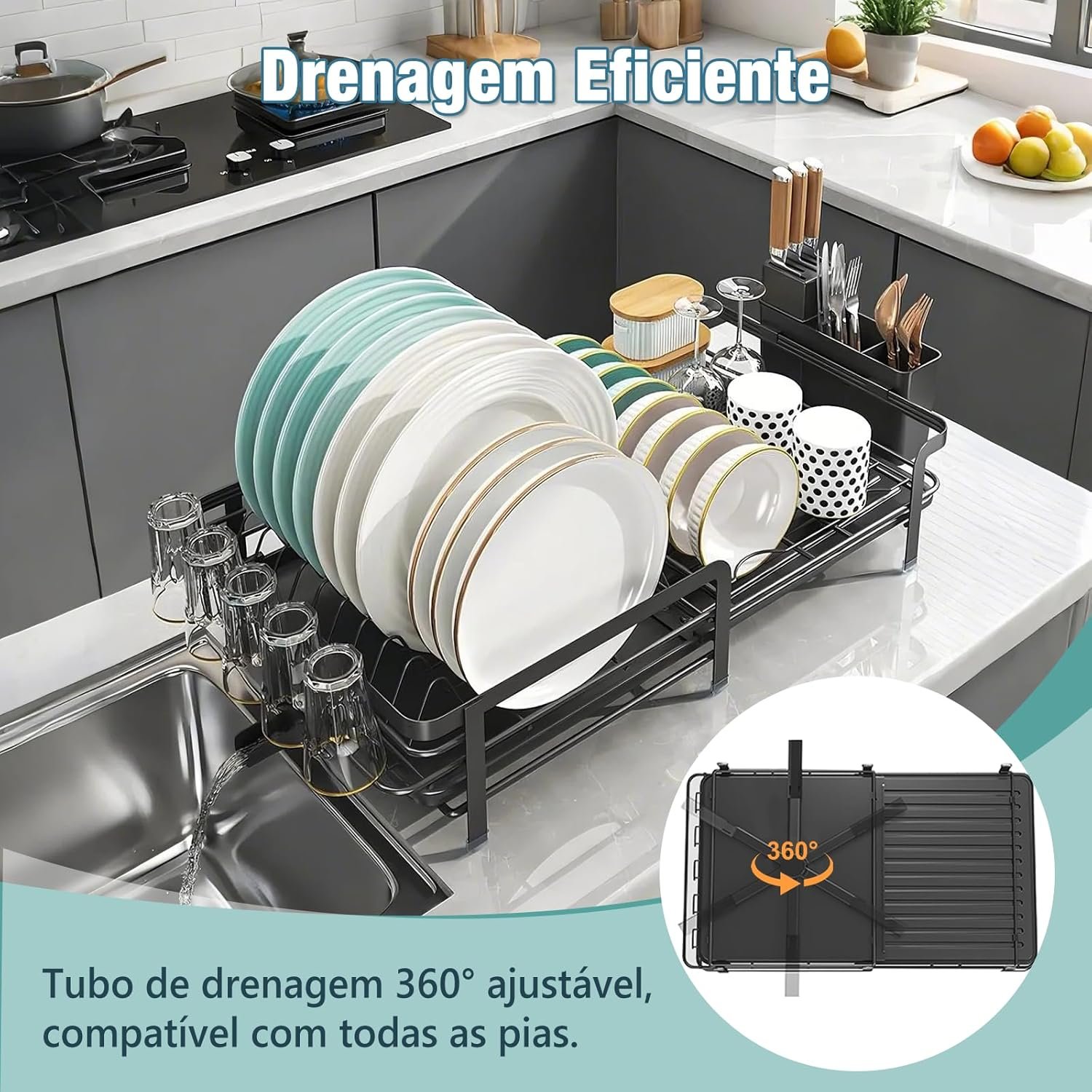 DF Escorredor de Louça Expansível (35-55 cm) para Bancada de Cozinha, Escorredor de Pratos com Suporte para Copos e Bandeja Coletora, Alta Capacidade, Preto