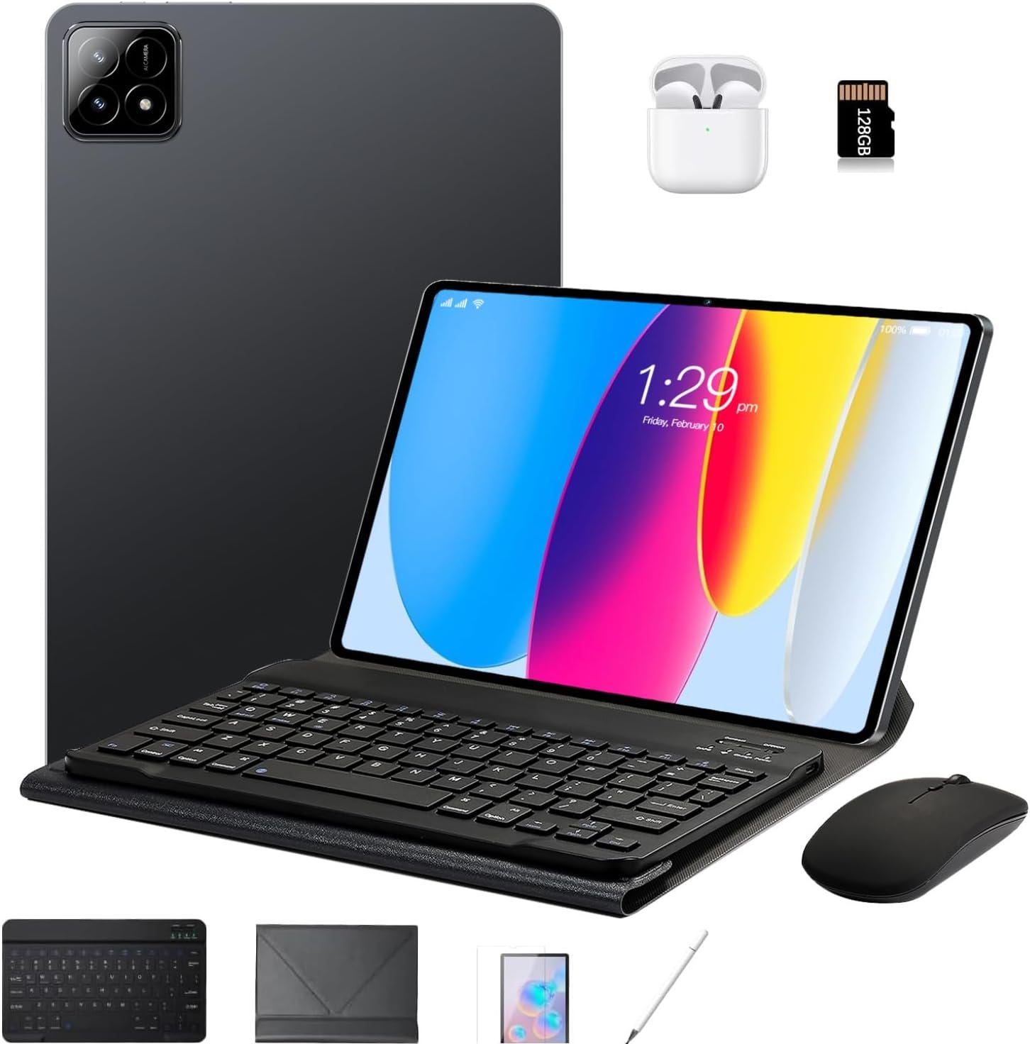 DIVENT-Tablet 3 em 1 com estojo/teclado/mouse/cartão de memória, 10,1 polegadas, Android 14, 16GB de RAM + 512GB de ROM, câmera de 8MP + 16MP, GPS, Bluetooth, bateria de 8800mAh,Wi-Fi Edition (preto)