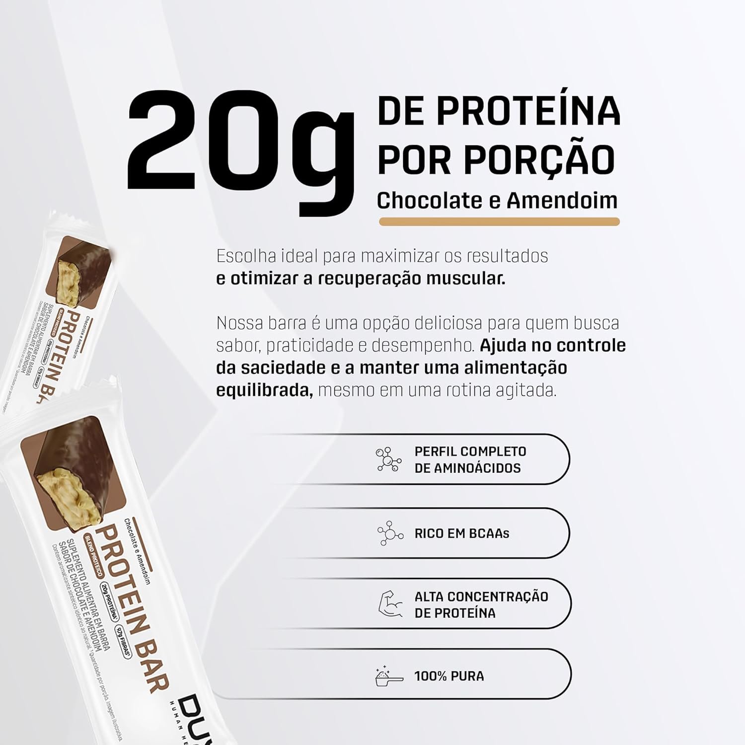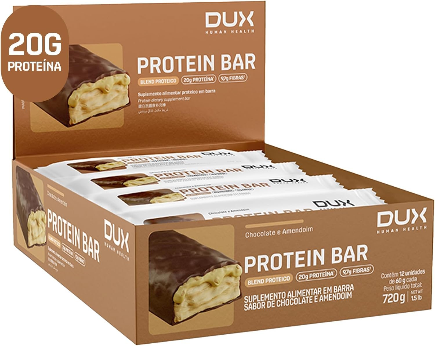 DUX HUMAN HEALTH Protein Bar 12 Unidades Chocolate e Amendoim – Snack Proteico com Fibras