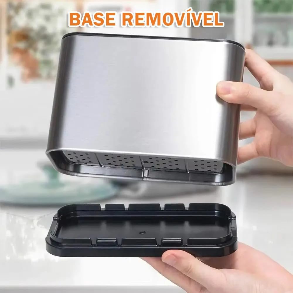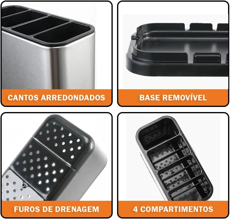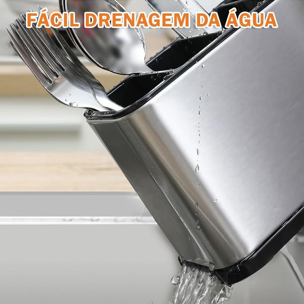 Escorredor e Porta Talheres de Aço Inox com 4 Divisórias – Organizador de Utensílios Compacto Com Drenagem De Água Design Moderno e Praticidade Para a sua Pia Premium