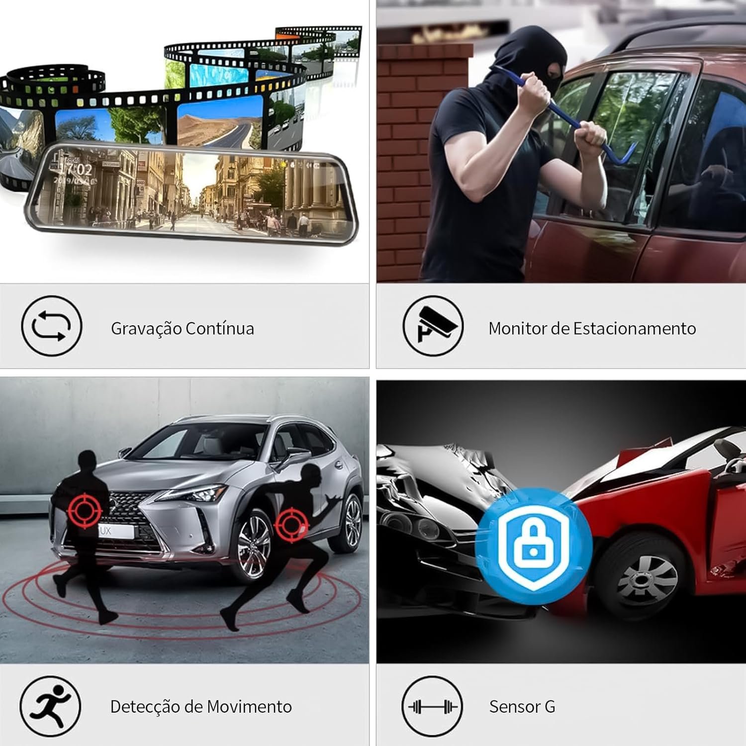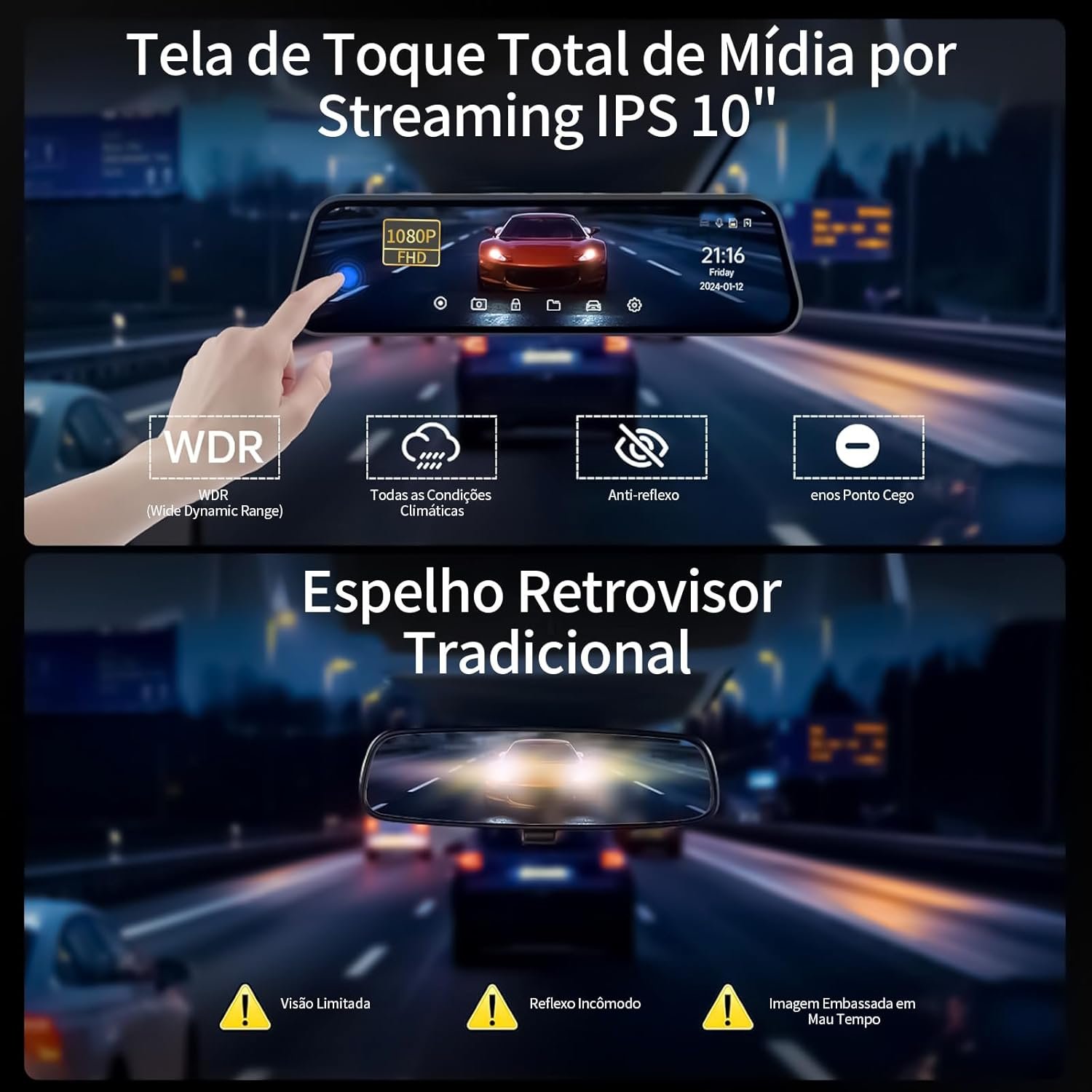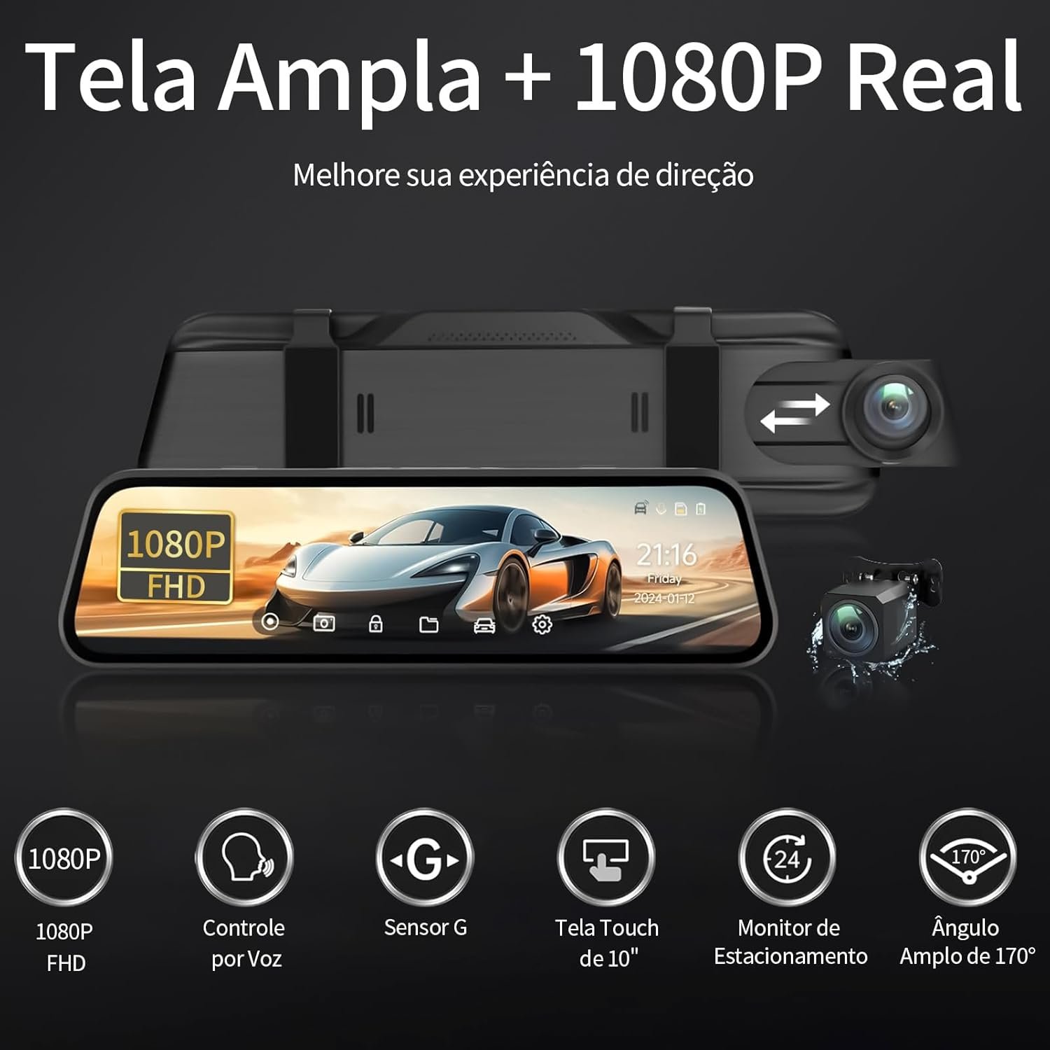 Espelho Câmera 10″ Touch IPS HD Duplo Canal (1920p+1080p) – 170° Ângulo Ultra Amplo e Função Espelho, Gravador de Mídia com Sensor de Impacto (G-Sensor), Gravação em Loop, Câmera de Ré e Cartão 64GB