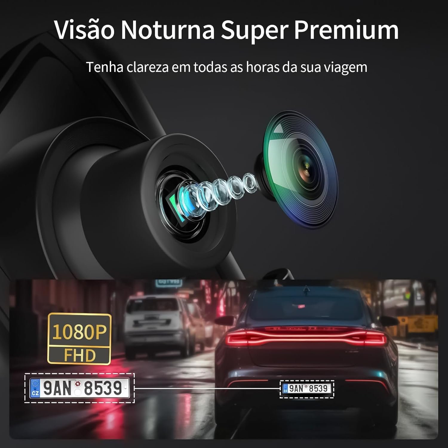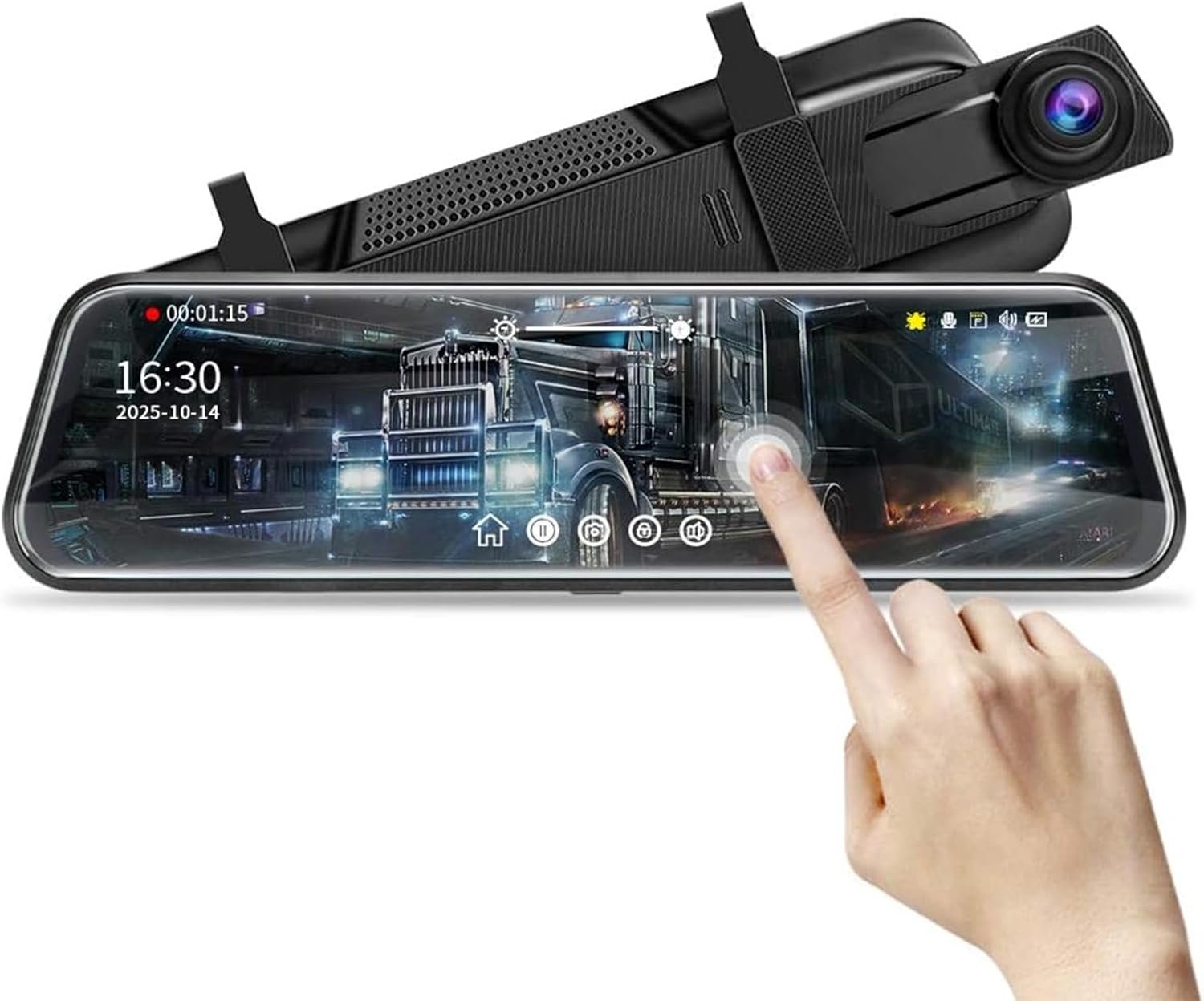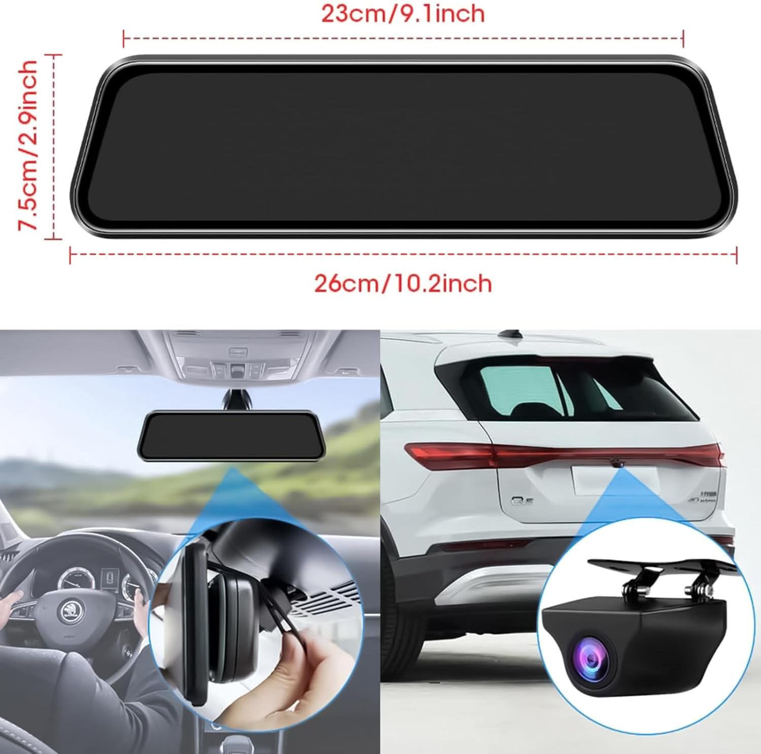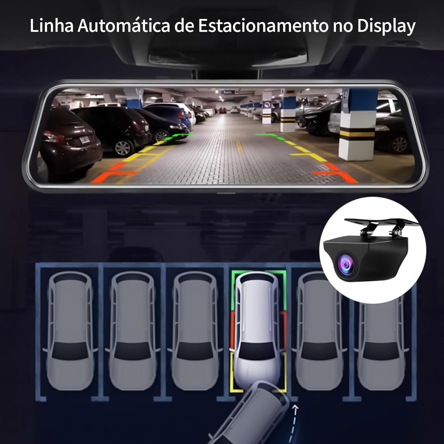 Espelho Câmera 10″ Touch IPS HD Duplo Canal (1920p+1080p) – 170° Ângulo Ultra Amplo e Função Espelho, Gravador de Mídia com Sensor de Impacto (G-Sensor), Gravação em Loop, Câmera de Ré e Cartão 64GB