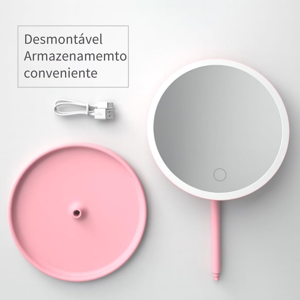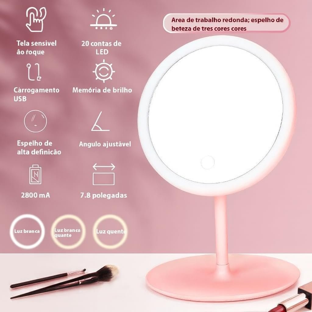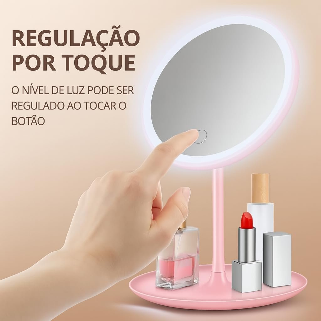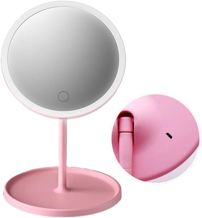 Espelho de Mesa com Luz LED, Regulação por Toque, 3 Cores de Luz,com Bandeja Organizadora,(Rosa)