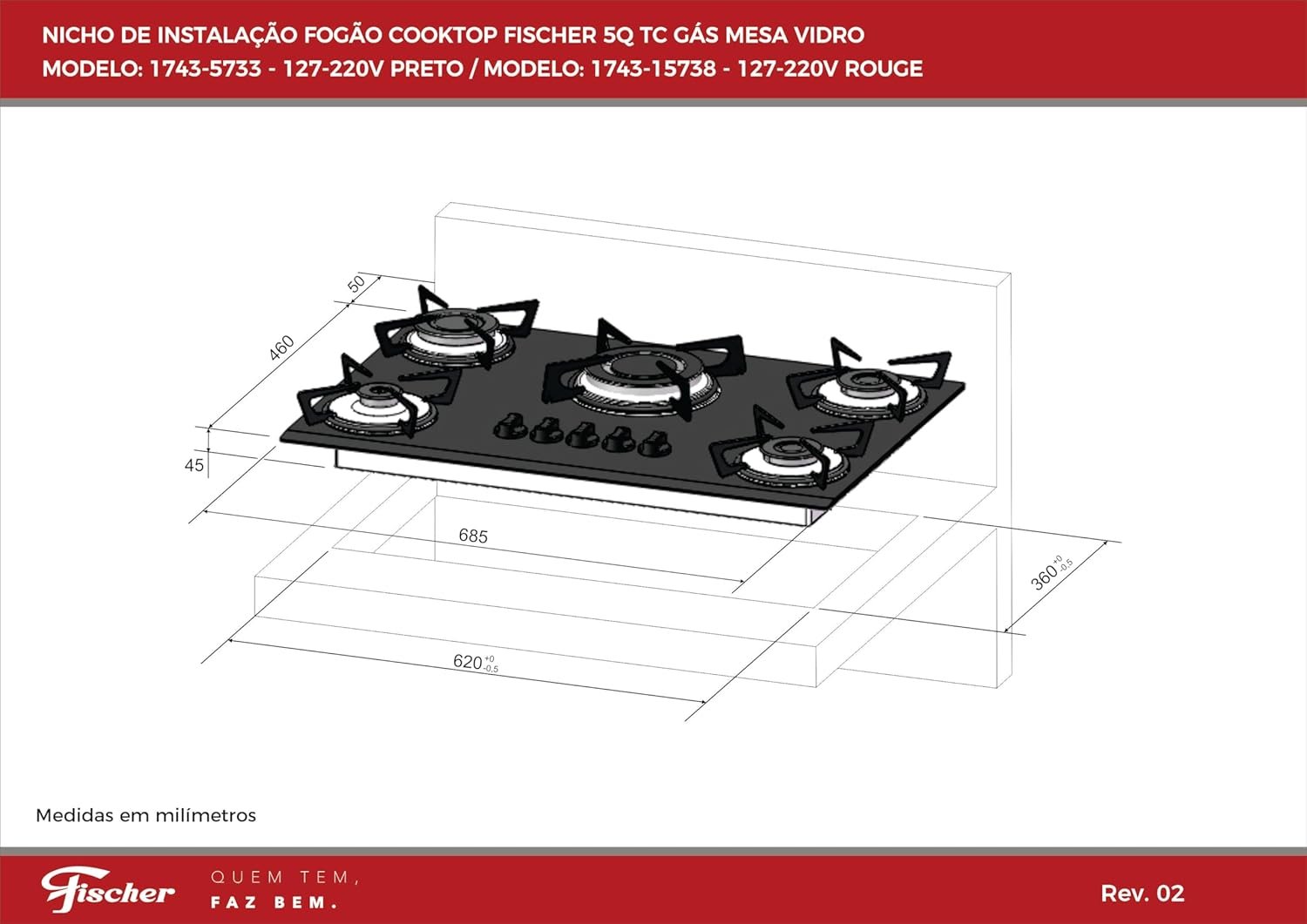 FISCHER COOKTOP À GÁS 5 BOCAS TRIPLA CHAMA MESA VIDRO PRETA BIVOLT 1743-5733