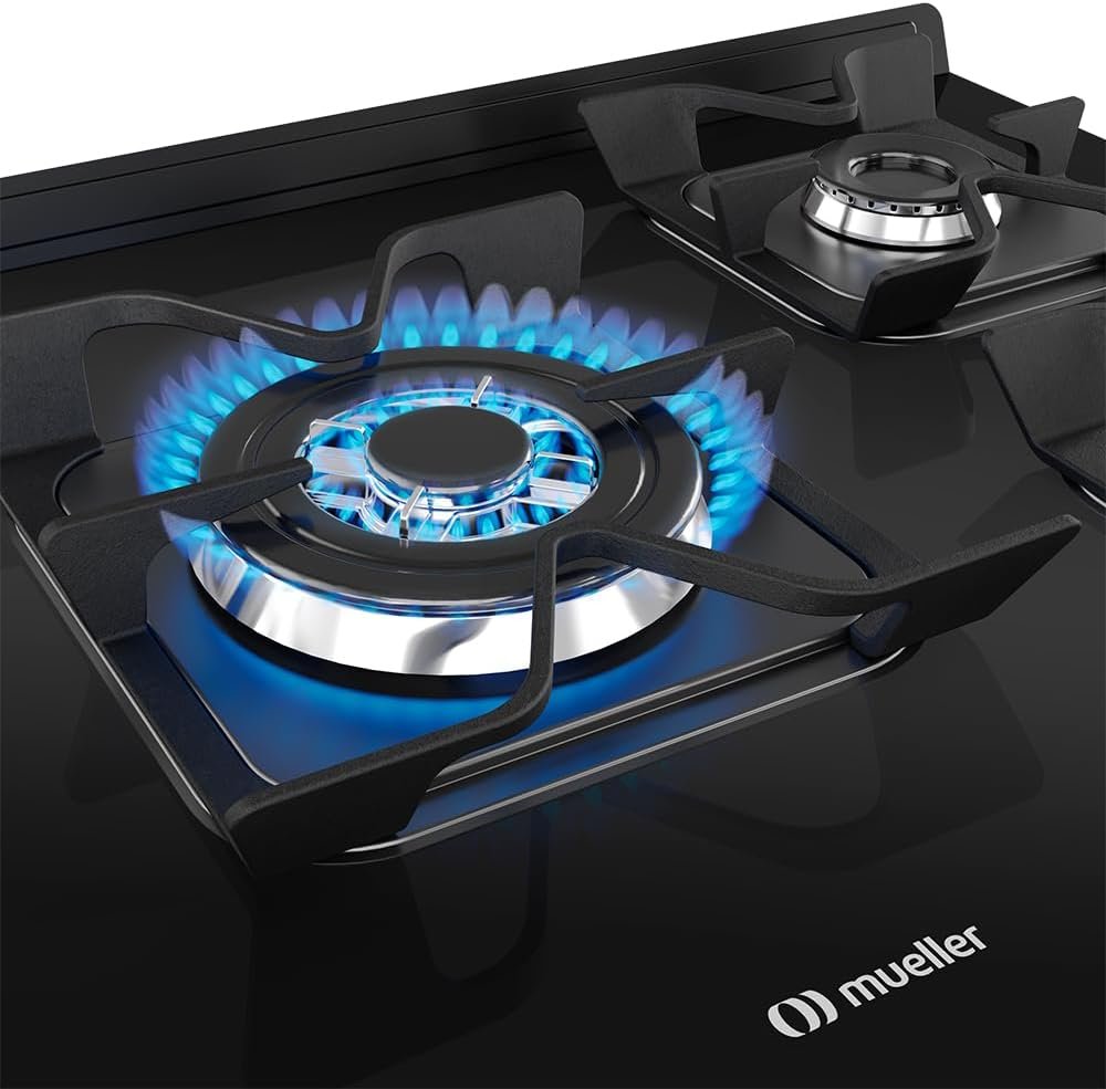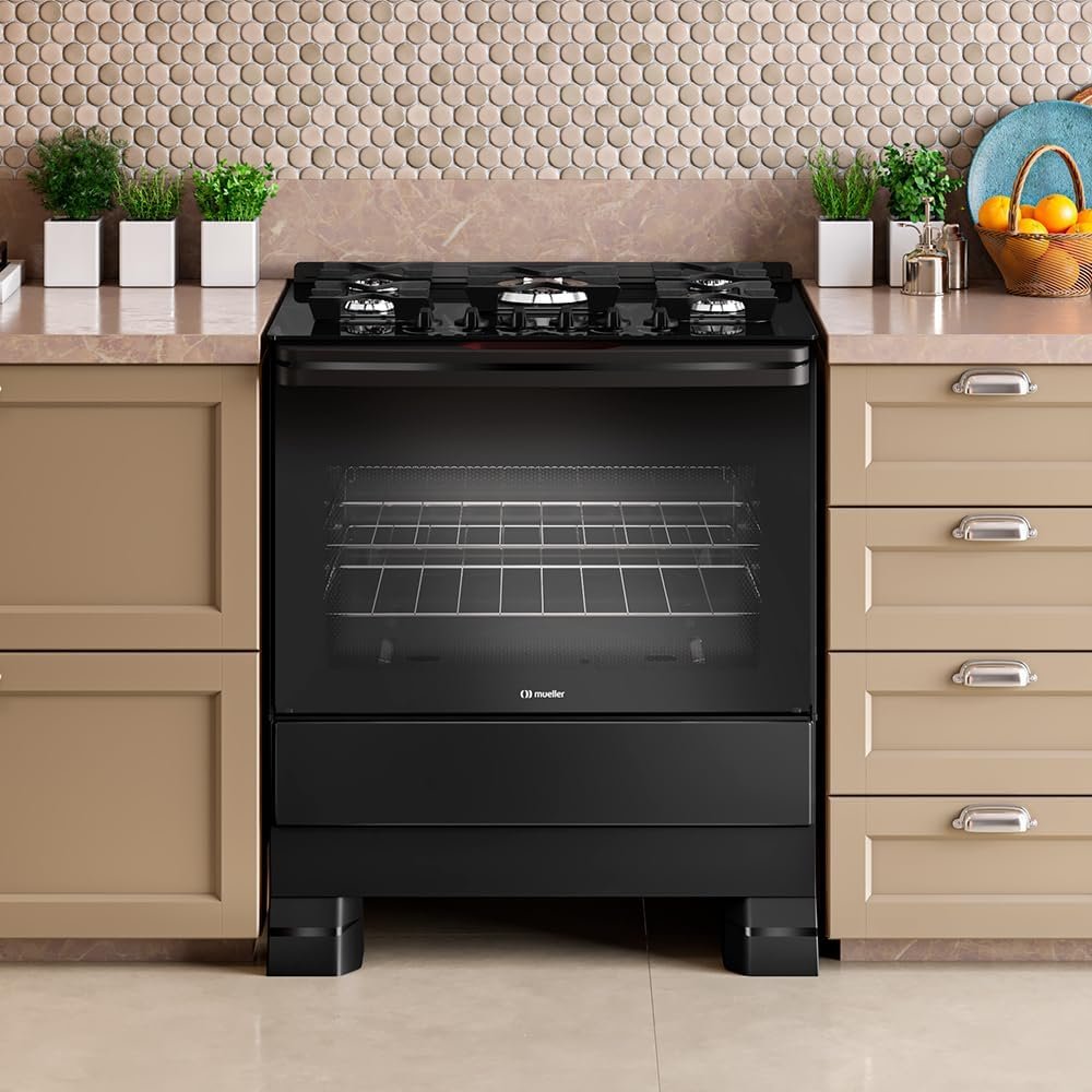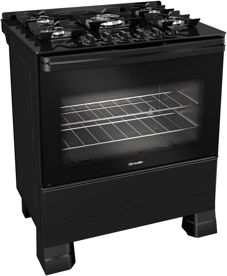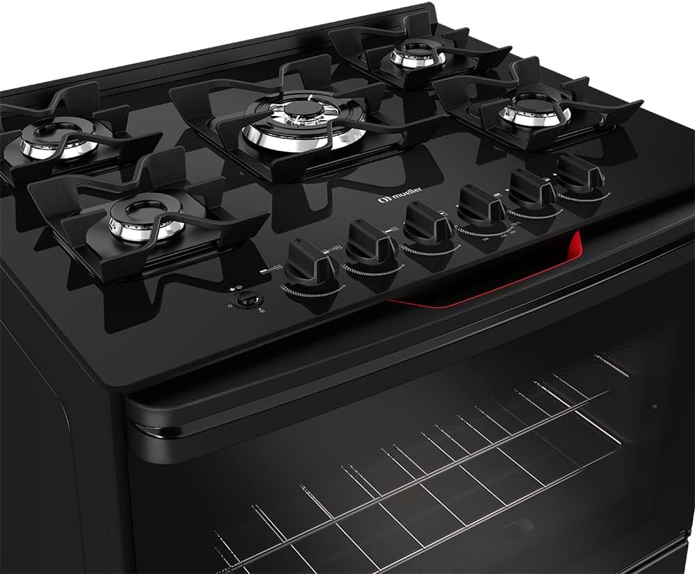 Fogão Mueller 5 bocas Preto com Mesa de Vidro e Tripla Chama Bivolt MFV5BF