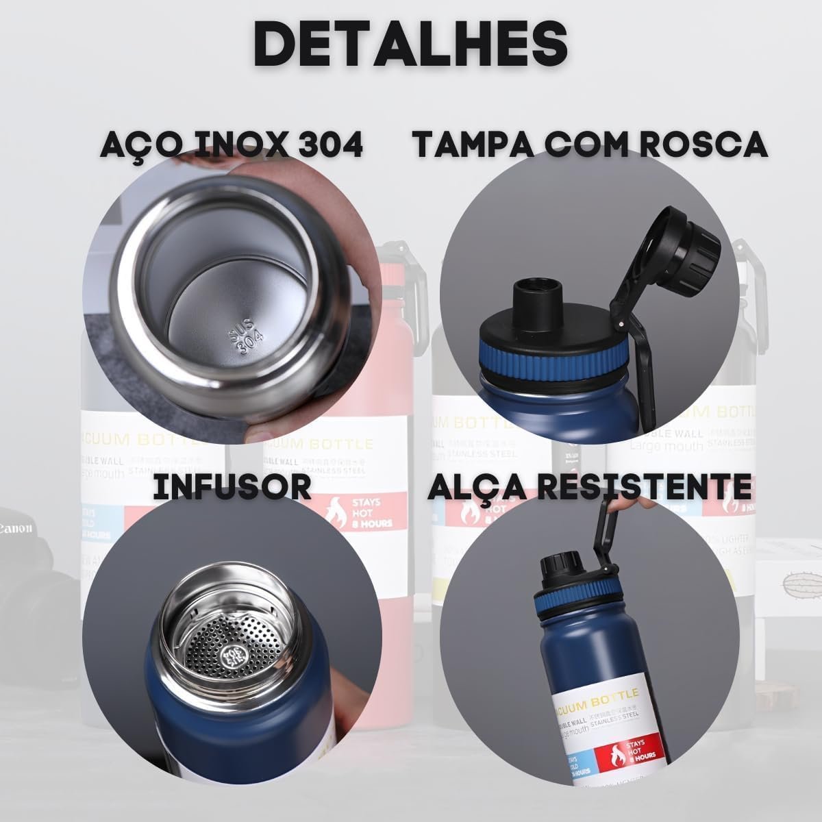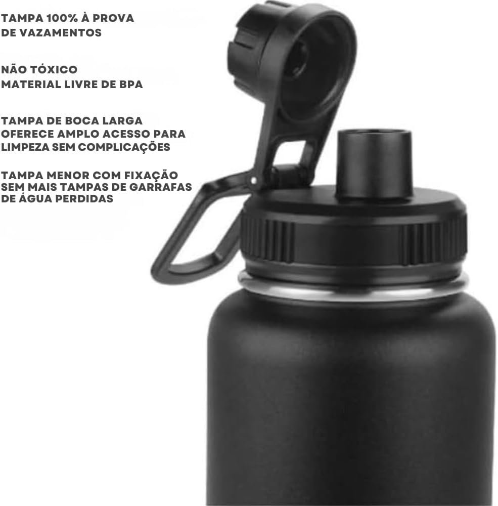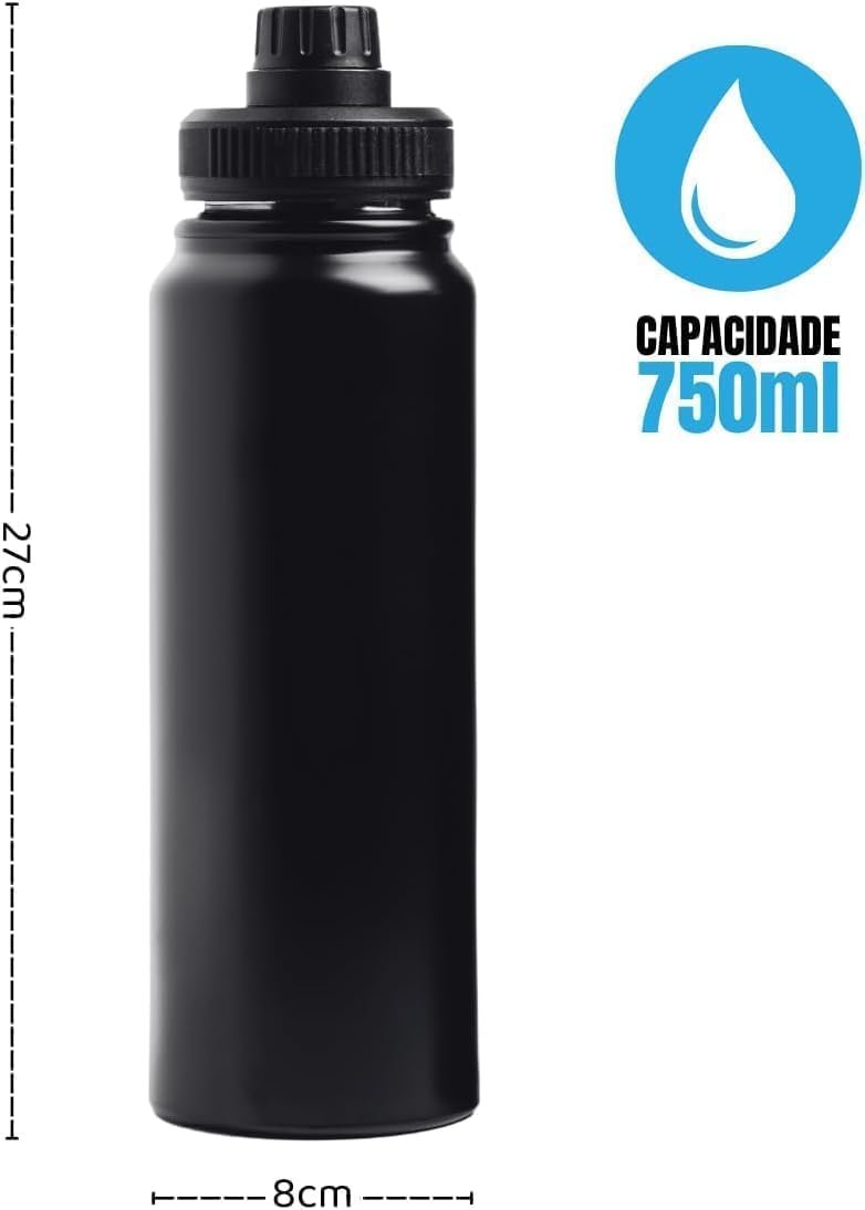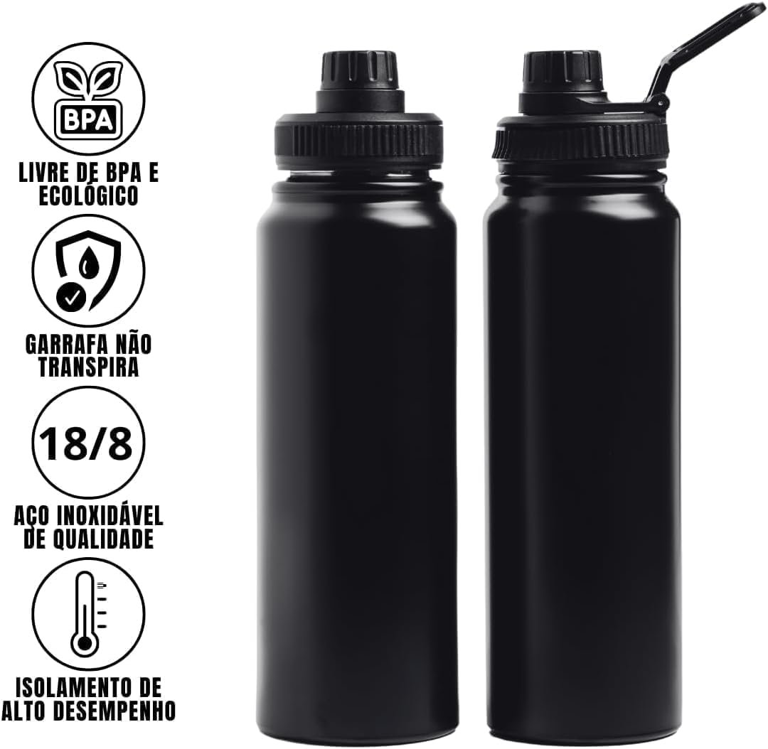 Garanta sua hidratação com a Garrafa Térmica Esportiva 800ml em Aço Inox 304 Preta. Ideal para a academia, possui tampa antivazamento, alça dobrável e é livre de BPA. Com parede dupla e vácuo, mantém líquidos frios por até 12 horas e quentes por até 8 horas. Além disso, conta com infusor de frutas, sendo portátil, elegante e durável. Aproveite!