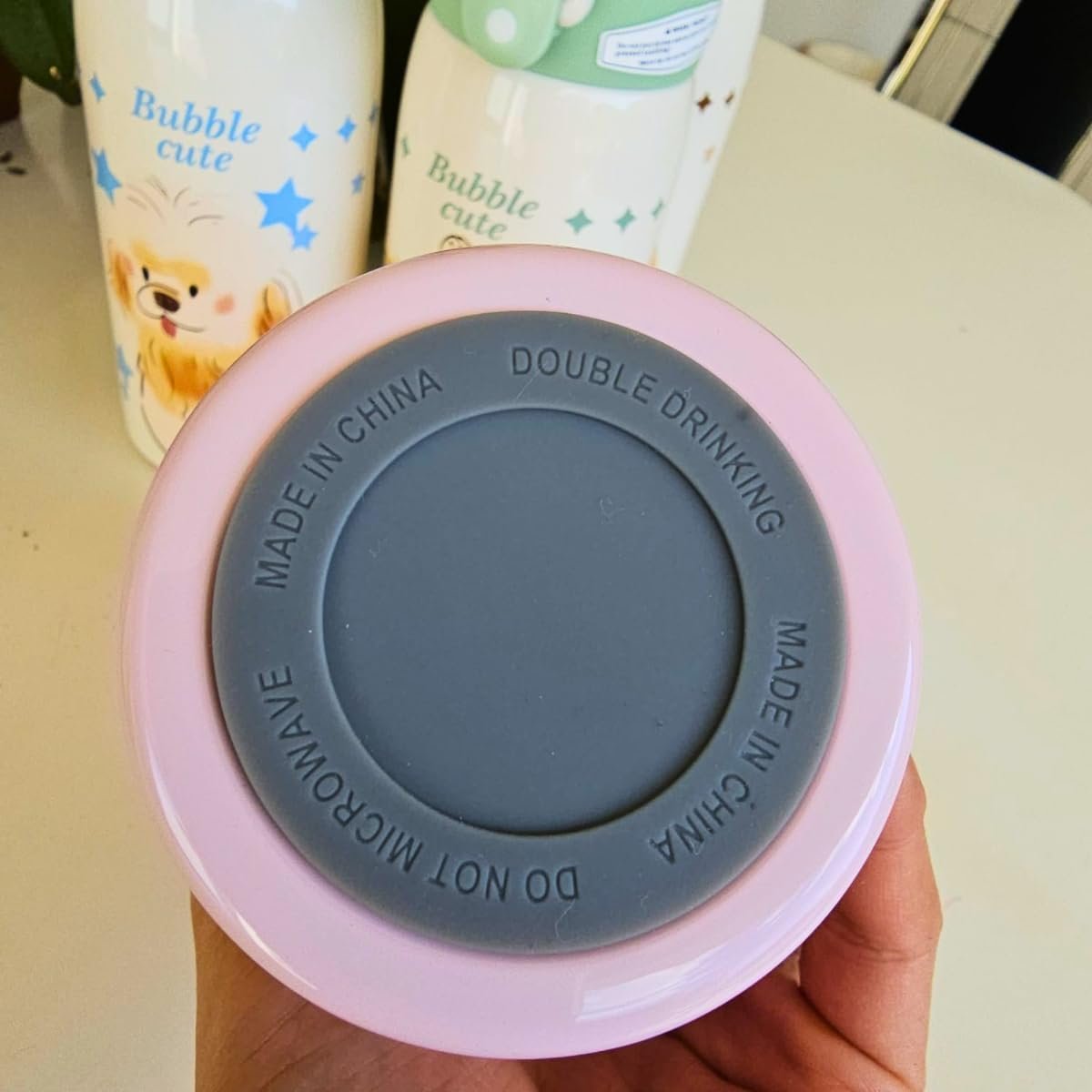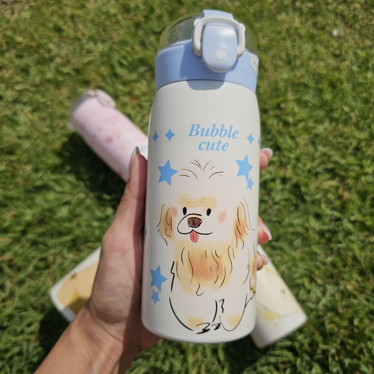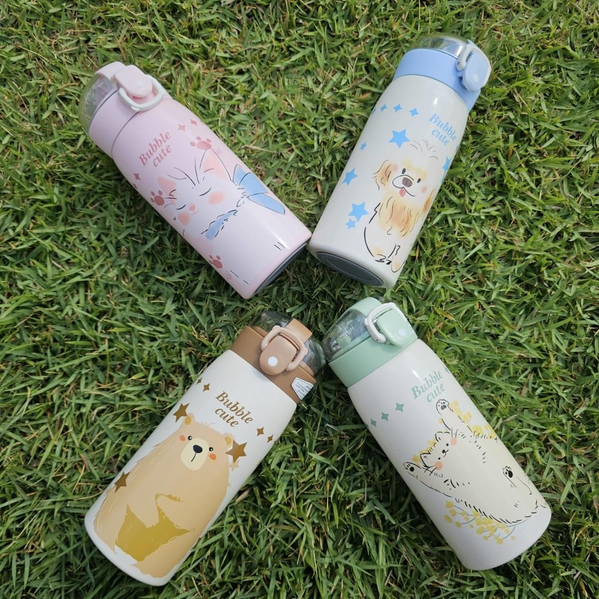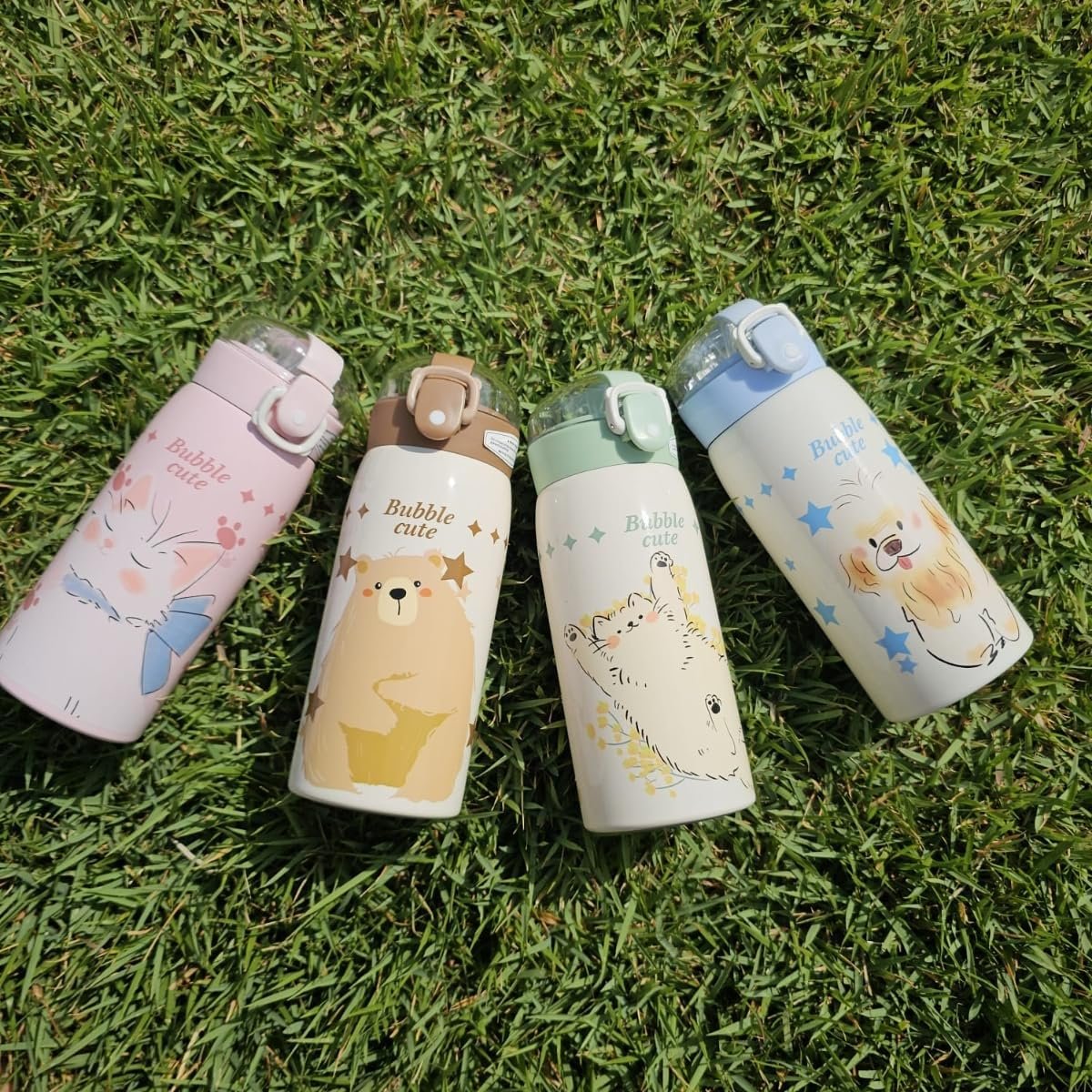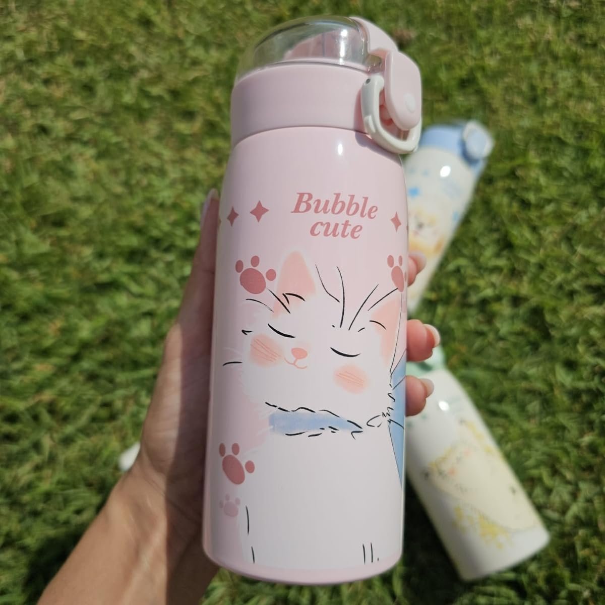 Garrafa Térmica Garrafinha Térmica Infantil Inox Canudo Trava 350 ml – Desenho dinossauro Coelho Carneiro Panda – TYDA (GATINHO VERDE)