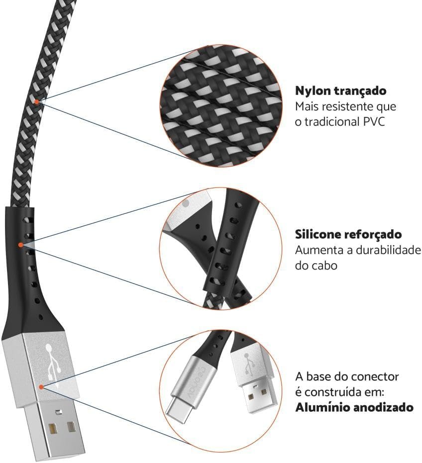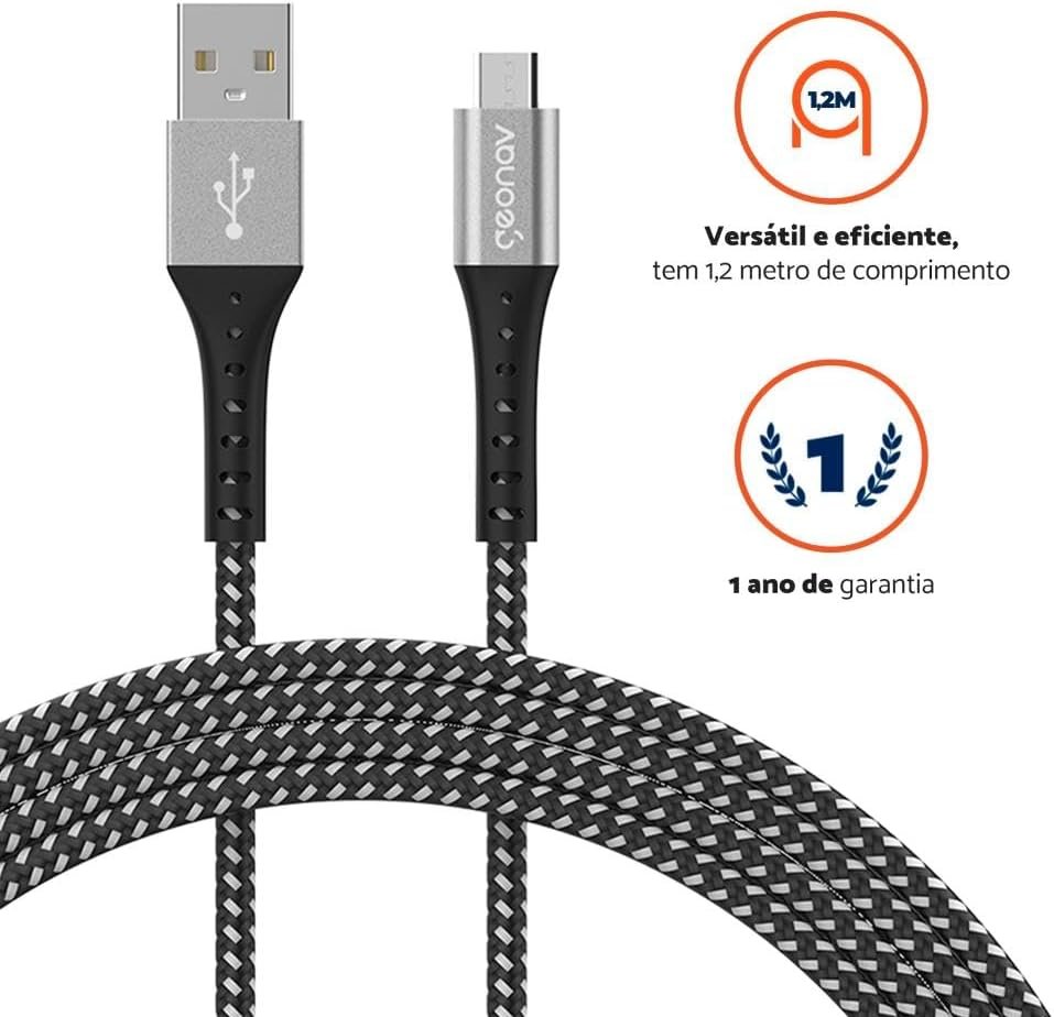 Geonav Cabo USB-A para micro USB, 1.2 metros, nylon trançado, resiste até 10 mil dobras, tranferência de dados até 480 Mbps, ESMIBK, preto