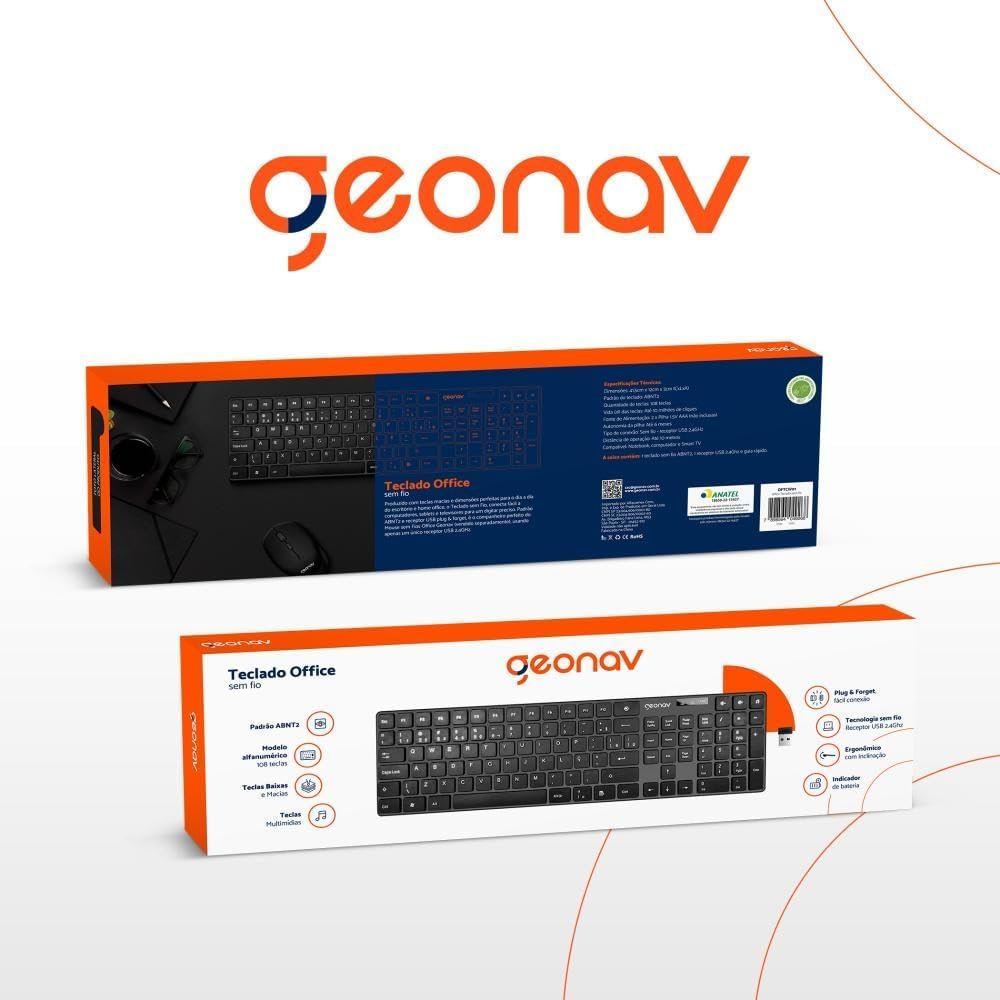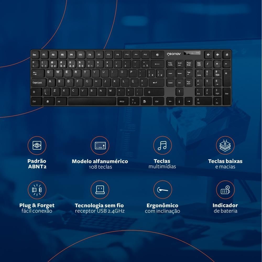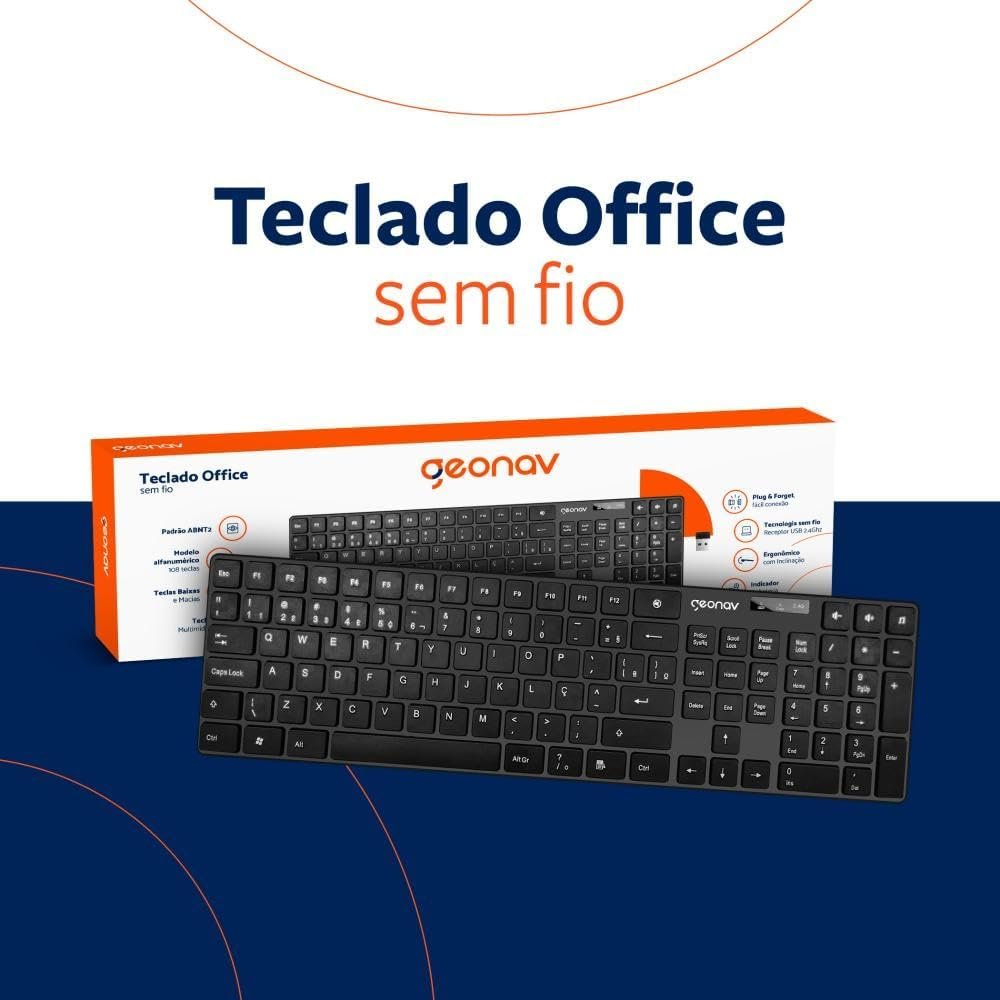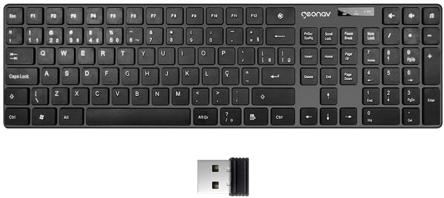 Geonav Teclado sem fio, 108 teclas, Alfanúmerico, Padrão ABNT2, Teclas baixas e macias, Ergonômico com inclinação, Indicador de bateria, OFTCW01, PretoGeonav Teclado sem fio, 108 teclas, Alfanúmerico, Padrão ABNT2, Teclas baixas e macias, Ergonômico com inclinação, Indicador de bateria, OFTCW01, Preto