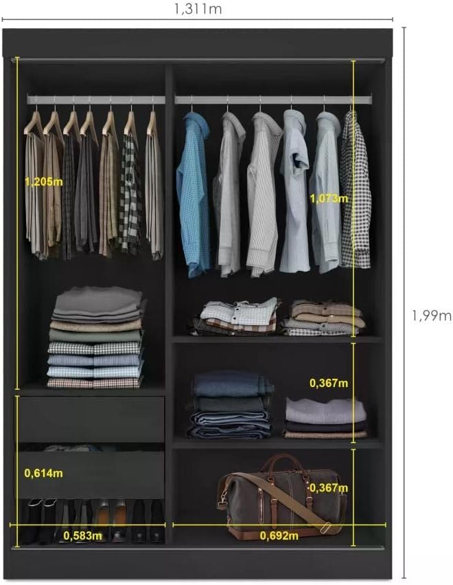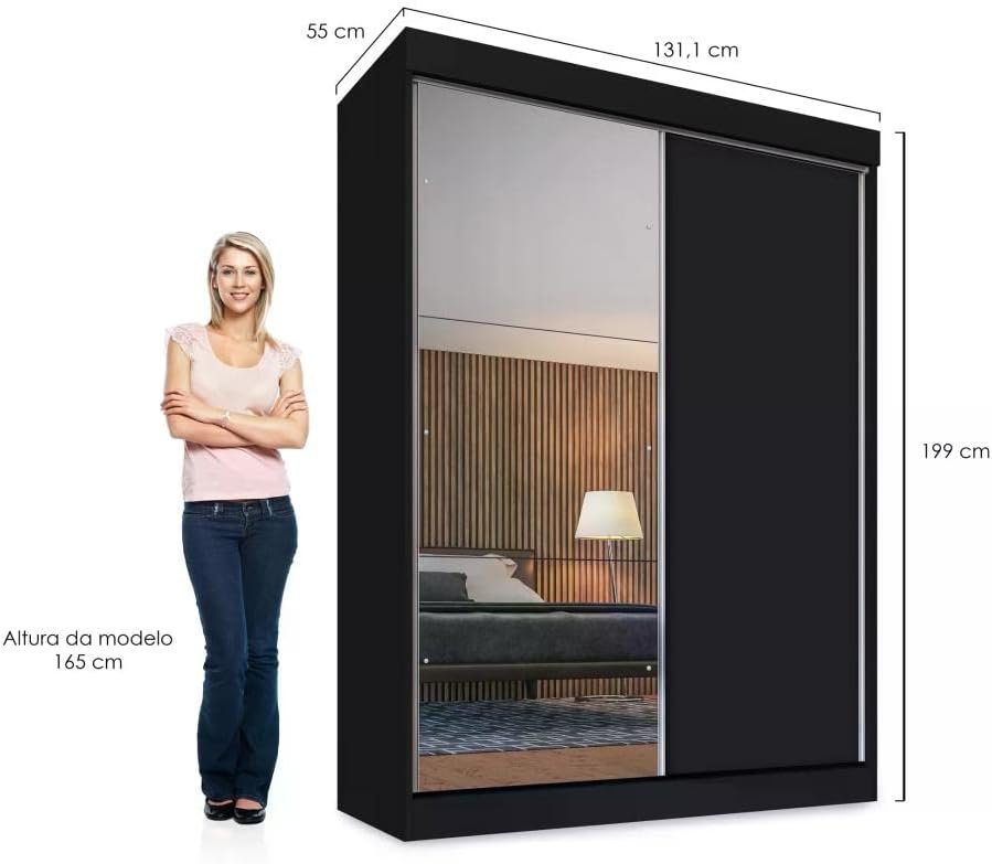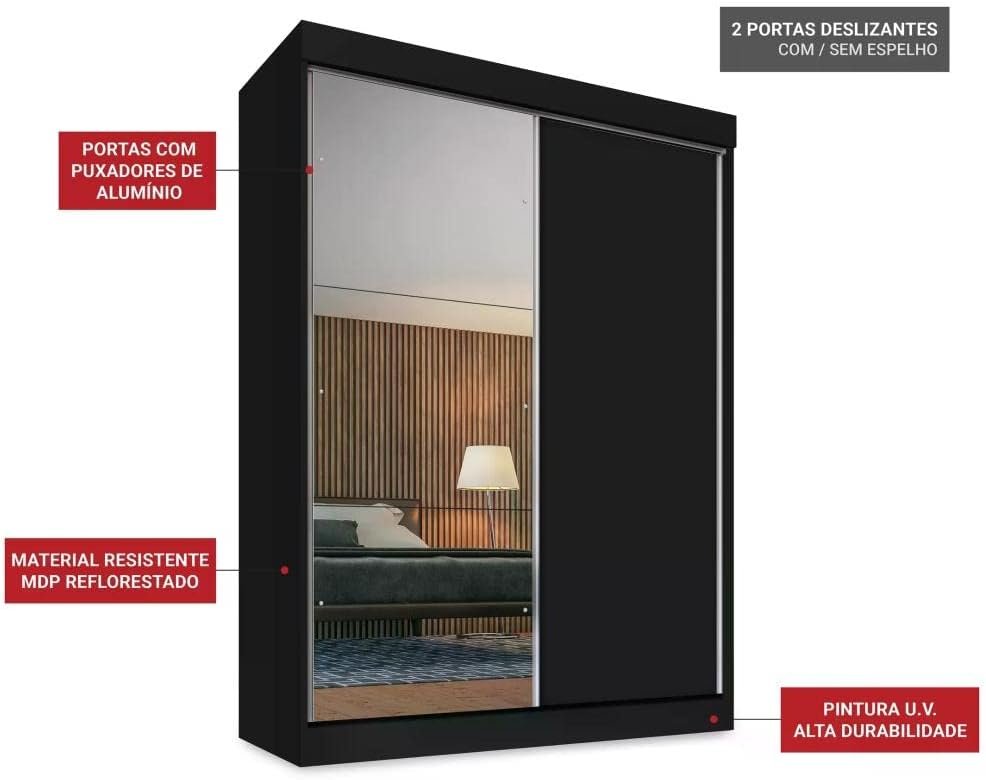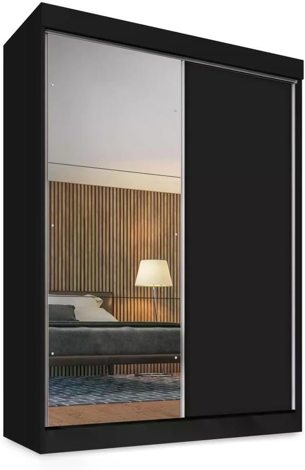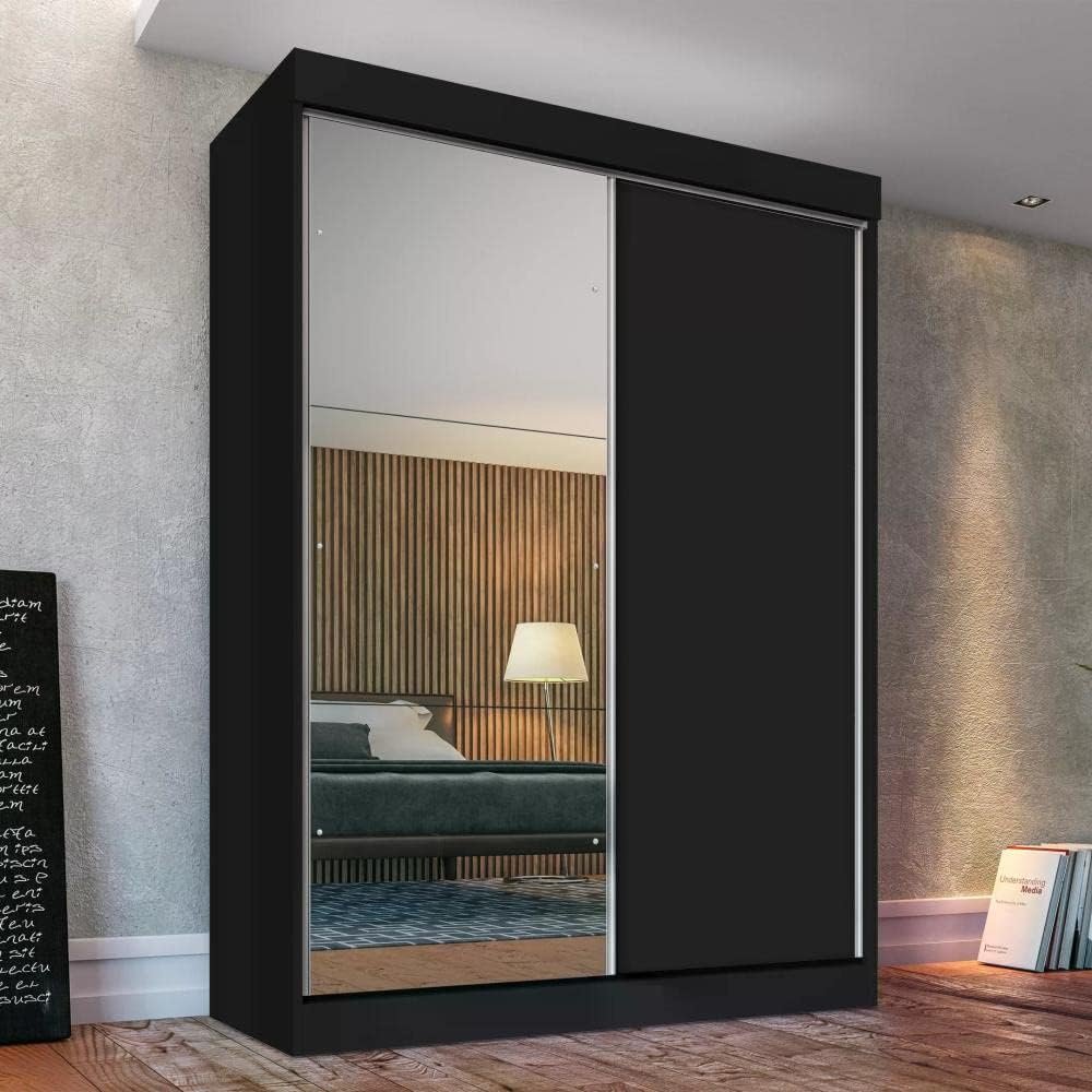 Guarda Roupa Solteiro 2 Portas de Correr 2 Gavetas e Espelho Peônia Yescasa Preto