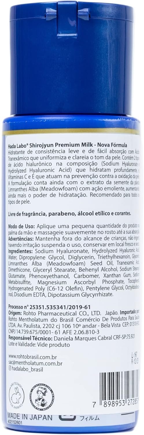Experimente o Hada Labo® Shirojyun Premium Milk, o hidratante facial clareador que vai revolucionar a sua rotina de cuidados com a pele. Enriquecido com Ácido Tranexâmico, este produto de 140ml vai proporcionar uma pele mais luminosa, uniforme e radiante. Sinta a diferença desde a primeira aplicação!