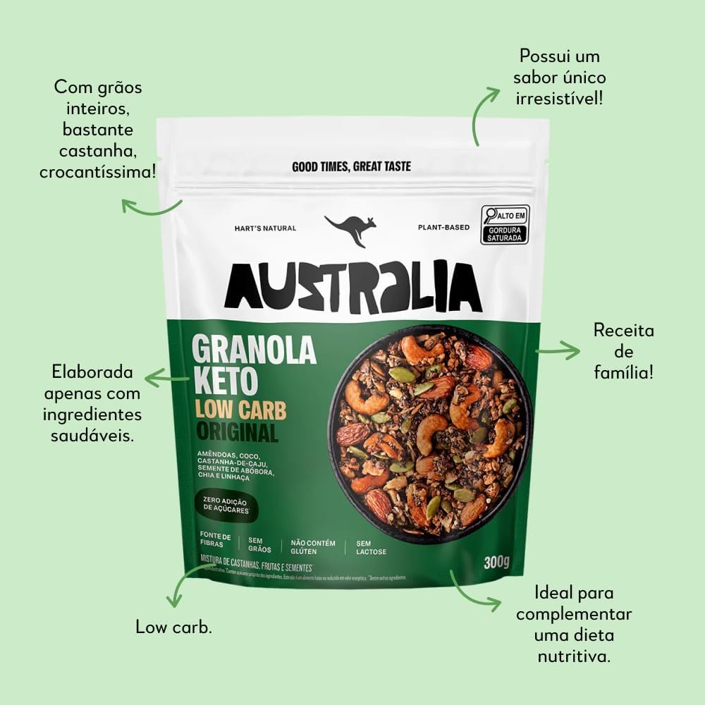 Experimente a Hart’s Natural Granola Australia Keto Low Carb! Feita com ingredientes de alta qualidade, esta granola é a opção perfeita para quem busca uma alimentação saudável e equilibrada. Sem açúcar, sem lactose, sem glúten e vegana, essa granola é 100% natural e rica em fibras. Desfrute de um snack saudável e delicioso a qualquer hora do dia. Embalagem de 300g.