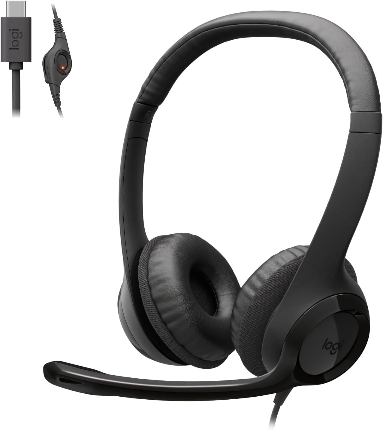 Headset com fio USB-C Logitech H390 com Controles de Áudio Integrado, Microfone flip-to-mute com Redução de Ruído, Almofadas Confortáveis e Design Sustentável. – Preto
