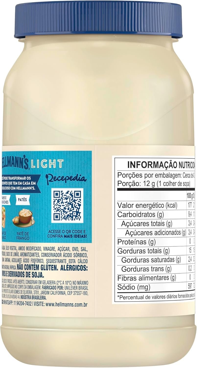 Descrição: Desfrute de toda a cremosidade e sabor irresistível da Maionese Hellmann’s Light, agora com menos calorias. Ideal para quem busca uma opção mais saudável sem abrir mão do delicioso sabor. Experimente agora e se surpreenda!