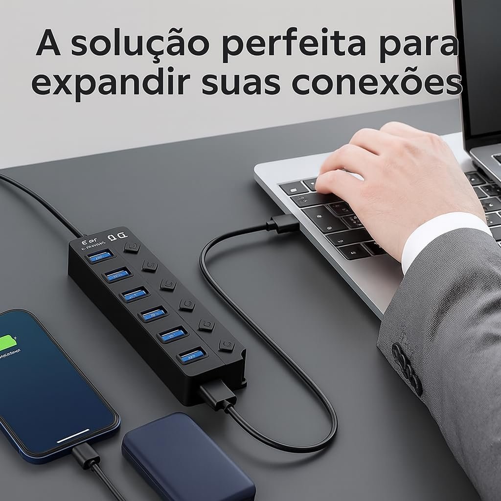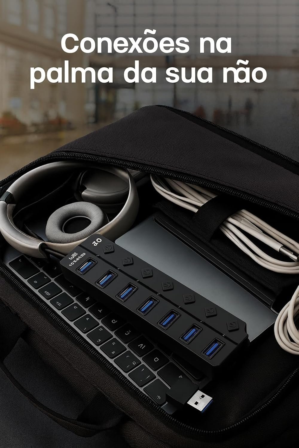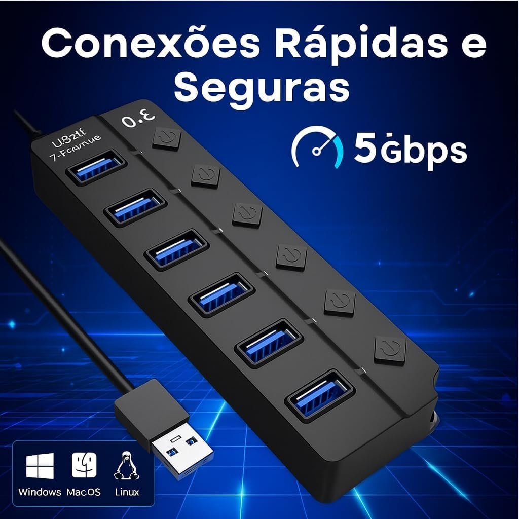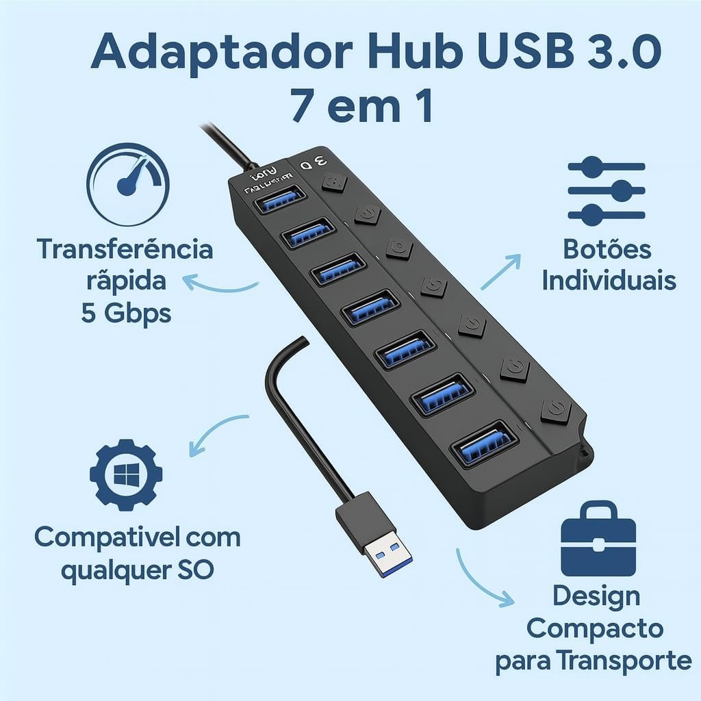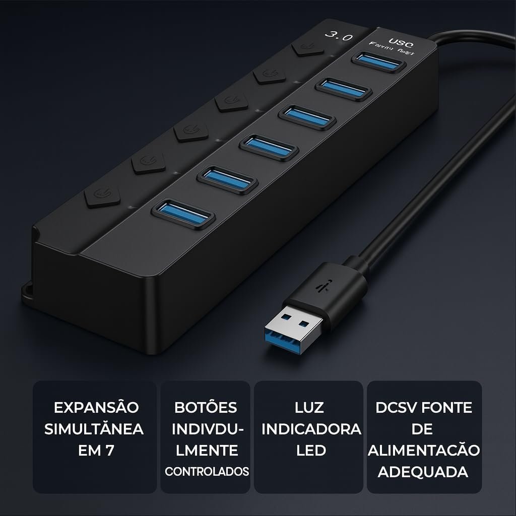 Hub USB 3.0 Com 7 Portas, Botões Individuais, LED, Alta Velocidade (5Gbps) Compatível Com PC Notebook TV Console Mouse PenDrive Teclado Impressora Acabamento Linha Premium