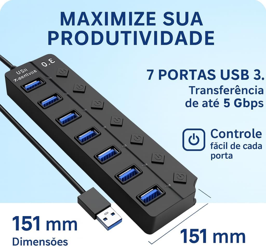 Seja o primeiro a avaliar “Hub USB 3.0 Com 7 Portas, Botões Individuais, LED, Alta Velocidade (5Gbps) Compatível Com PC Notebook TV Console Mouse PenDrive Teclado Impressora Acabamento Linha Premium”