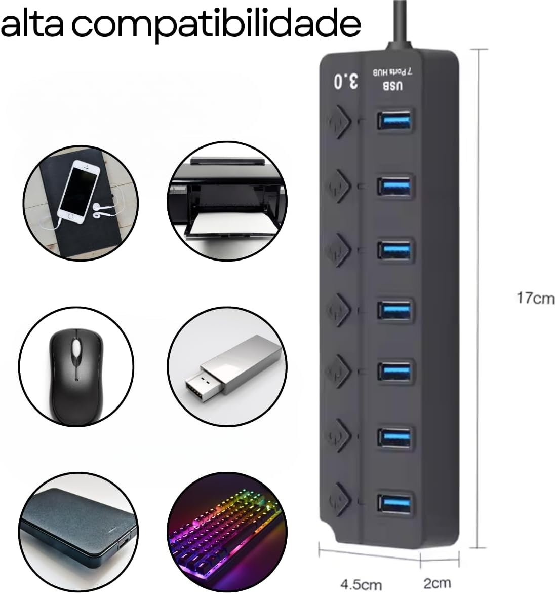 Compatível com uma ampla gama de dispositivos, desde mouse, pen drive, teclado, impressora e muito mais, este hub oferece um acabamento premium que combina com seu estilo e necessidades tecnológicas. Simplifique sua vida digital com este hub USB versátil e confiável.