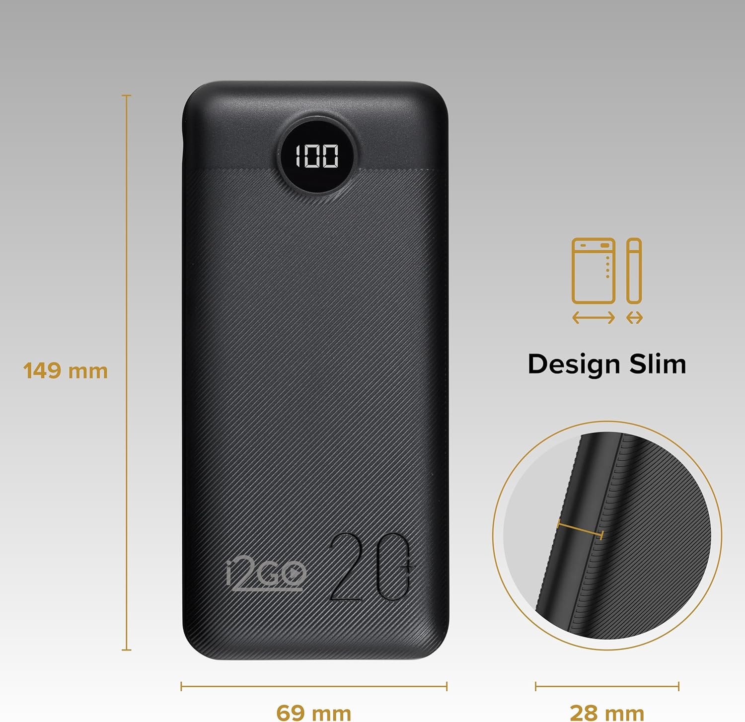 I2GO, Carregador Portátil (Power Bank) Ultra Rápido 20000mAh, Power Delivery 20W, 2 Saídas USB + 1 Saída/Entrada USB-C, Preto, i2GO PRO