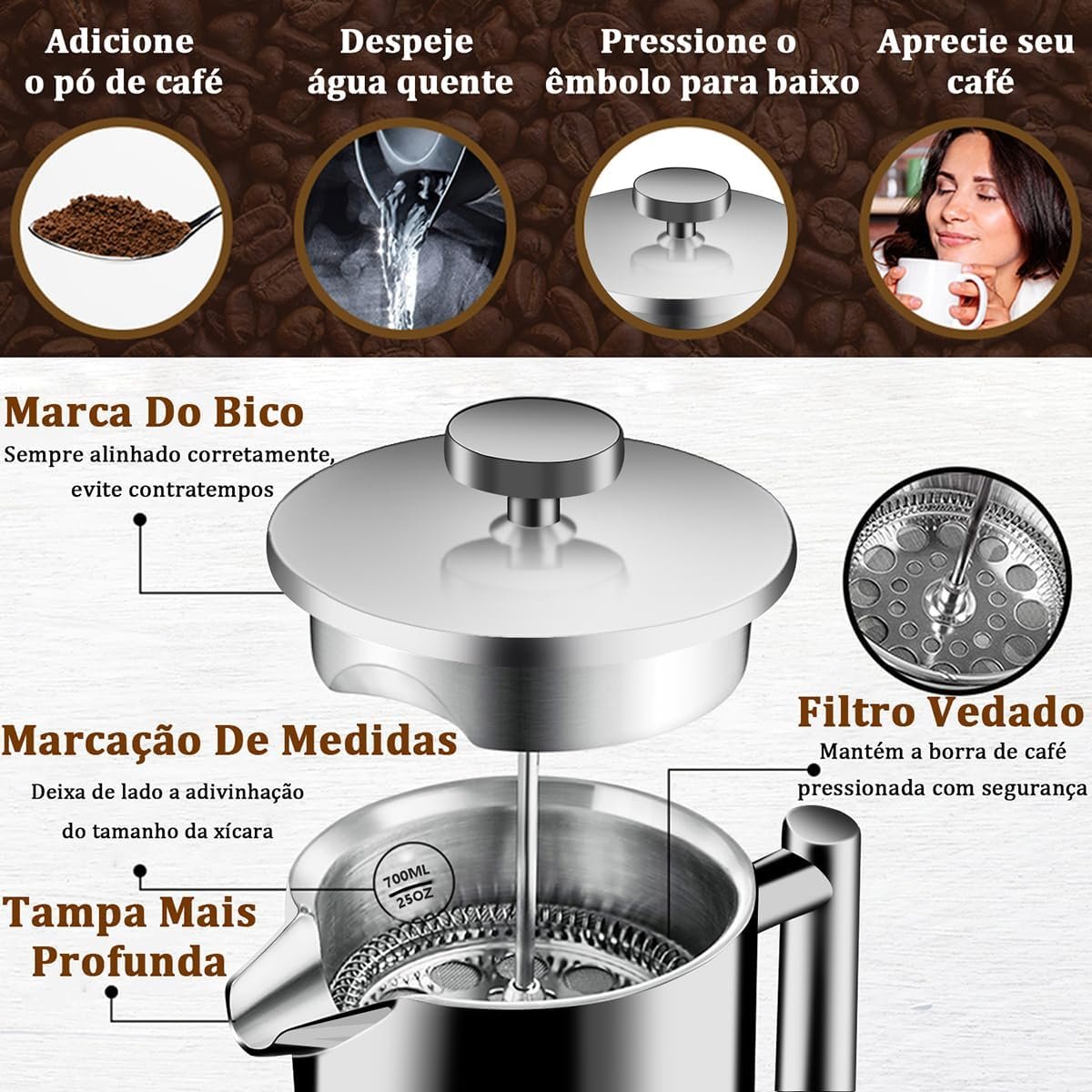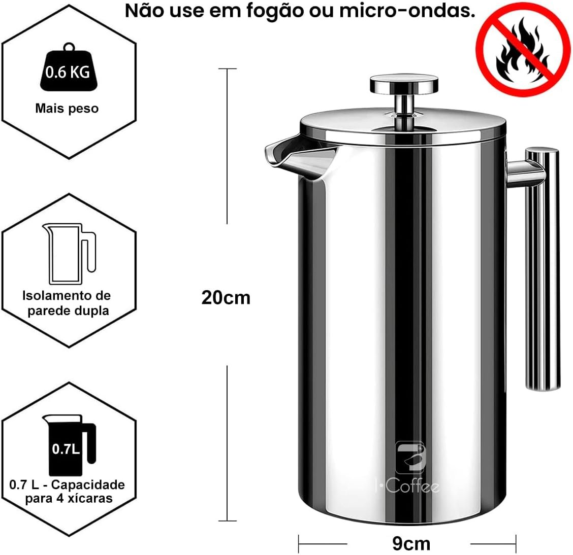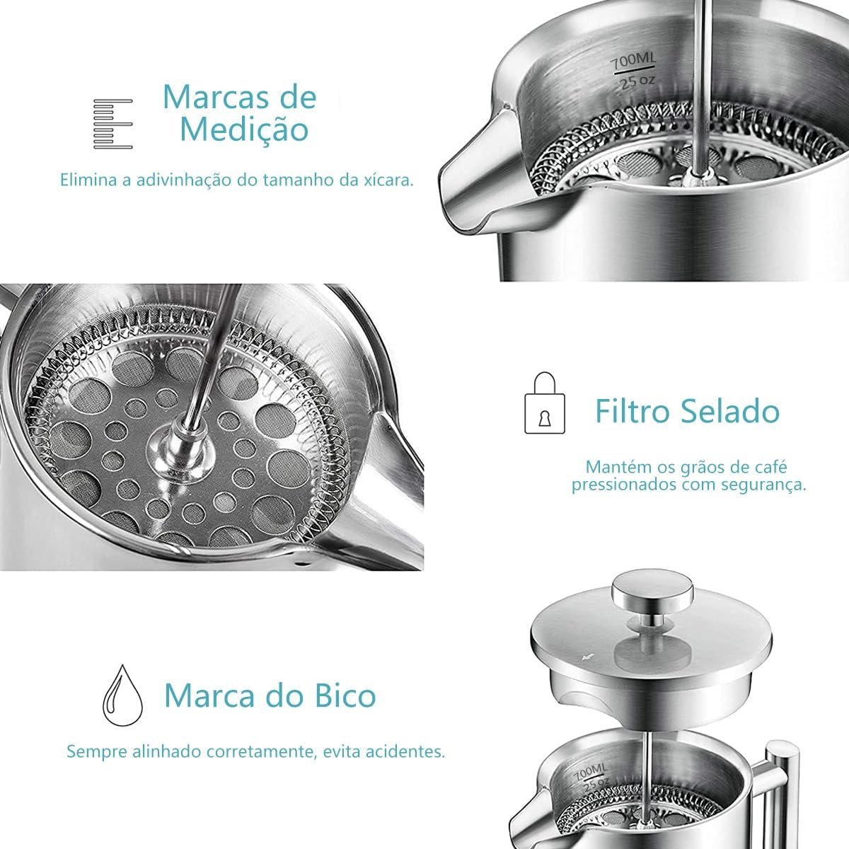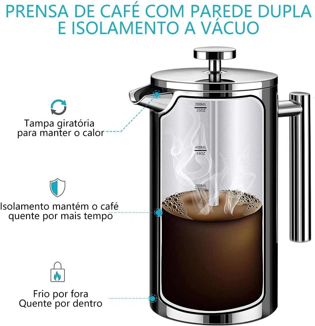 iCoffee 700 mL Cafeteira Prensa Francesacom Filtro de 4 Estágios e Isolamento Duplo, Cafeteira de Aço Inoxidável