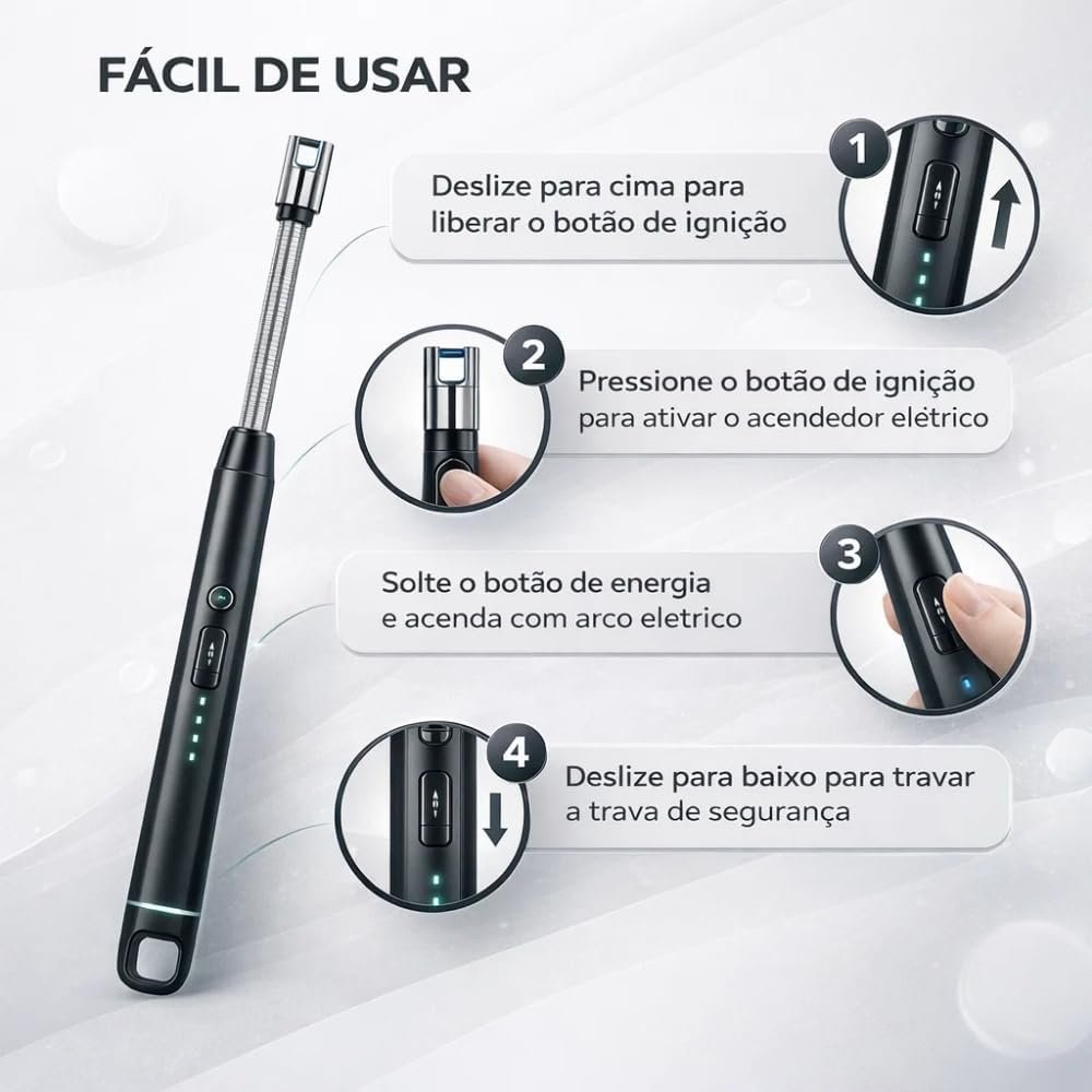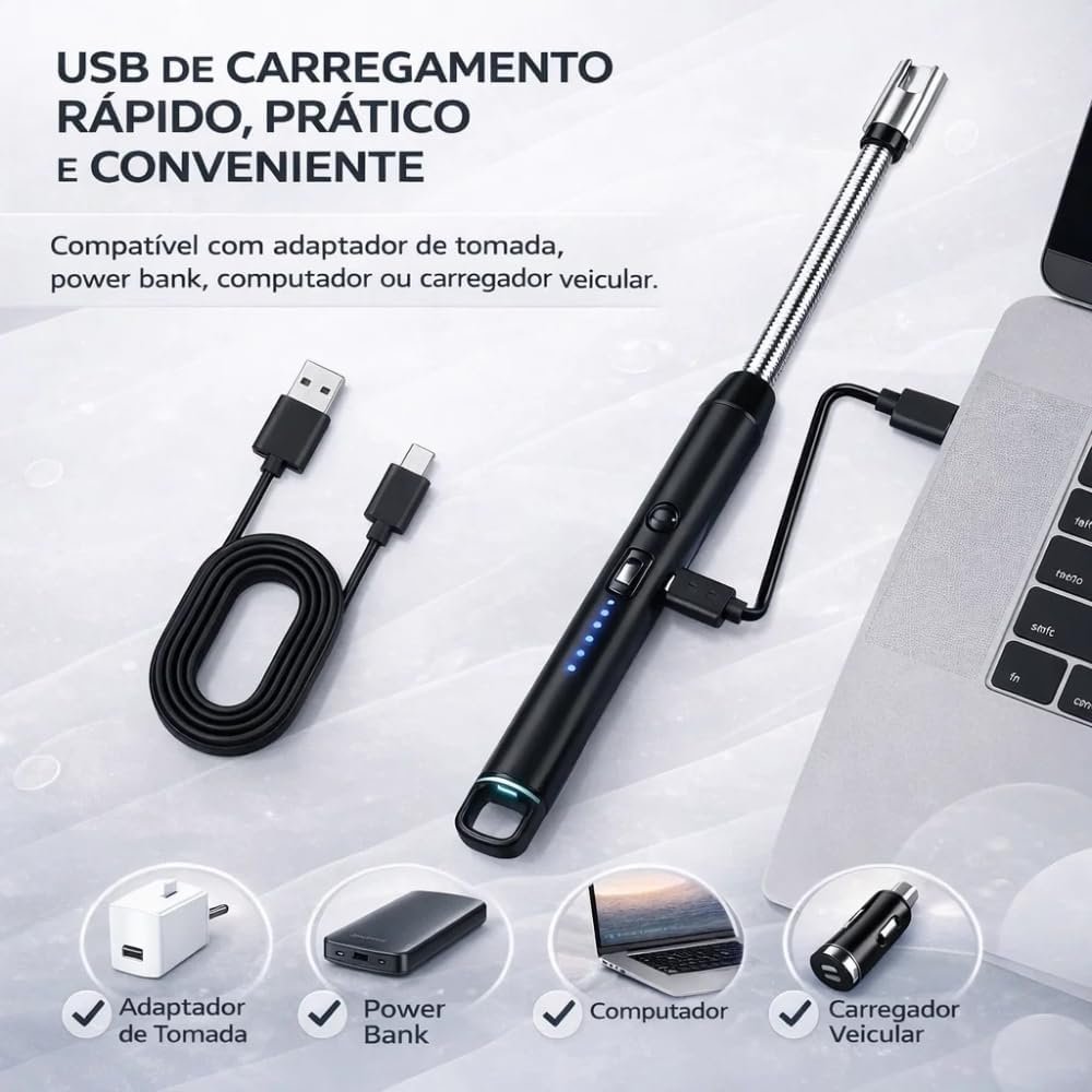 Isqueiro Elétrico Recarregável USB Sem Chama com Ponta Flexível 360° – Acendedor Antivento Seguro e Ecológico para Fogão, Velas, Churrasqueira, Camping e Lareira (Cores Sortidas)