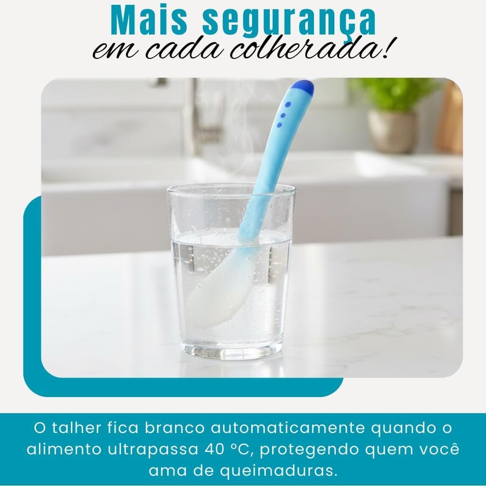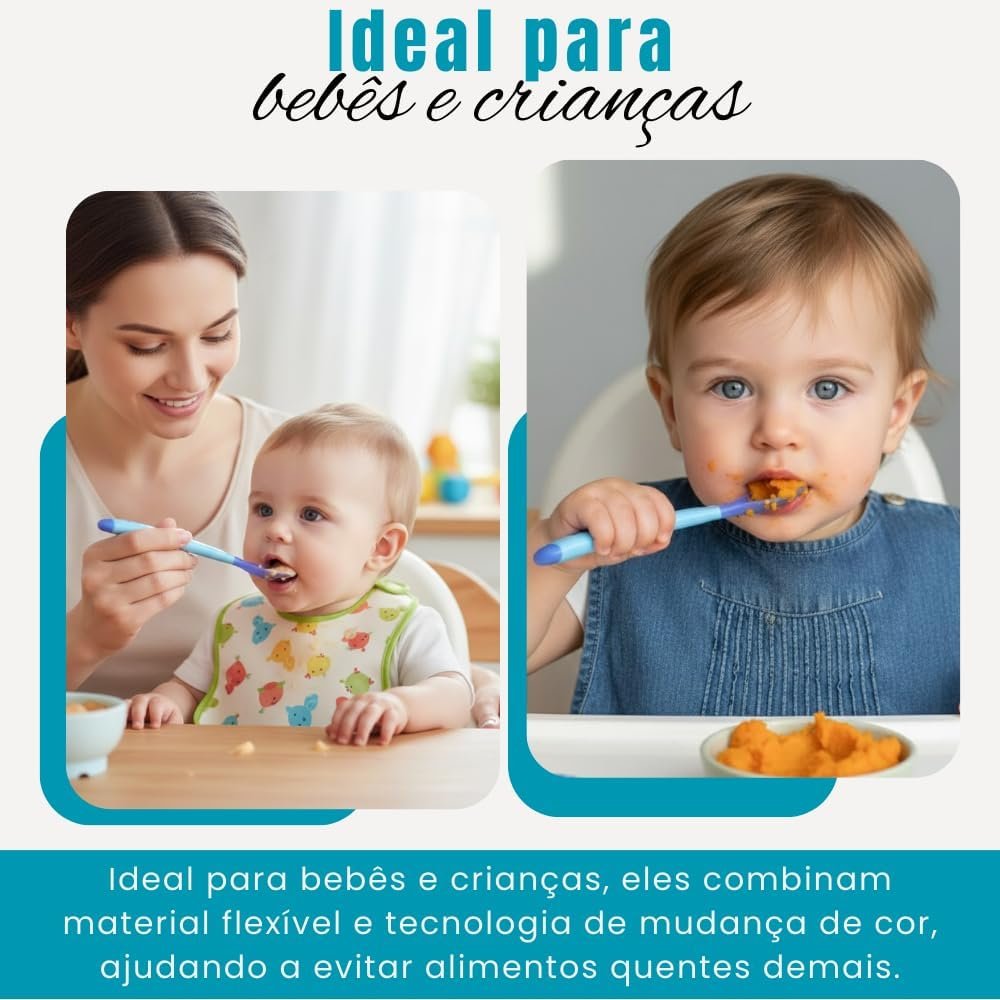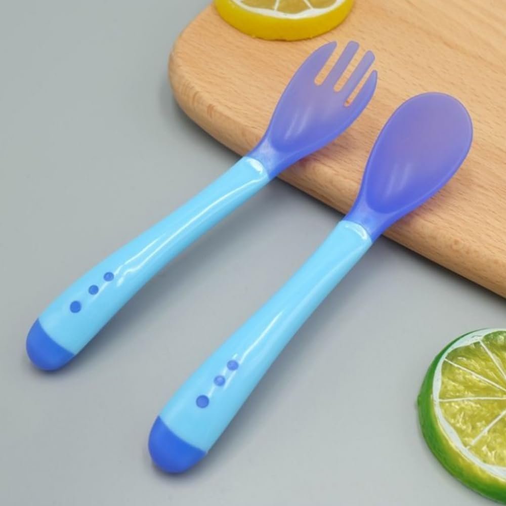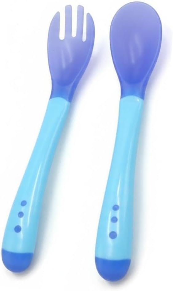 Jogo Colher e Garfo Infantil Termossensível para Bebê – Talheres Infantis de Silicone que Muda de Cor com a Temperatura, Kit Introdução Alimentar Segura – Shop100 (Azul)