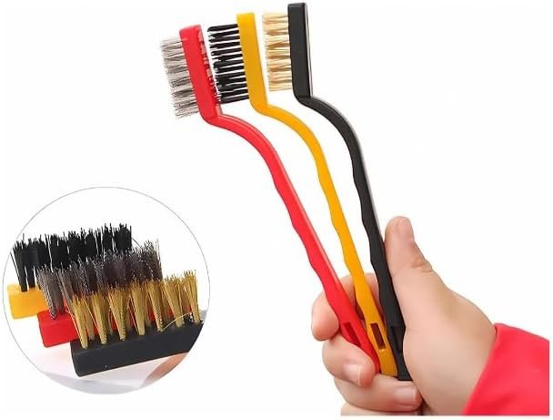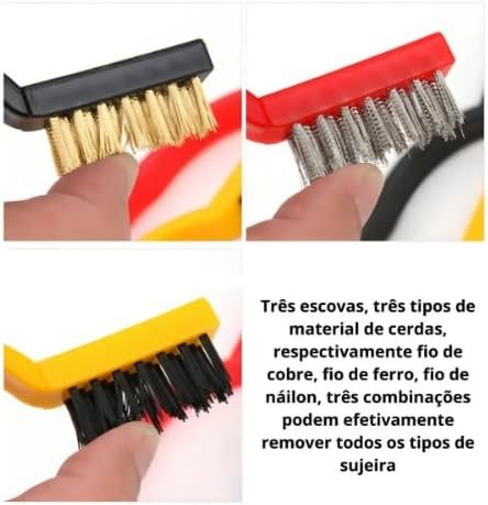 Título do Produto: Jogo de Escovas para Limpeza, Kit com 3 Peças, Nylon, Metal e Aço, com Cabo Plástico