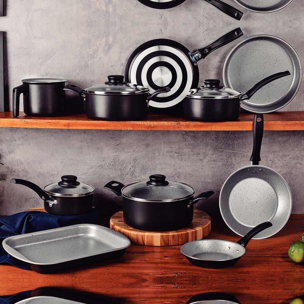 Prepare suas refeições com praticidade e sofisticação com o Jogo de Panelas Tramontina Turim. Com 10 peças em alumínio com revestimento interno e externo em antiaderente Starflon Max na cor preta, você terá panelas resistentes e fáceis de limpar. A tecnologia antiaderente evita que os alimentos grudem, garantindo um cozimento uniforme e saudável. Além disso, as panelas possuem cabos ergonômicos que proporcionam mais segurança e conforto ao cozinhar. Renove sua cozinha com qualidade e estilo!