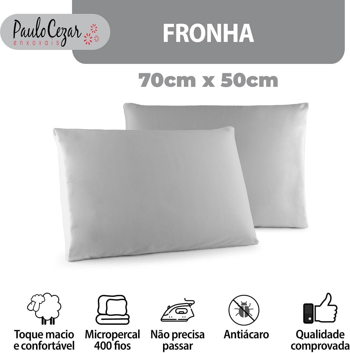 Kit 02 Fronhas Classic Tecido Percal 400 Fios 70×50 cm Antiácaro, Anti-pilling com Toque Macio – Cinza