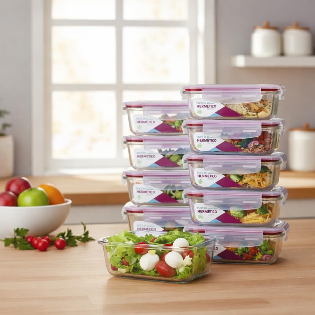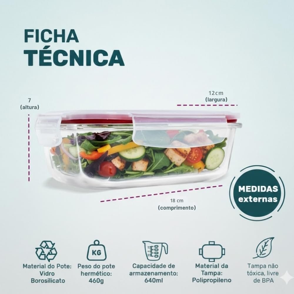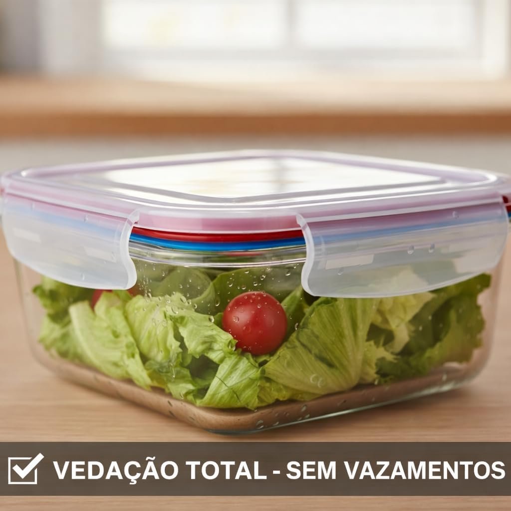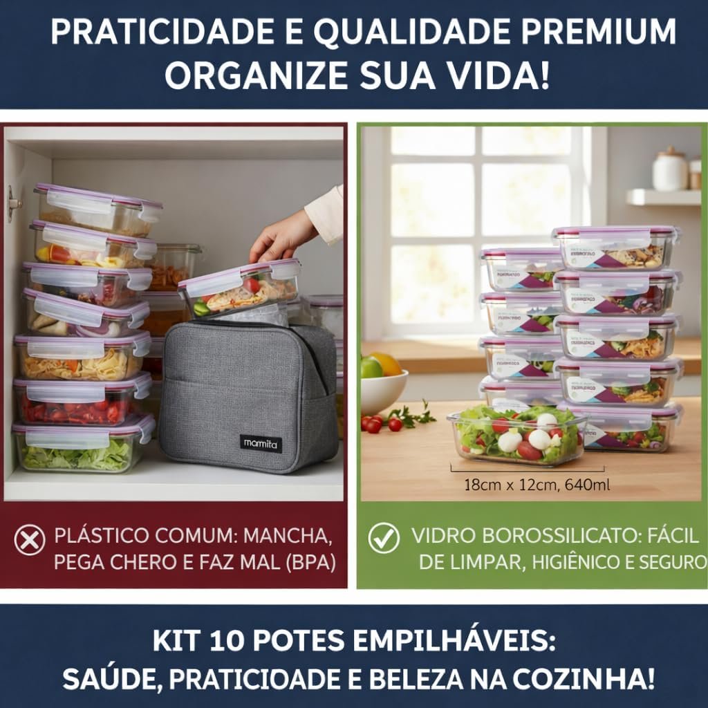 Kit 10 Potes de Vidro 640 ML Borossilicato Retangular com Tampa Hermética 4 Travas Marmita Premium Empilhável Freezer Micro-ondas Sem Tampa Organização Geladeira Cozinha Resistente