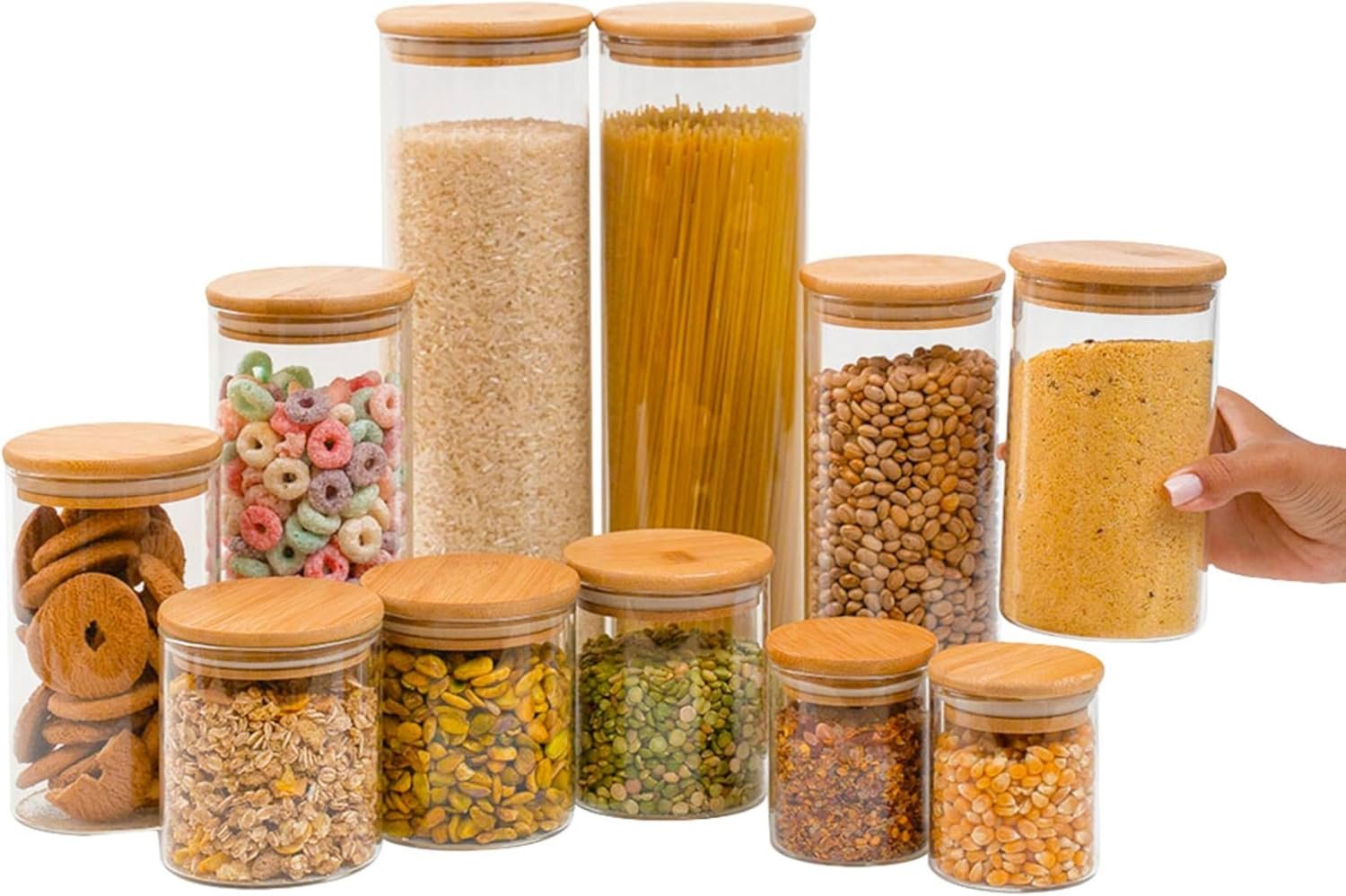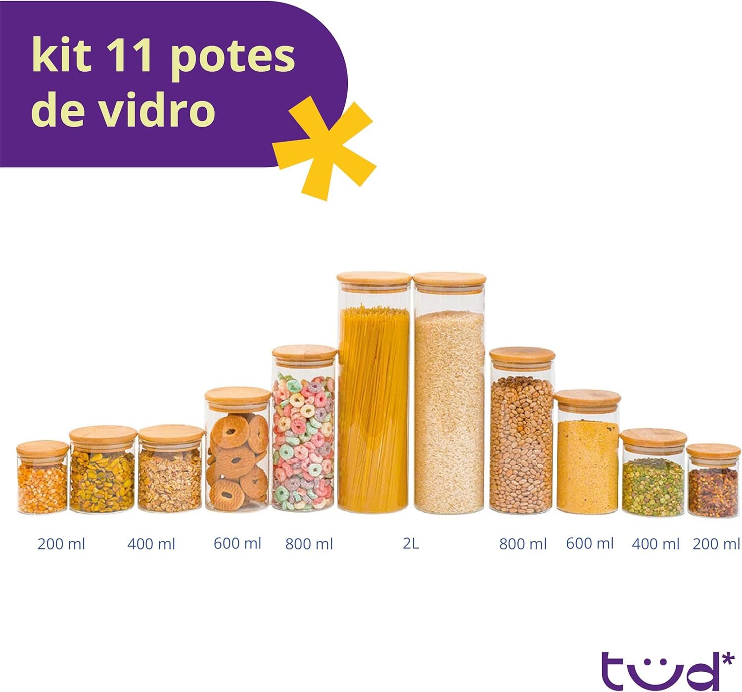 Kit 11 potes de vidro com tampa de bambu herméticos redondos – Tüd