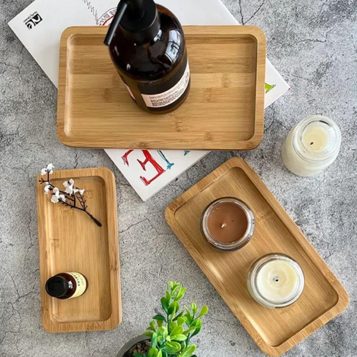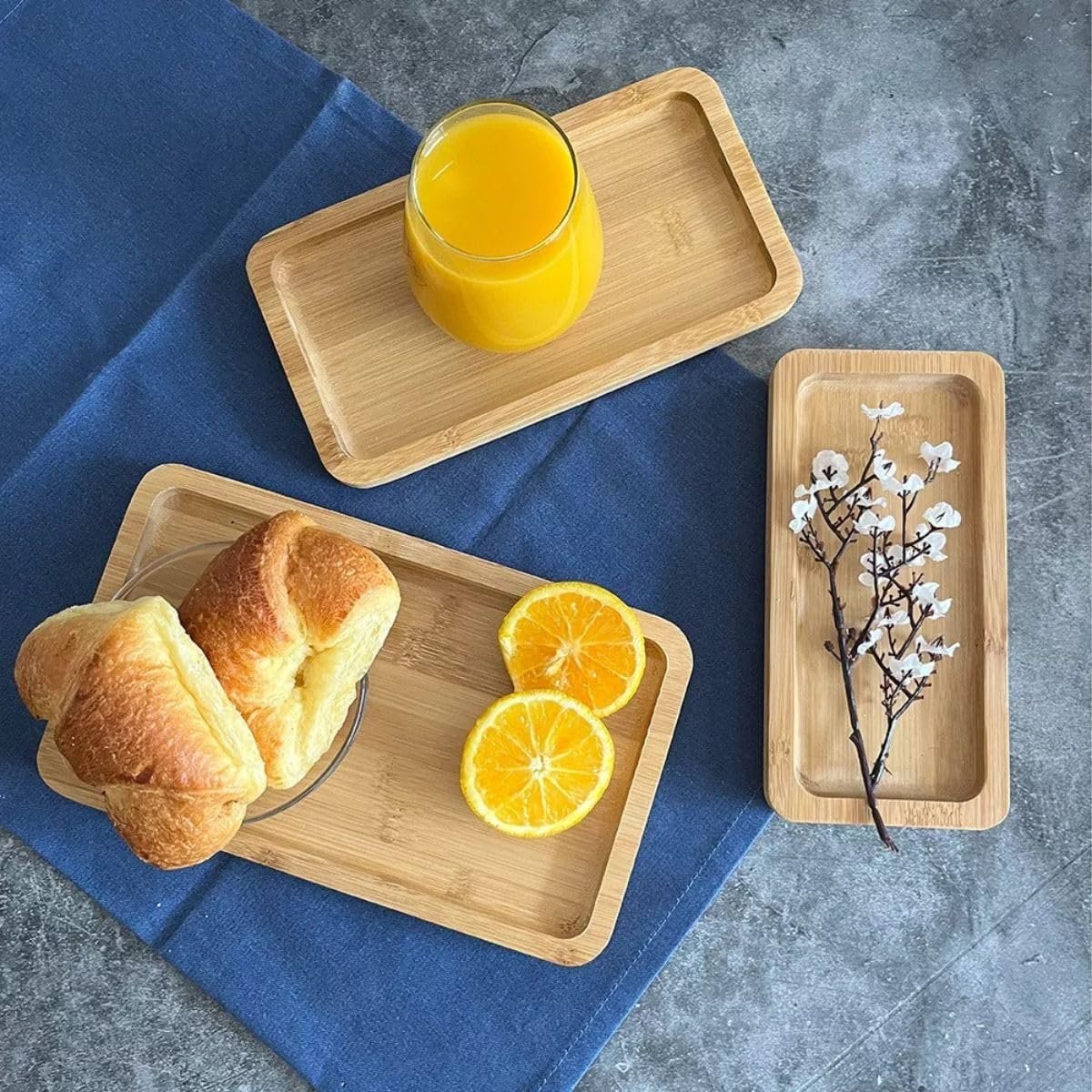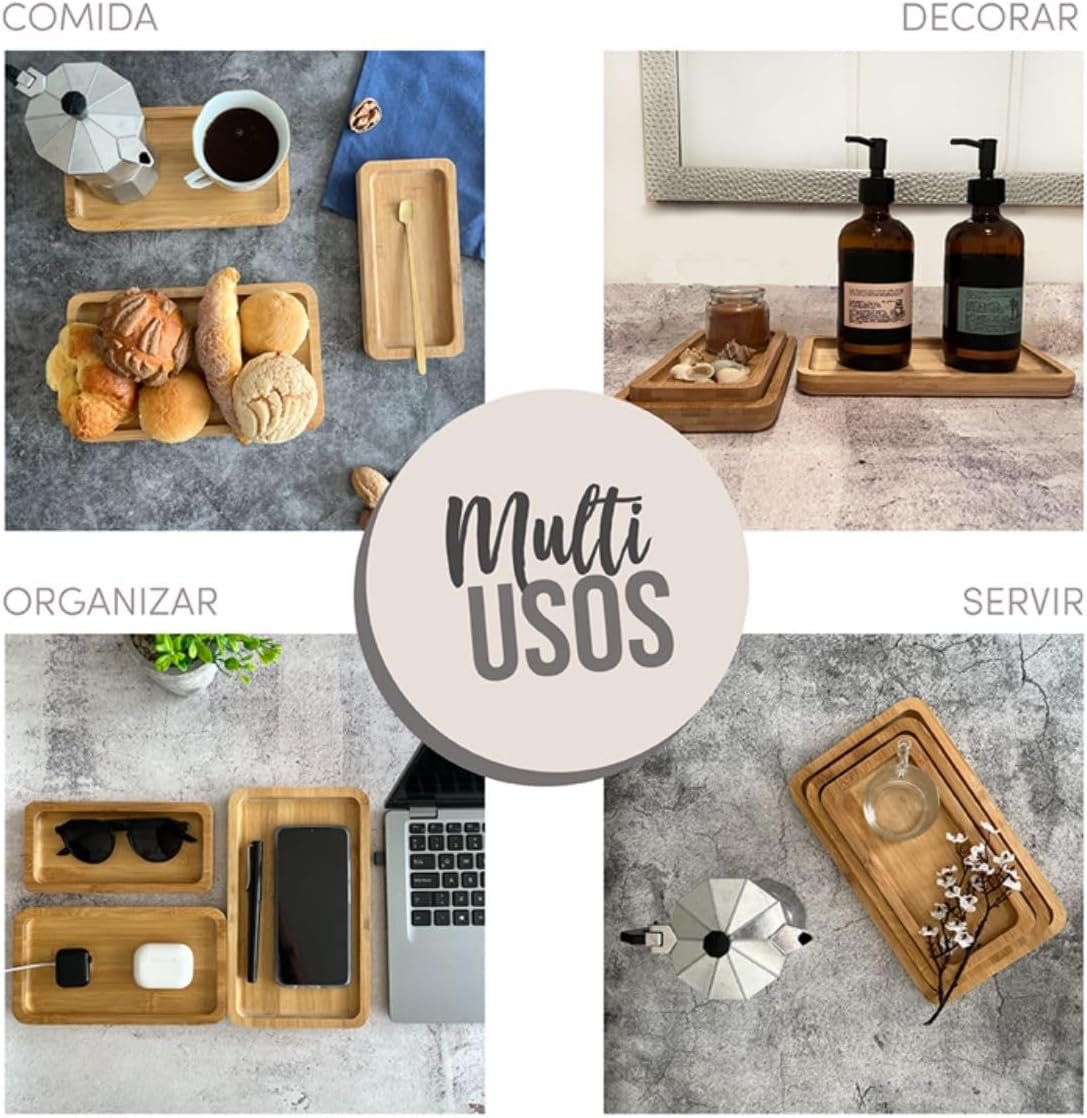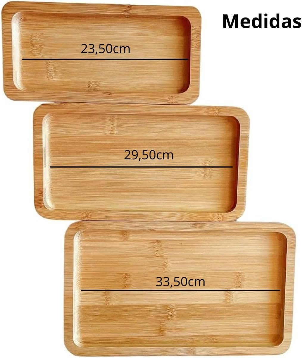Kit 3 Bandejas de Bambu Marrom Natural Retangular para Cozinha 22cm 27cm e 32Cm Produto Premium