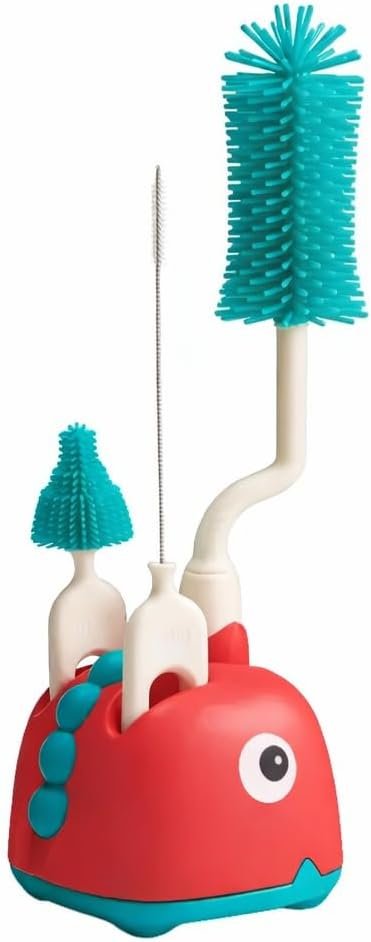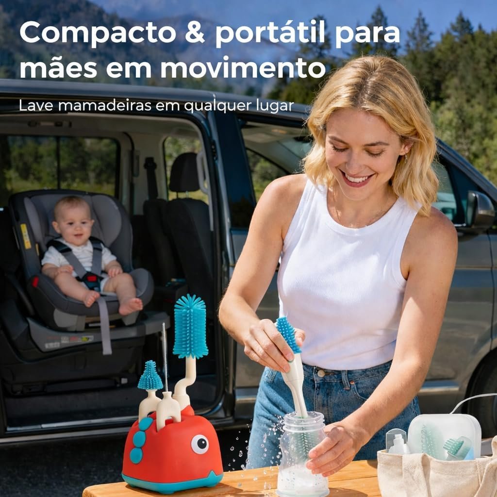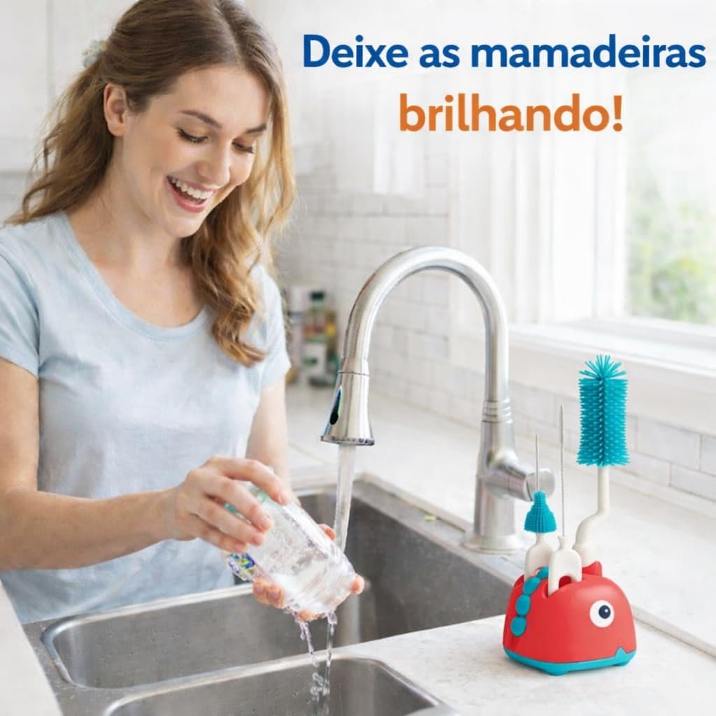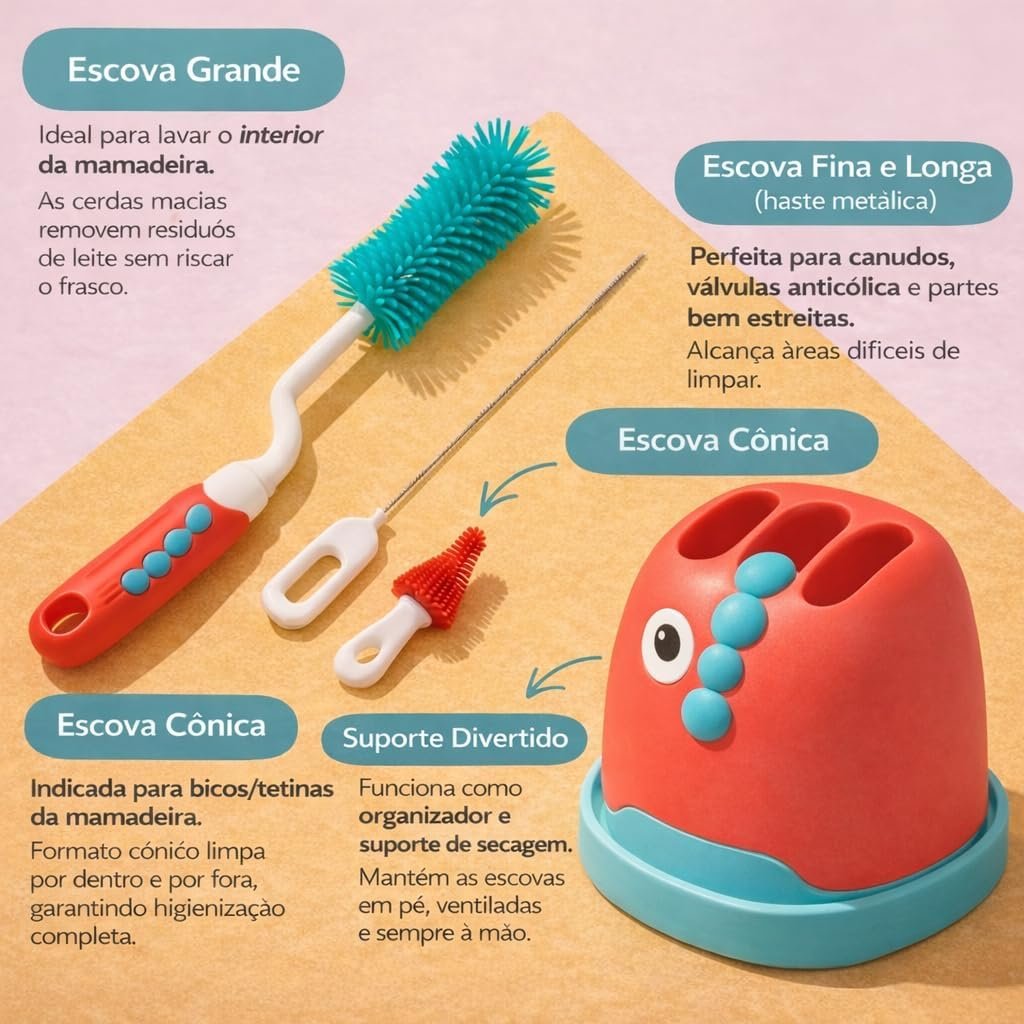 Kit 3 Escovas de Limpeza para Mamadeira, Bico e Canudos Mais Suporte Organizador de Silicone com Drenagem (Suporte Vermelho com Escova Azul)