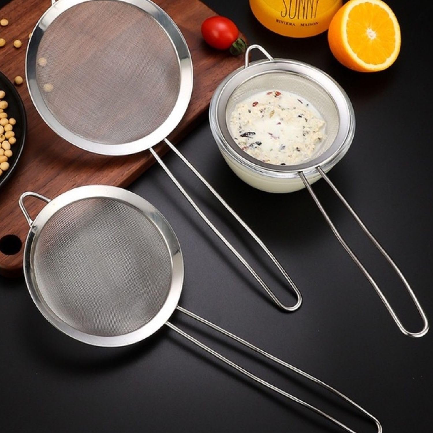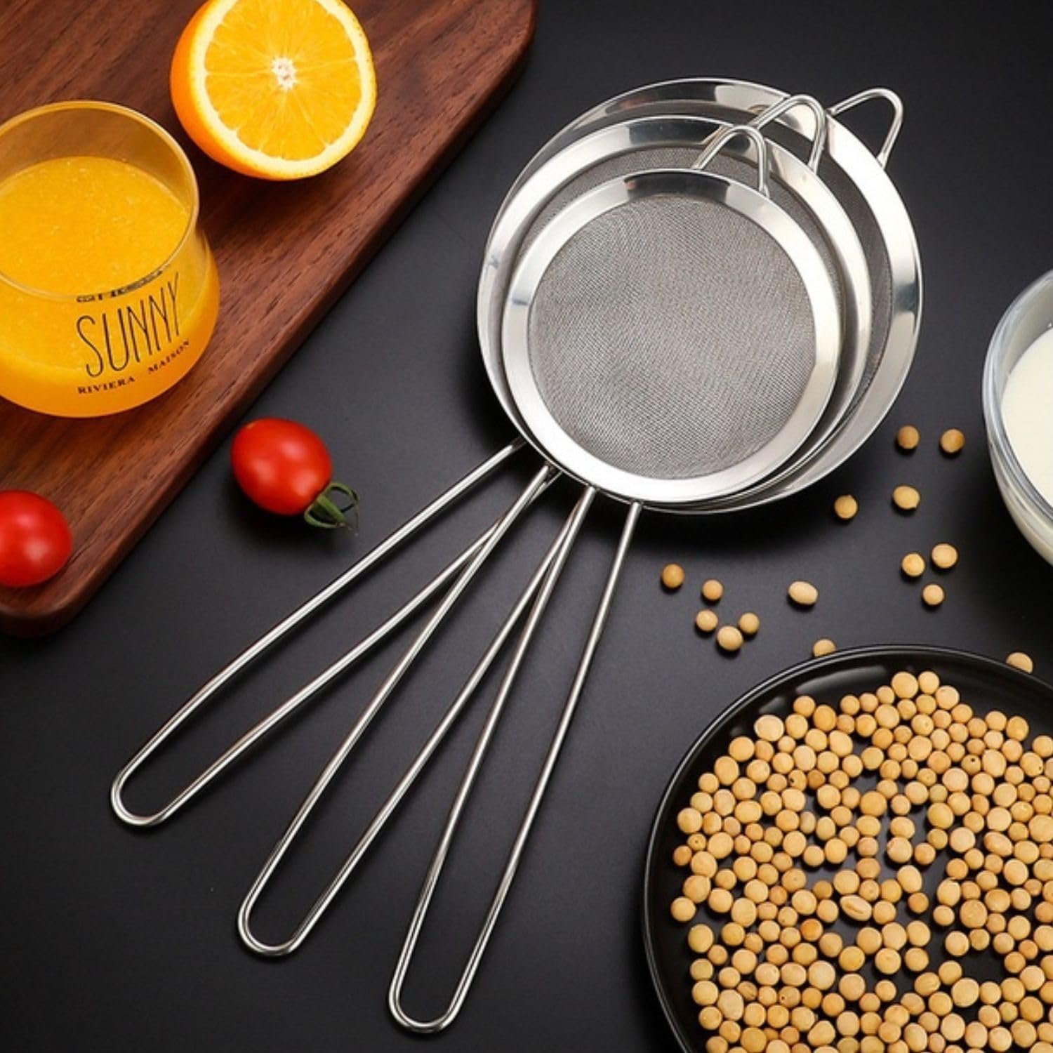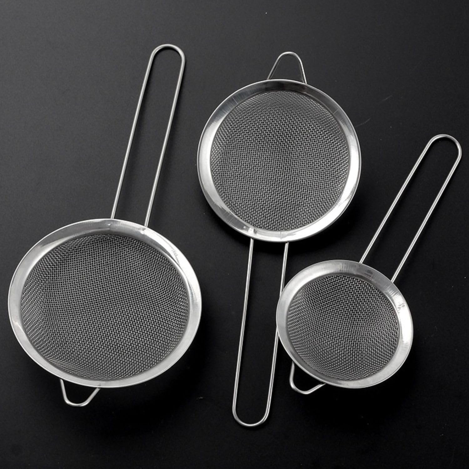 Kit 3 Peneiras de Cozinha Inox com Alça – Tamanhos 8cm, 10cm e 12cm – Para Coar, Peneirar e Lavar Alimentos – Resistente e Fácil de Limpar