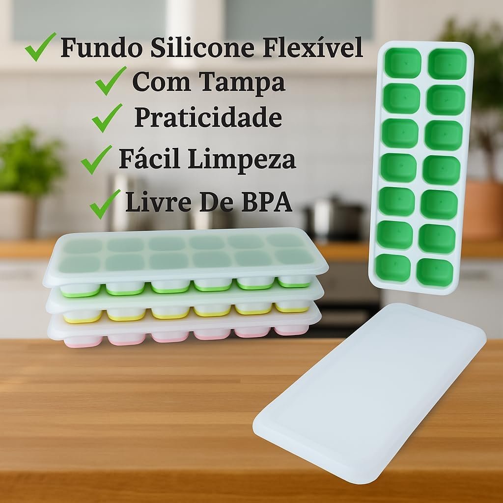 Kit 4 Formas Premium de Gelo com Tampa Silicone Flexível Multiuso Papinha Bebê Drinks Whisky Frutas Molhos Antiodor Livre BPA Freezer Desenforma Fácil Cozinha Organizada Reutilizável DurávelKit 4 Formas Premium de Gelo com Tampa Silicone Flexível Multiuso Papinha Bebê Drinks Whisky Frutas Molhos Antiodor Livre BPA Freezer Desenforma Fácil Cozinha Organizada Reutilizável Durável