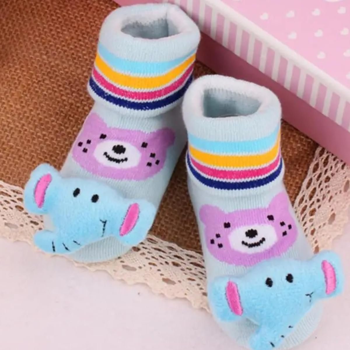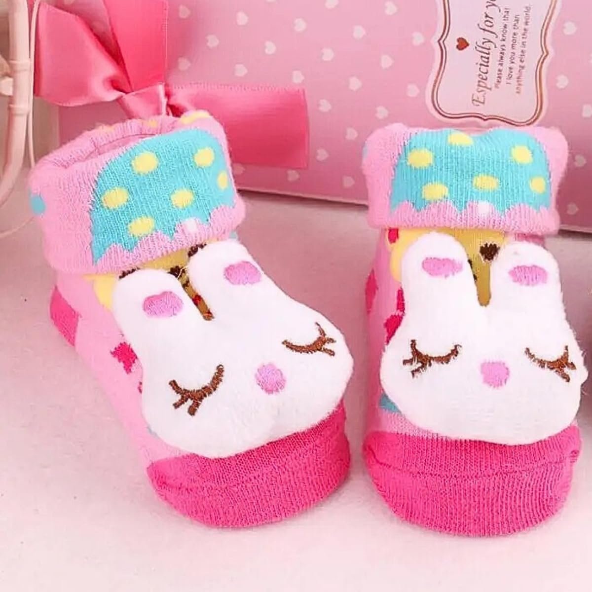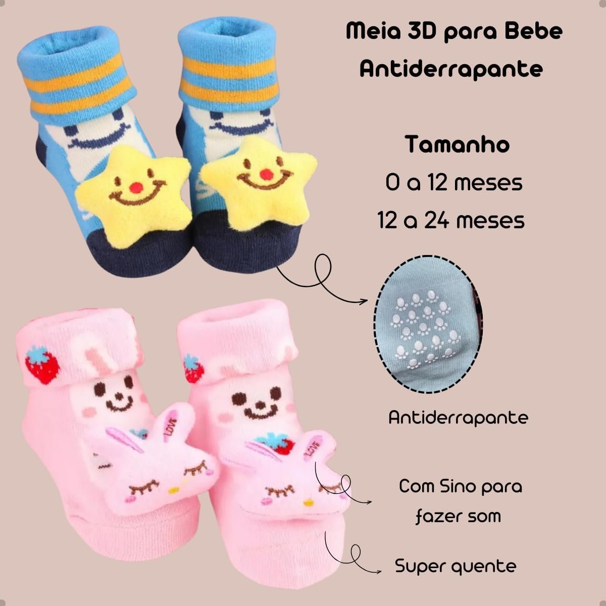 Kit 4 Pares Meias Bebê com Chocalho Pelúcia 3D Algodão Menino Menina Conforto Respirável 0 a 24 Meses Uso Diário