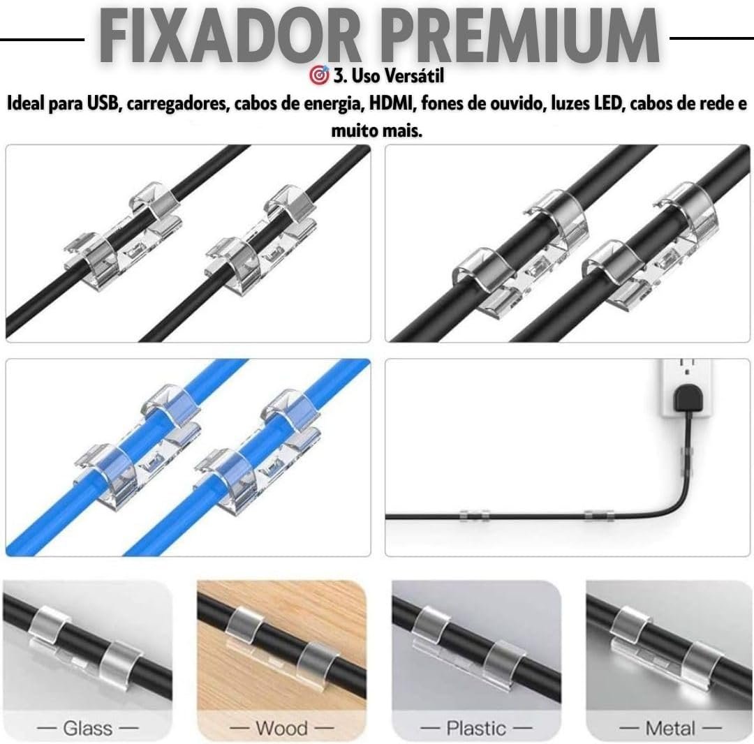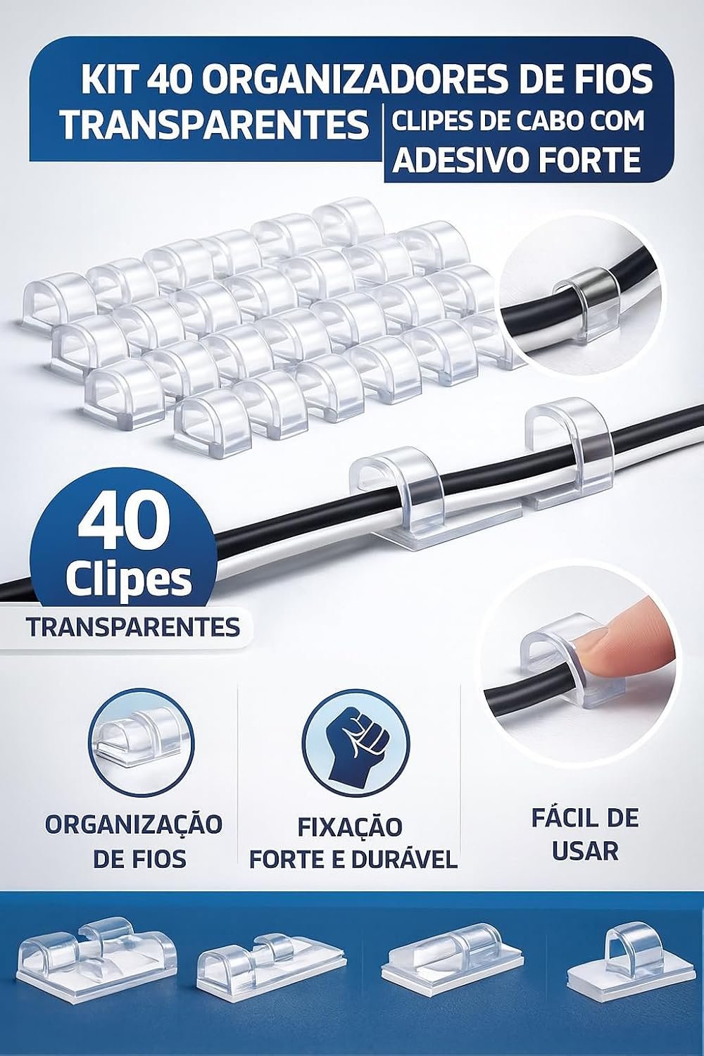 Kit 40 Organizadores de Fios Transparentes – Clipes de Cabo com Adesivo Forte, Suporte de Arame Autoadesivo para Carro, Casa e Escritório – Fixação Resistente para CabosKit 40 Organizadores de Fios Transparentes – Clipes de Cabo com Adesivo Forte, Suporte de Arame Autoadesivo para Carro, Casa e Escritório – Fixação Resistente para Cabos