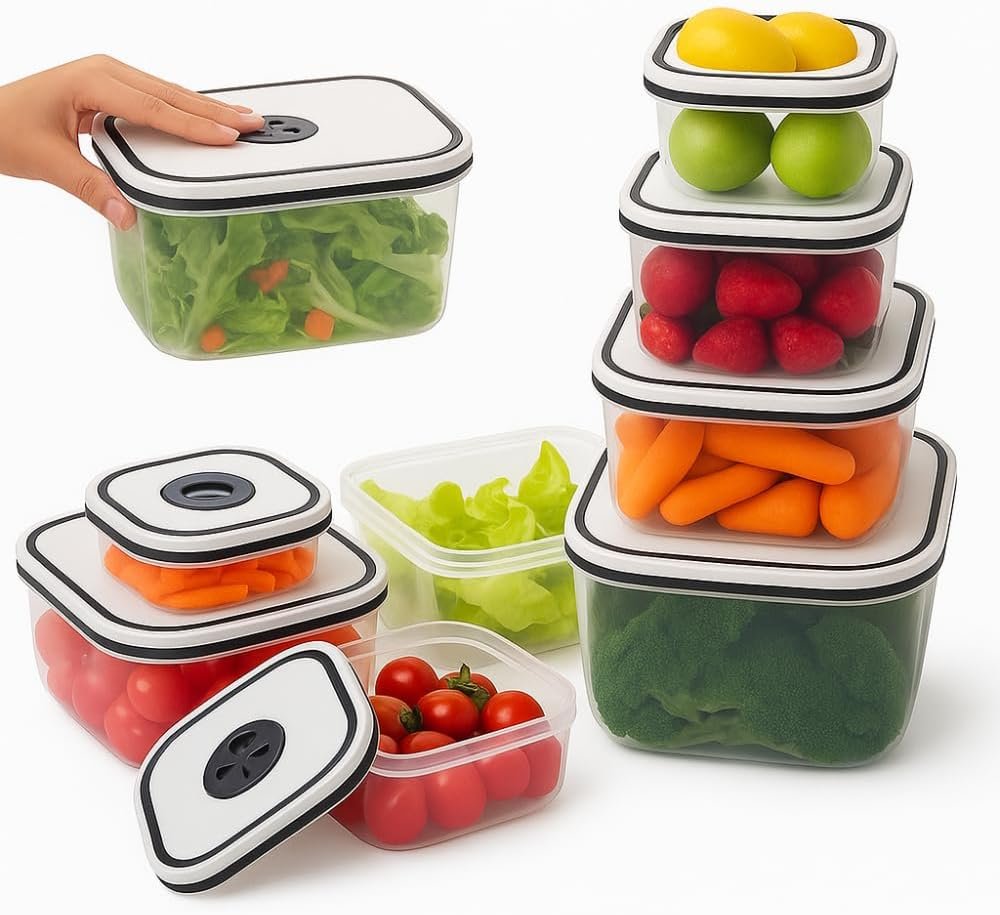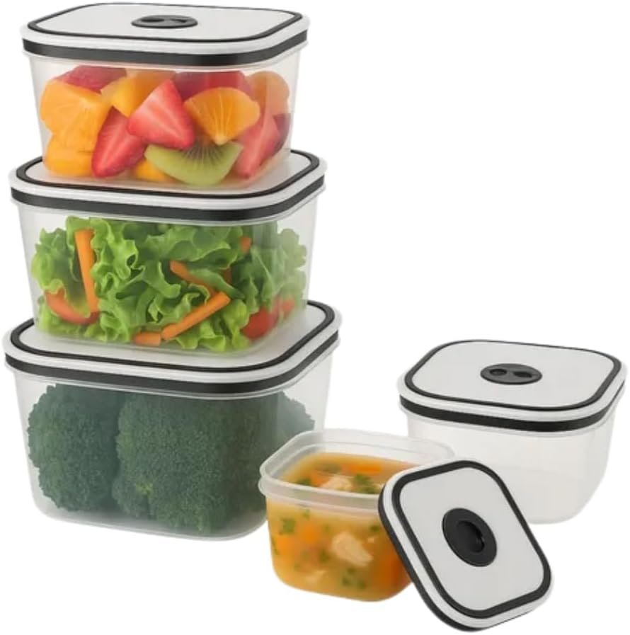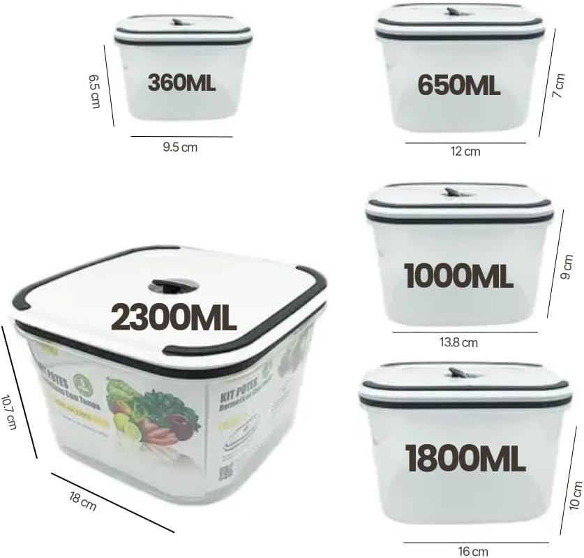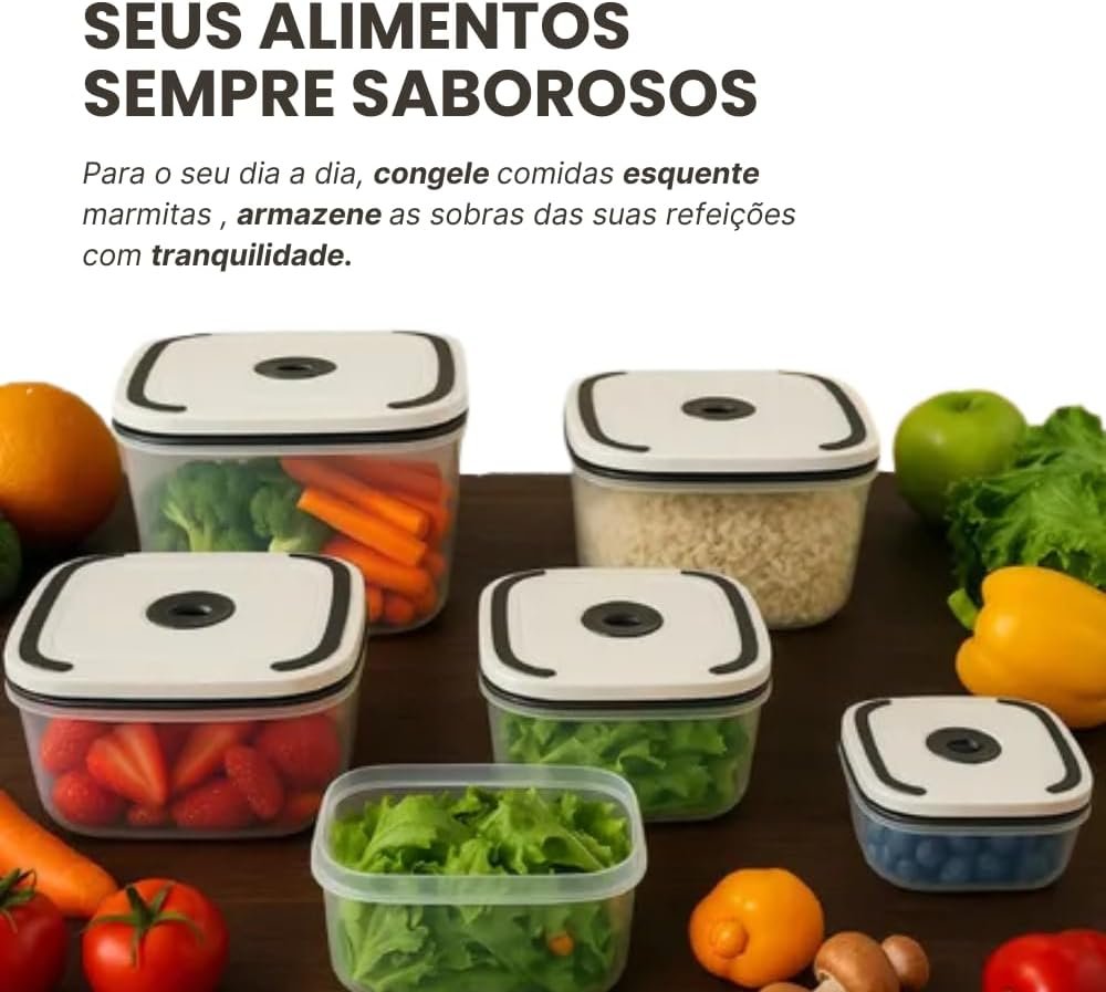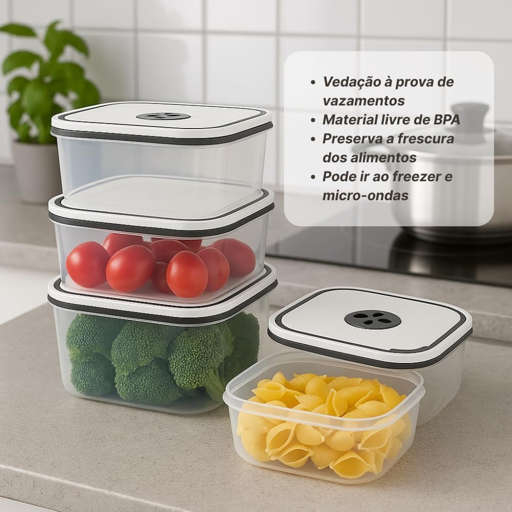Kit 5 Potes Herméticos Premium para Geladeira – Mantenha sua geladeira organizada com estilo e praticidade! Os Organizadores Quadrados com vedação hermética garantem a frescura de frutas, legumes e refeições por muito mais tempo. Livres de BPA, são ideais para armazenar alimentos de forma segura e saudável. Transforme a sua cozinha com este kit incrível!
