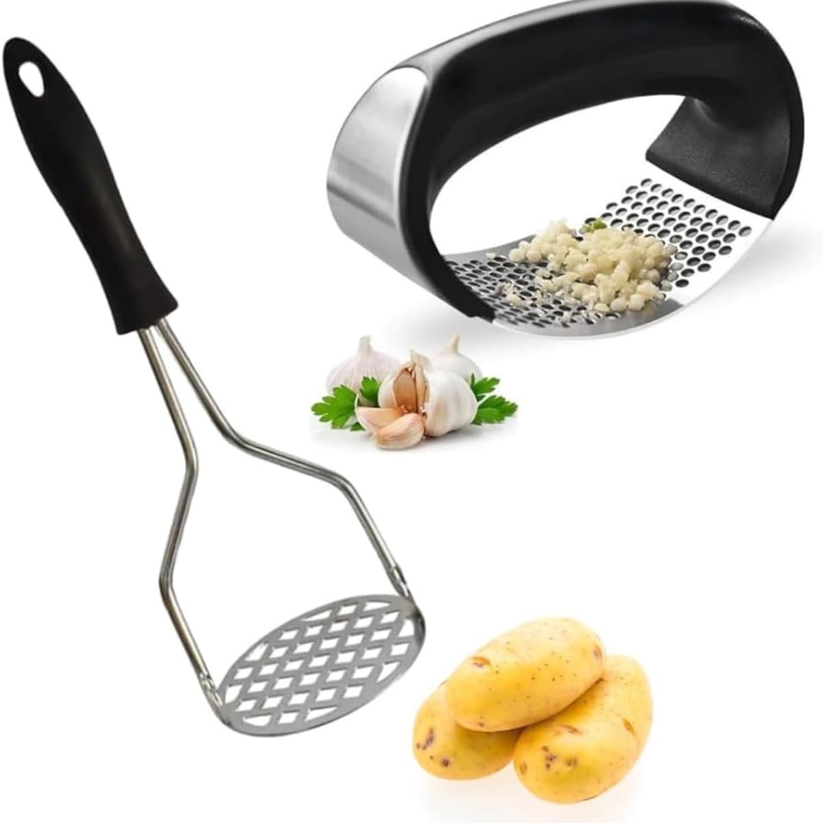 Kit Amassador de Batatas e Alho em Aço Inoxidável – Utensílios de Cozinha Práticos e Resistentes
