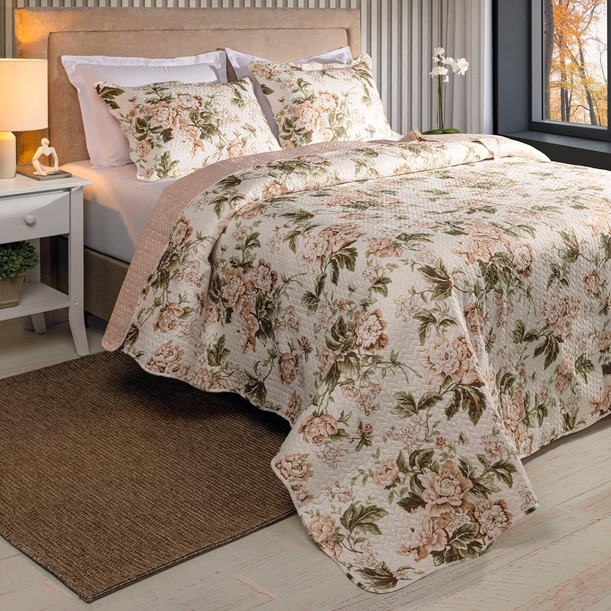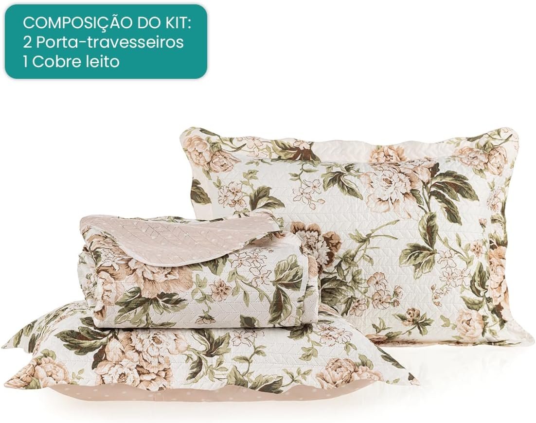 Kit Cobre Leito Colcha Boutis 3 Peças Matelado Ultrassônico Estampado Dupla Face Porta Travesseiro Aba Americana Micro Percal 150 Fios (Beatriz Rose, Casal)Kit Cobre Leito Colcha Boutis 3 Peças Matelado Ultrassônico Estampado Dupla Face Porta Travesseiro Aba Americana Micro Percal 150 Fios (Beatriz Rose, Casal)