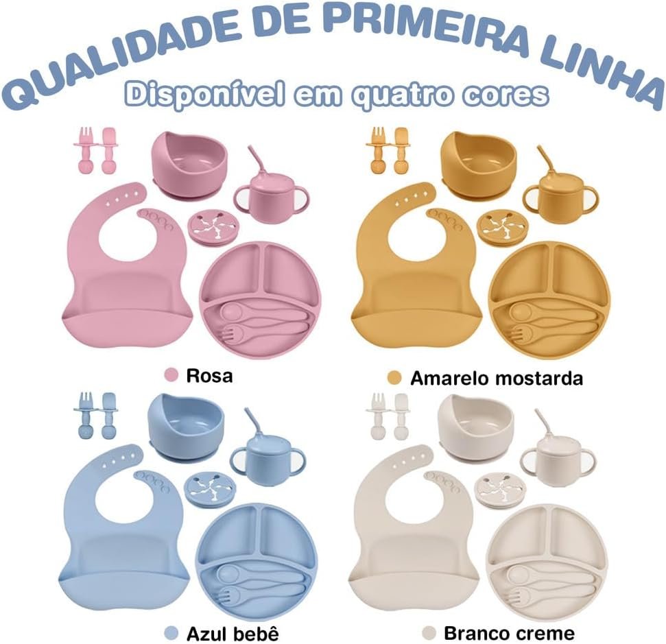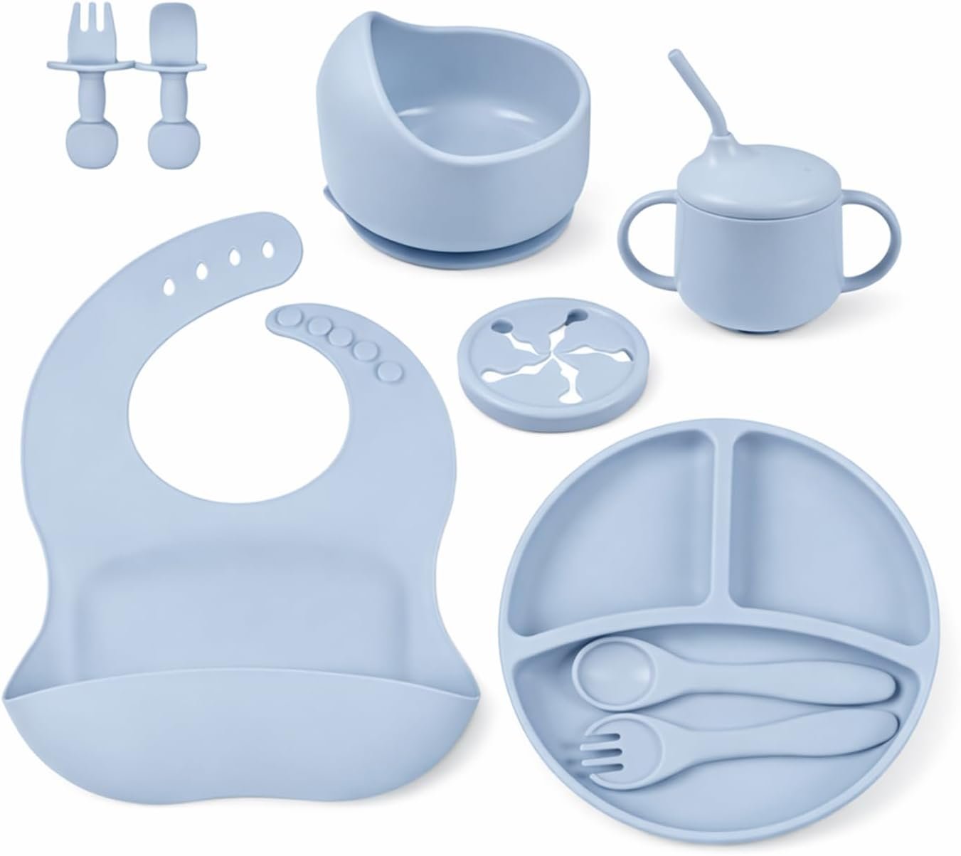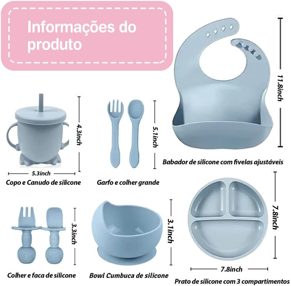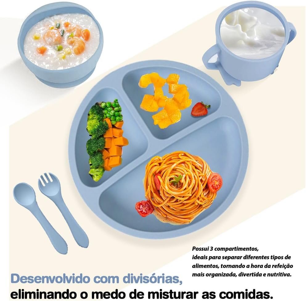Kit de Alimentação para Bebê 8 Peças em Silicone Livre de BPA, com Ventosa Antiderrapante, Prato Divisório e Babador, Presente para Introdução Alimentar(Azul)