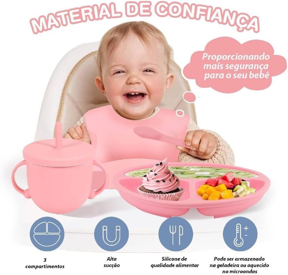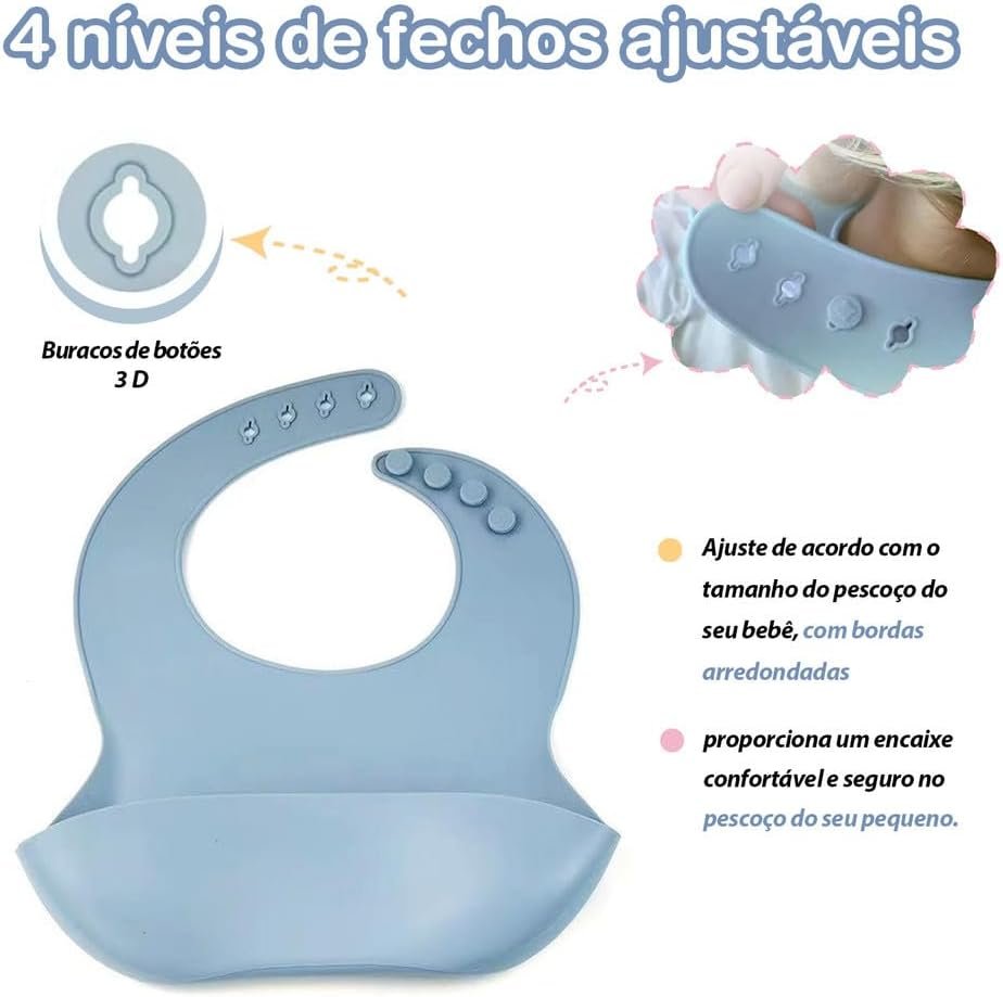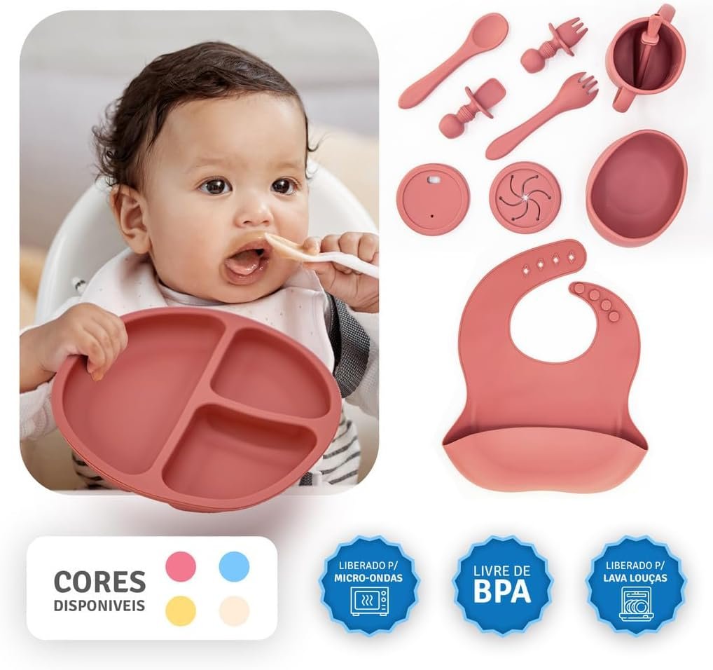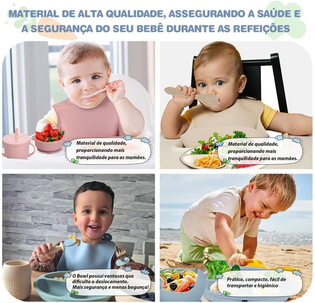 Kit de Alimentação para Bebê 8 Peças em Silicone Livre de BPA, com Ventosa Antiderrapante, Prato Divisório e Babador, Presente para Introdução Alimentar(Azul)