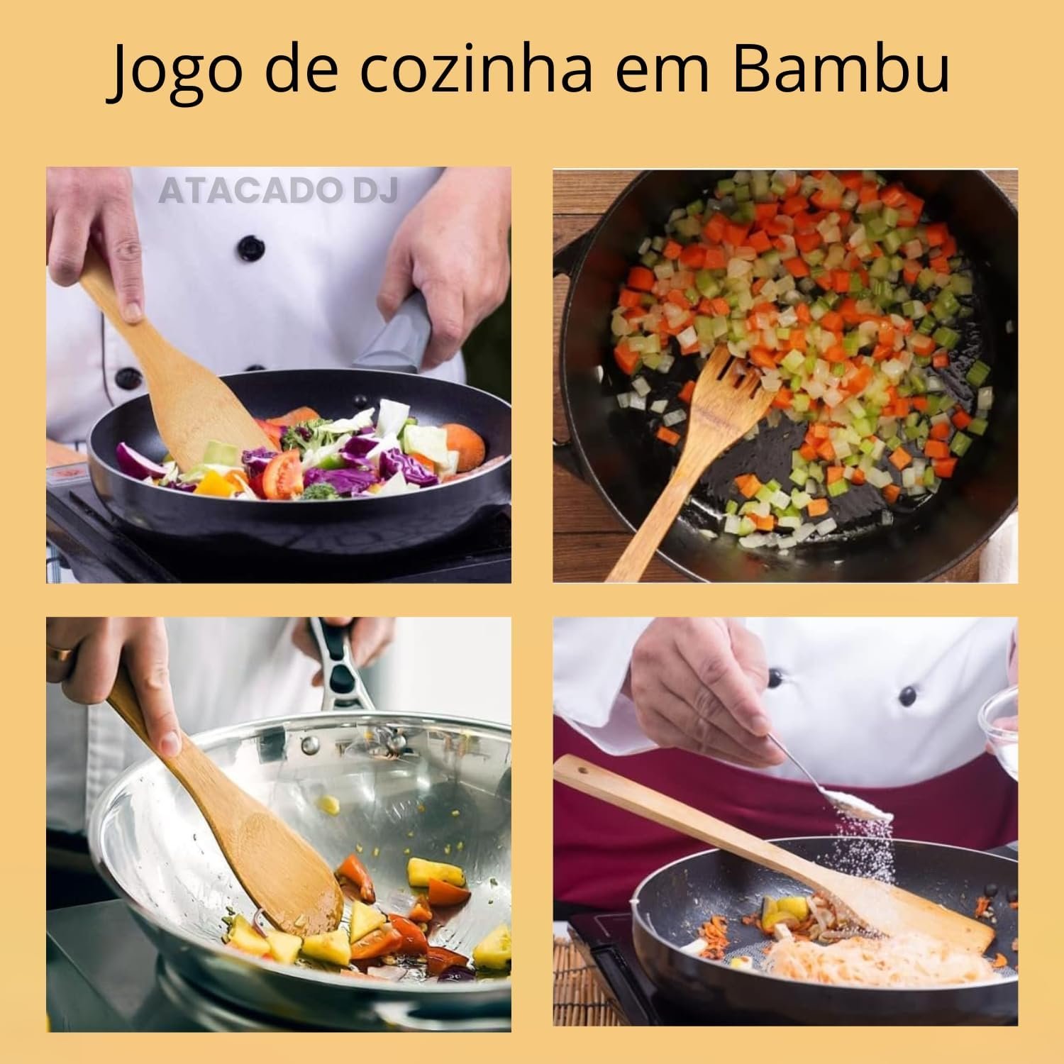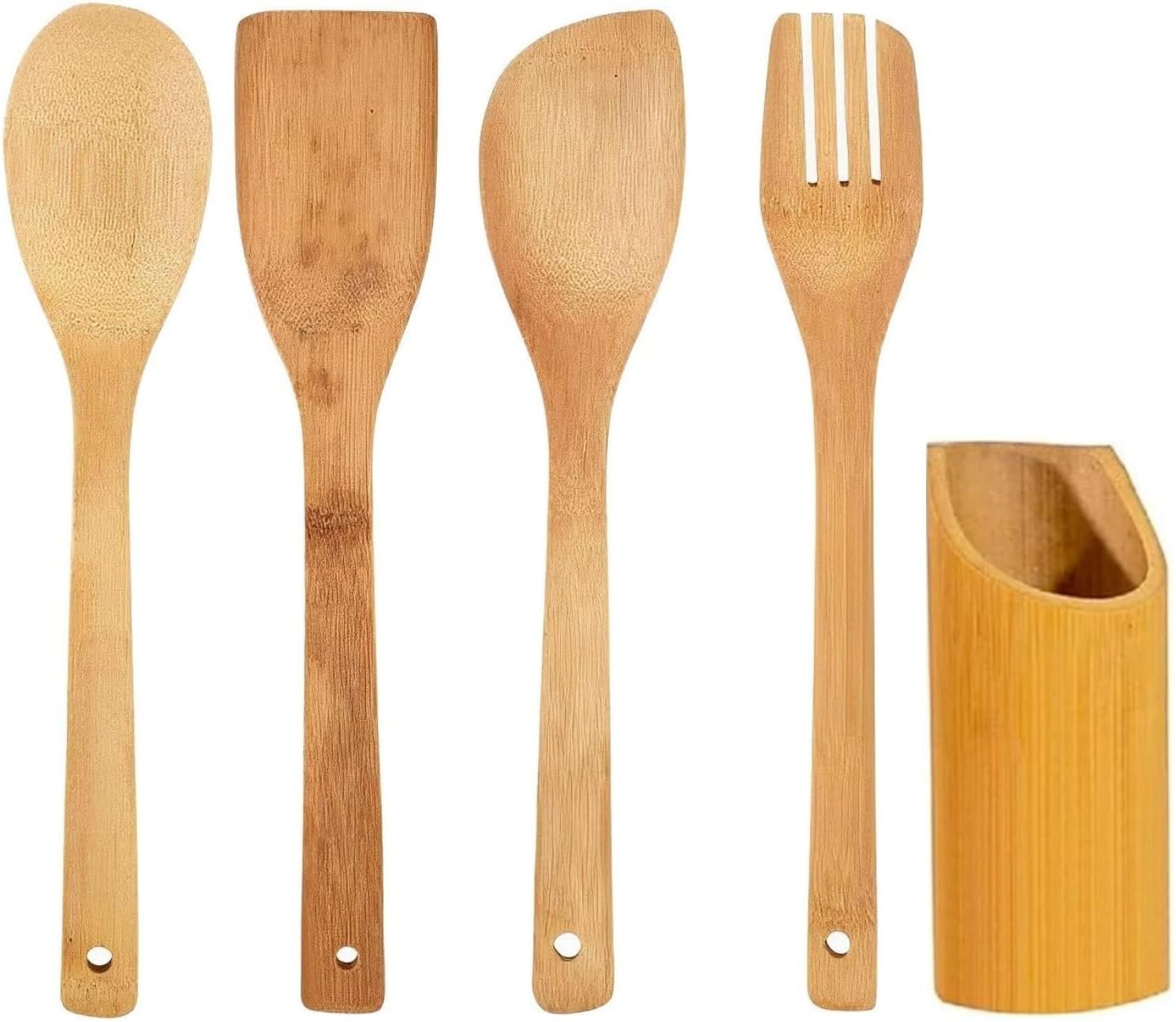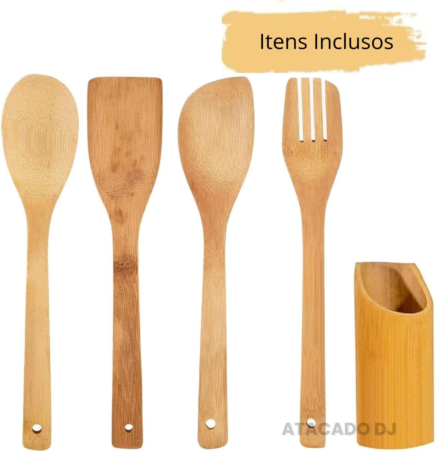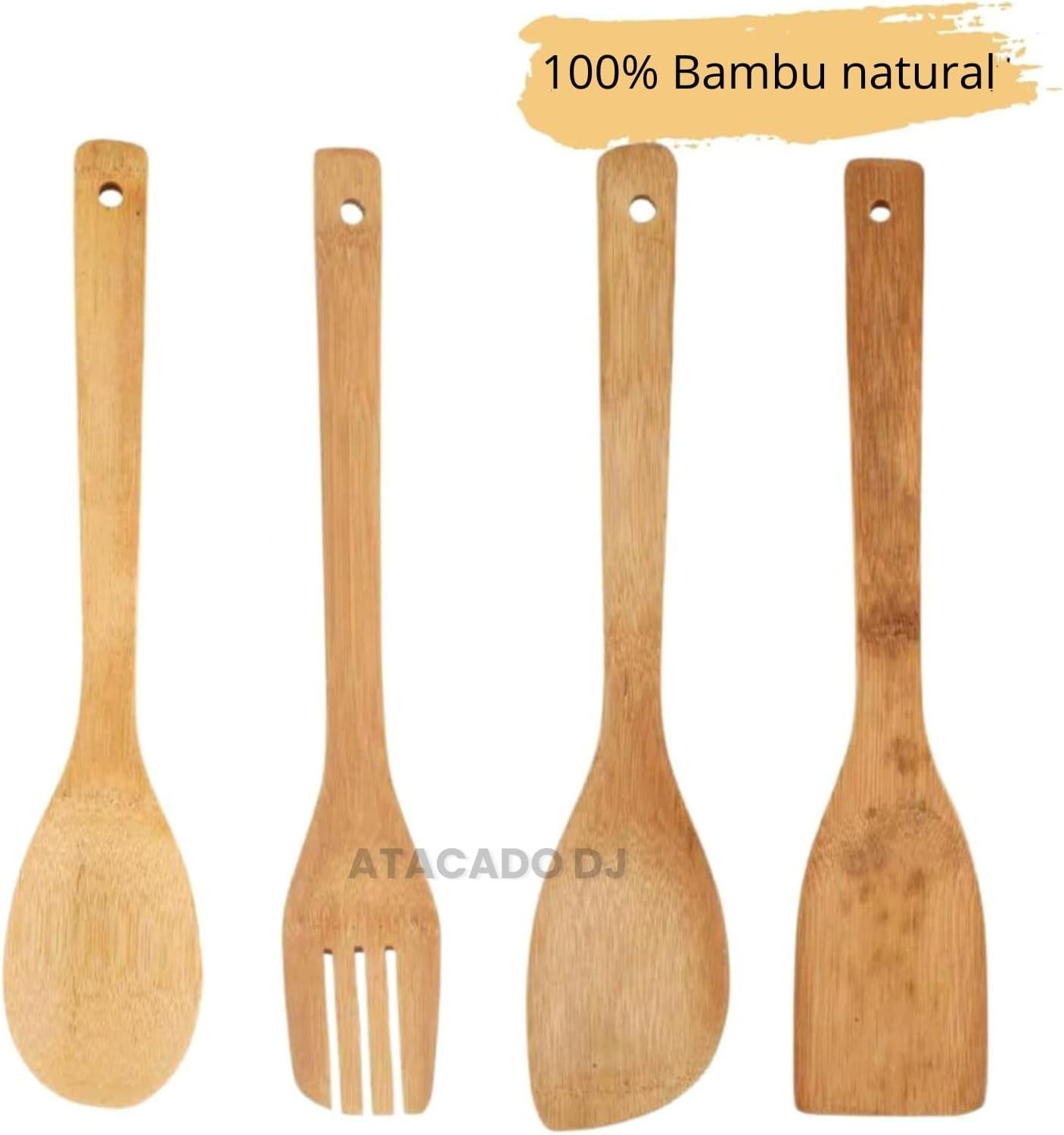 Kit de Utensílios de Cozinha em Bambu, 4 Peças, Espátula Reta, Espátula Arredondada, Garfo e Colher