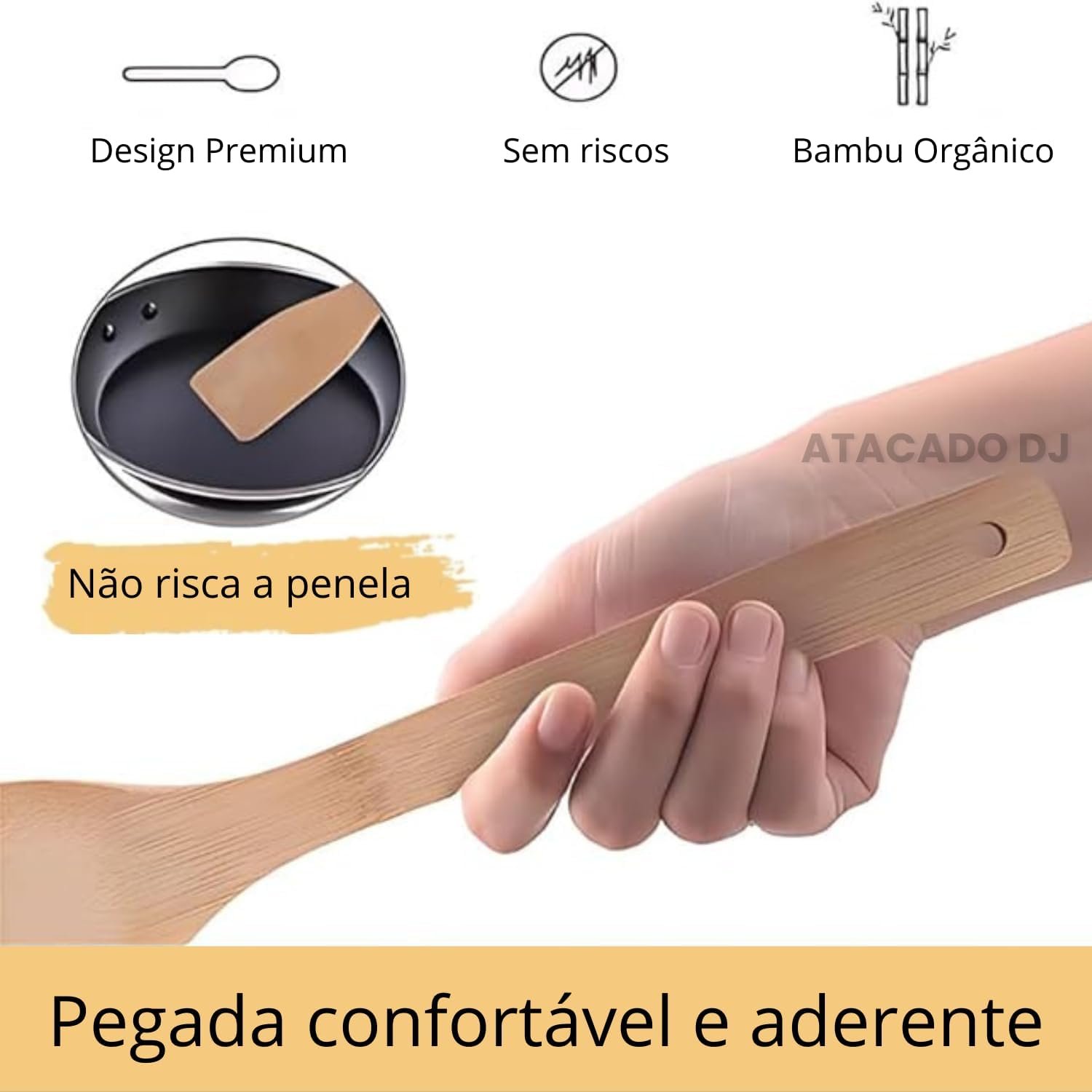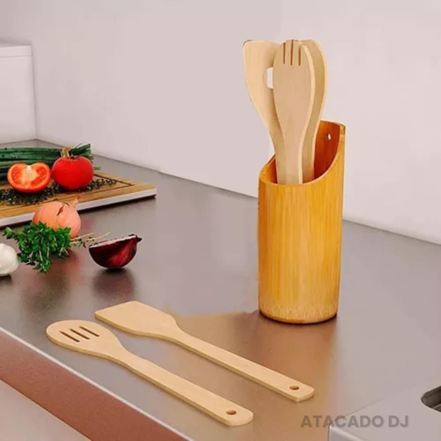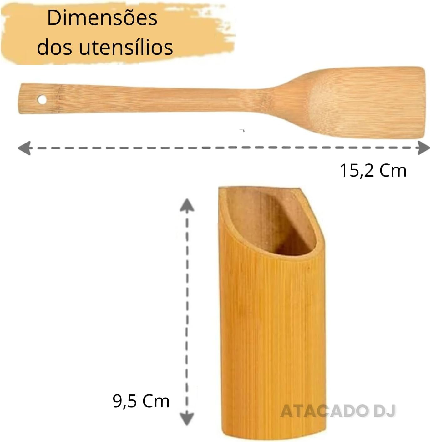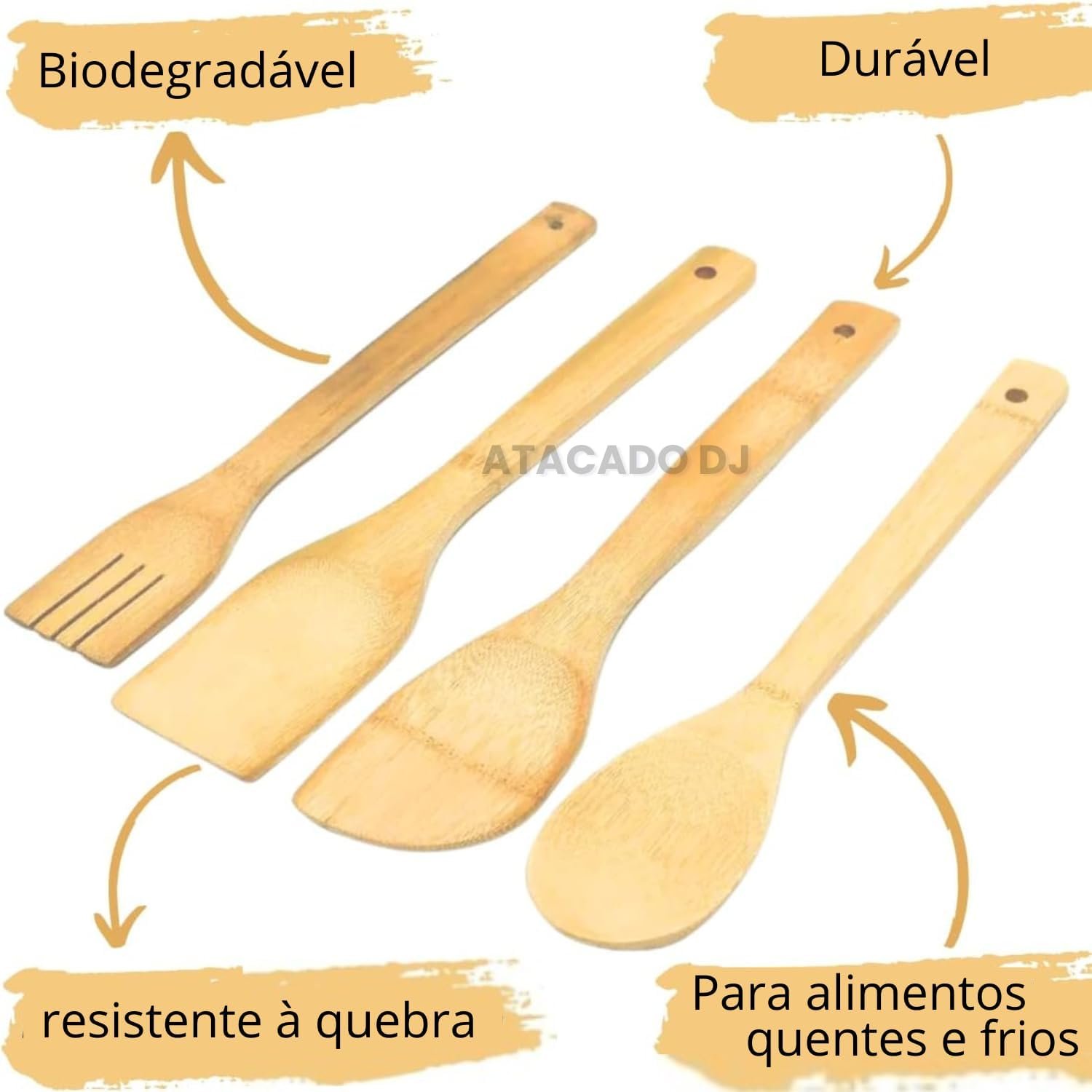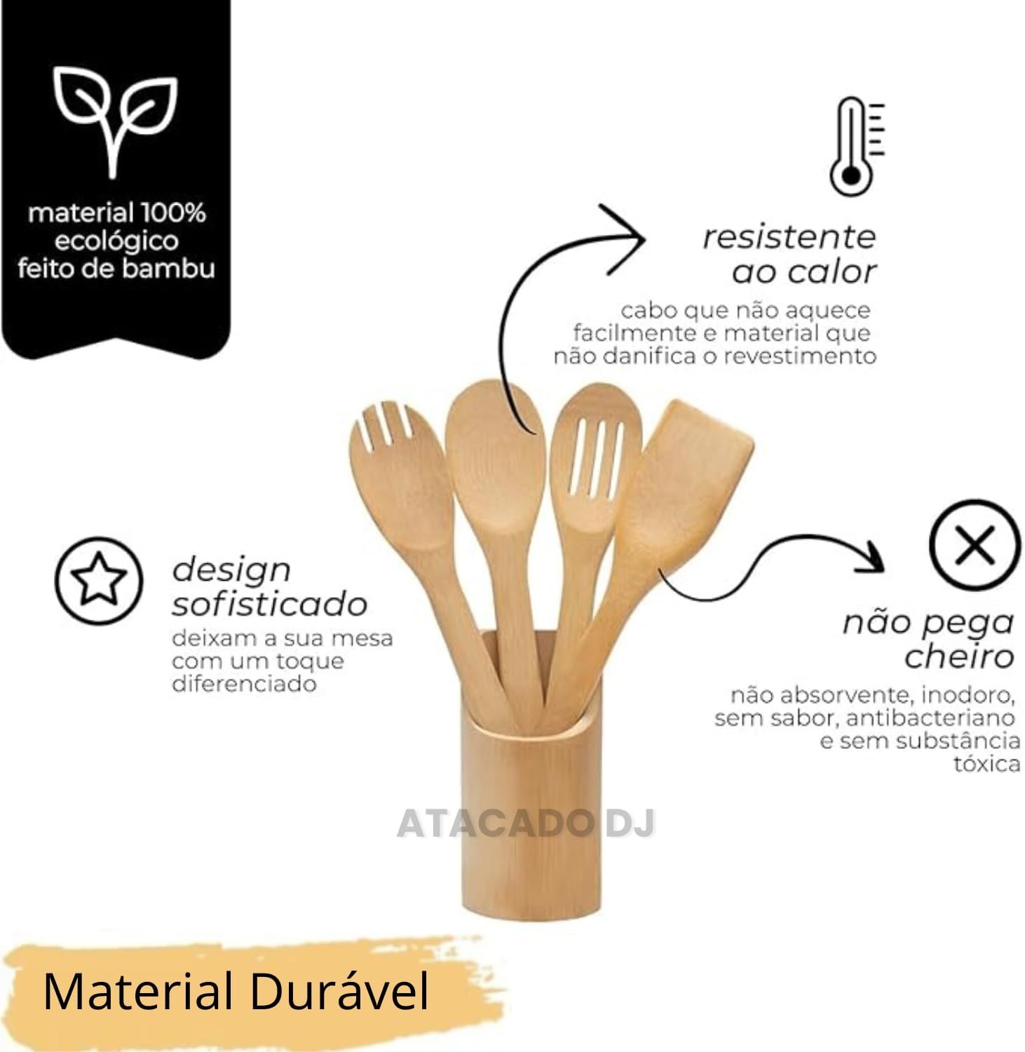 Kit de Utensílios de Cozinha em Bambu, 4 Peças, Espátula Reta, Espátula Arredondada, Garfo e Colher