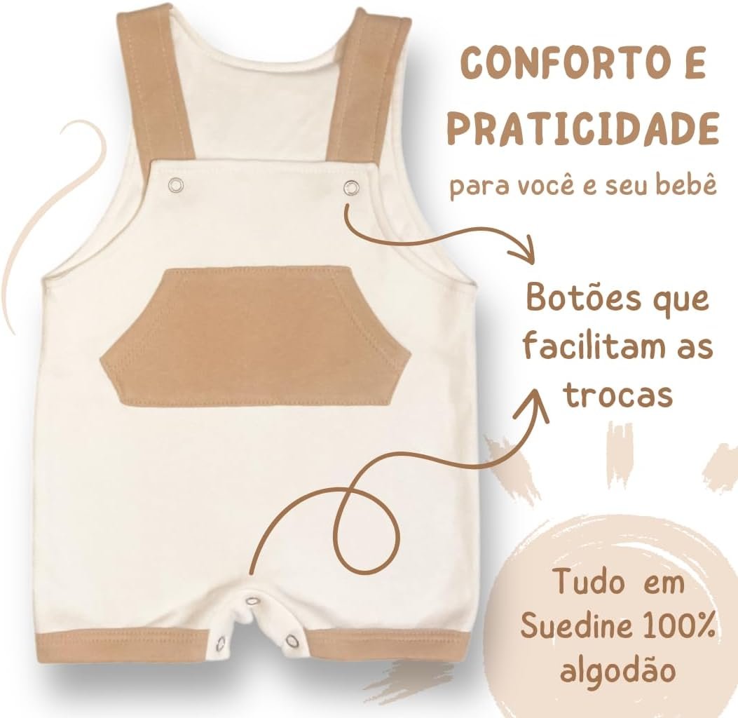 KIT Enxoval Brisa com 4 Peças Suedine 100% Algodão Jardineira, Tapa Fralda e Body Bebê