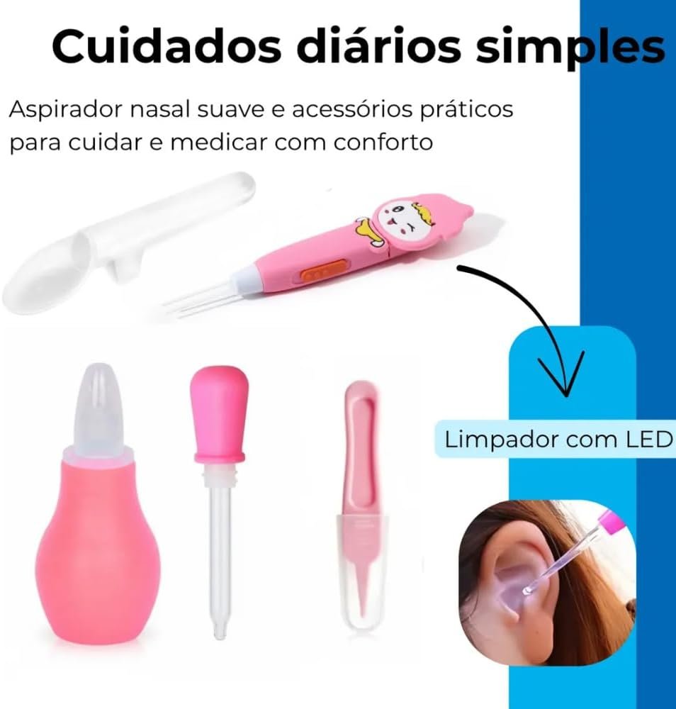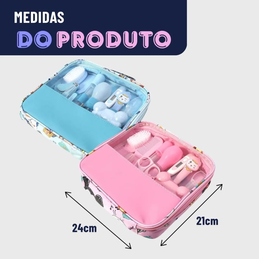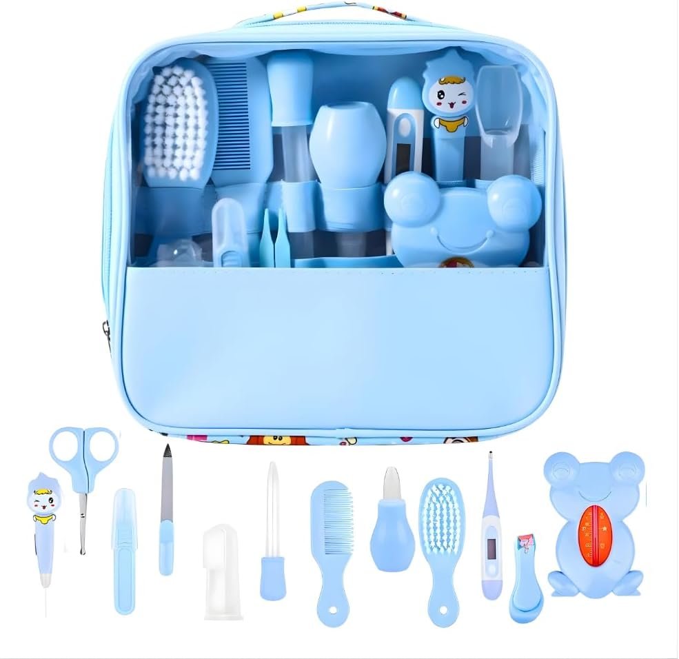 Kit Higiene e Cuidados do Bebê 13 em 1 Completo – Estojo Organizador Premium com Tesoura, Pente, Escova, Termômetro e Cortador – Bolsa Resistente Livre de BPA Premium (Azul)