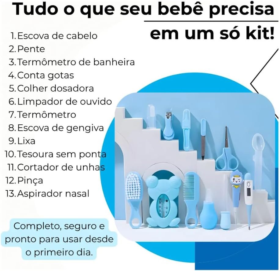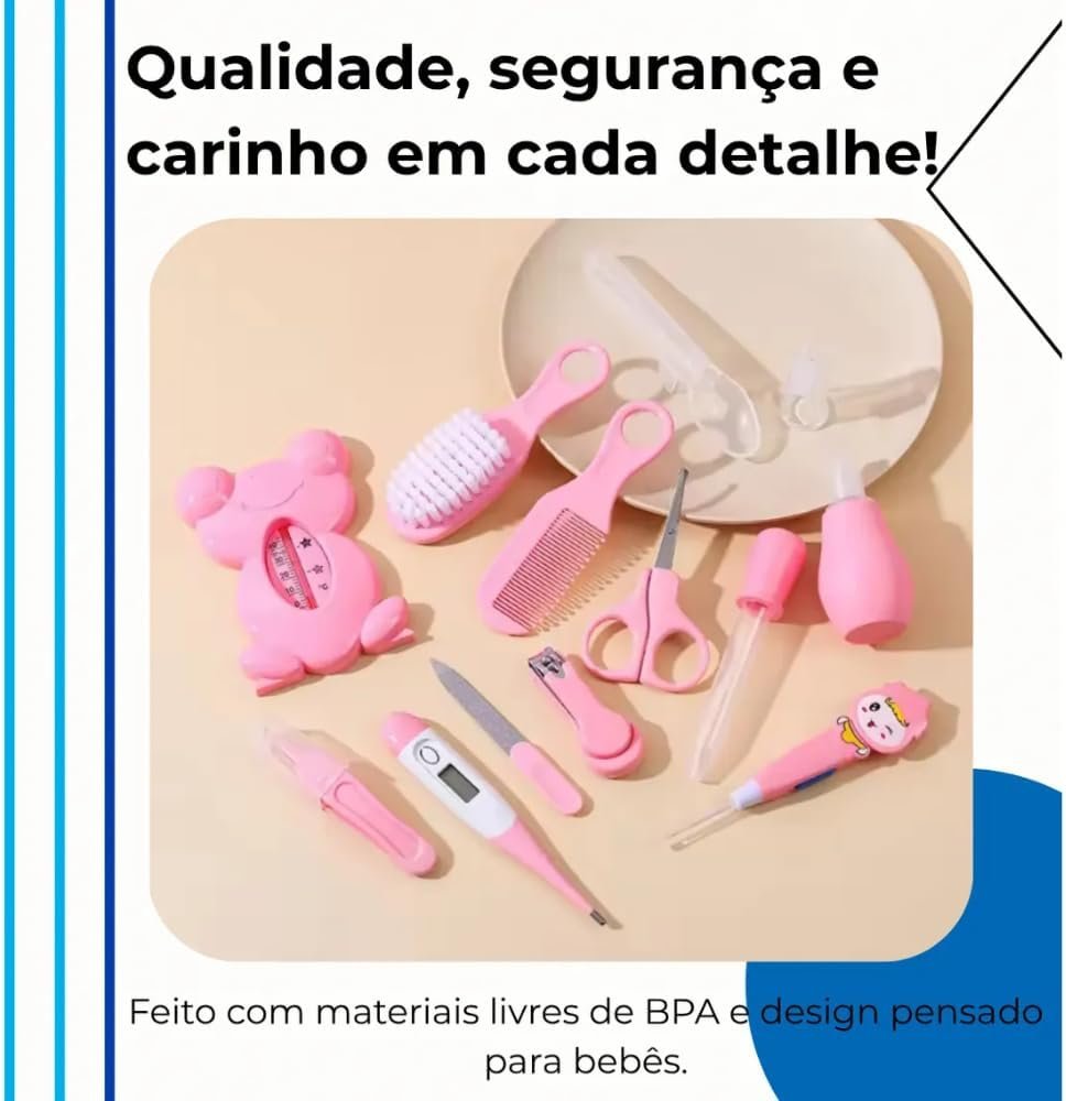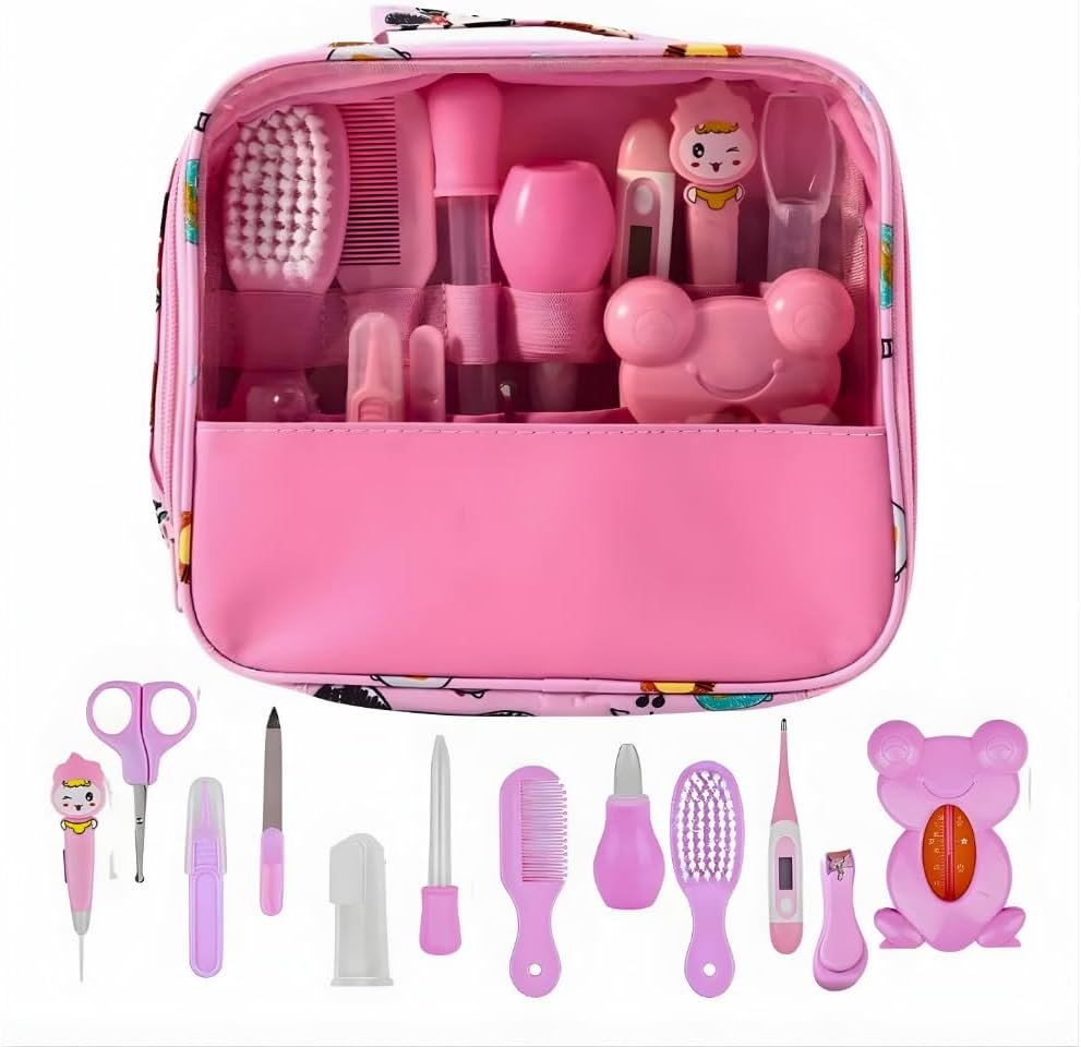 Kit Higiene e Cuidados do Bebê 13 em 1 Completo – Estojo Organizador Premium com Tesoura, Pente, Escova, Termômetro e Cortador – Bolsa Resistente Livre de BPA Premium (Rosa)