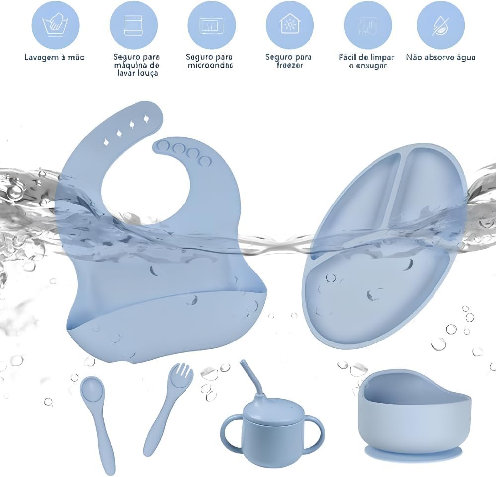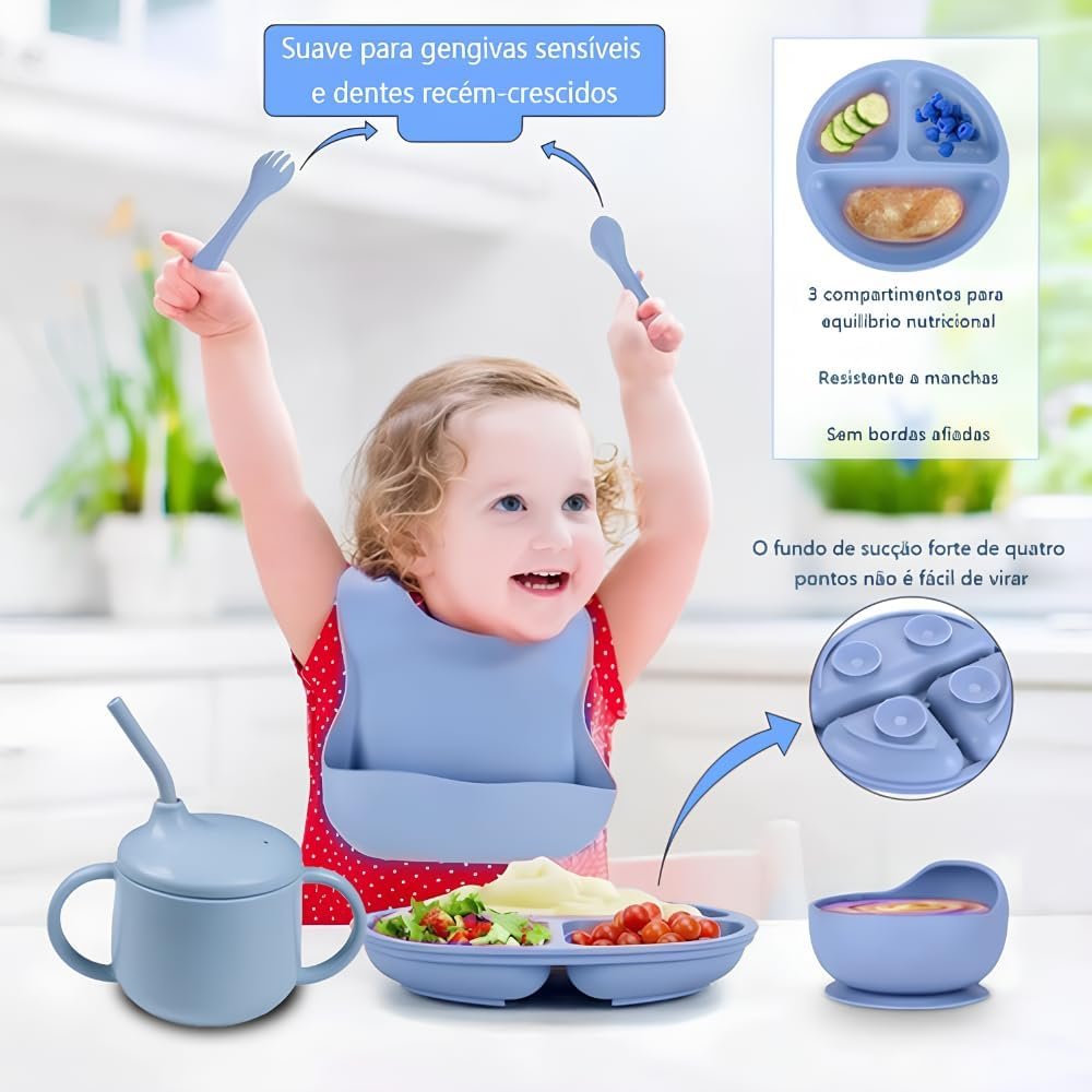 Kit Introdução Alimentar Bebê 8 Peças Prato + Bowl Babador Copo + Tampa com Canudo + 2 Talheres + 2 Talheres Ponta Silicone Cabo de Madeira 100% Silicone Antitóxico Premium (Rosa Rubi)