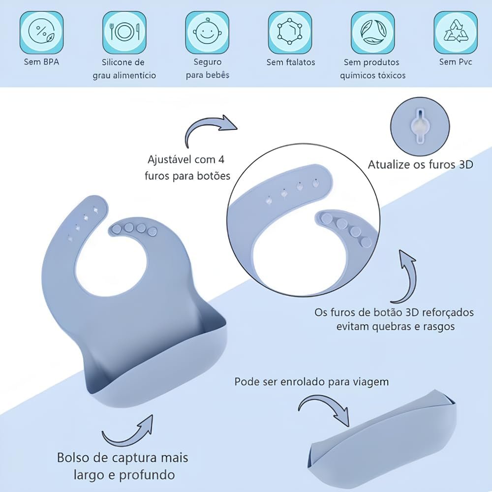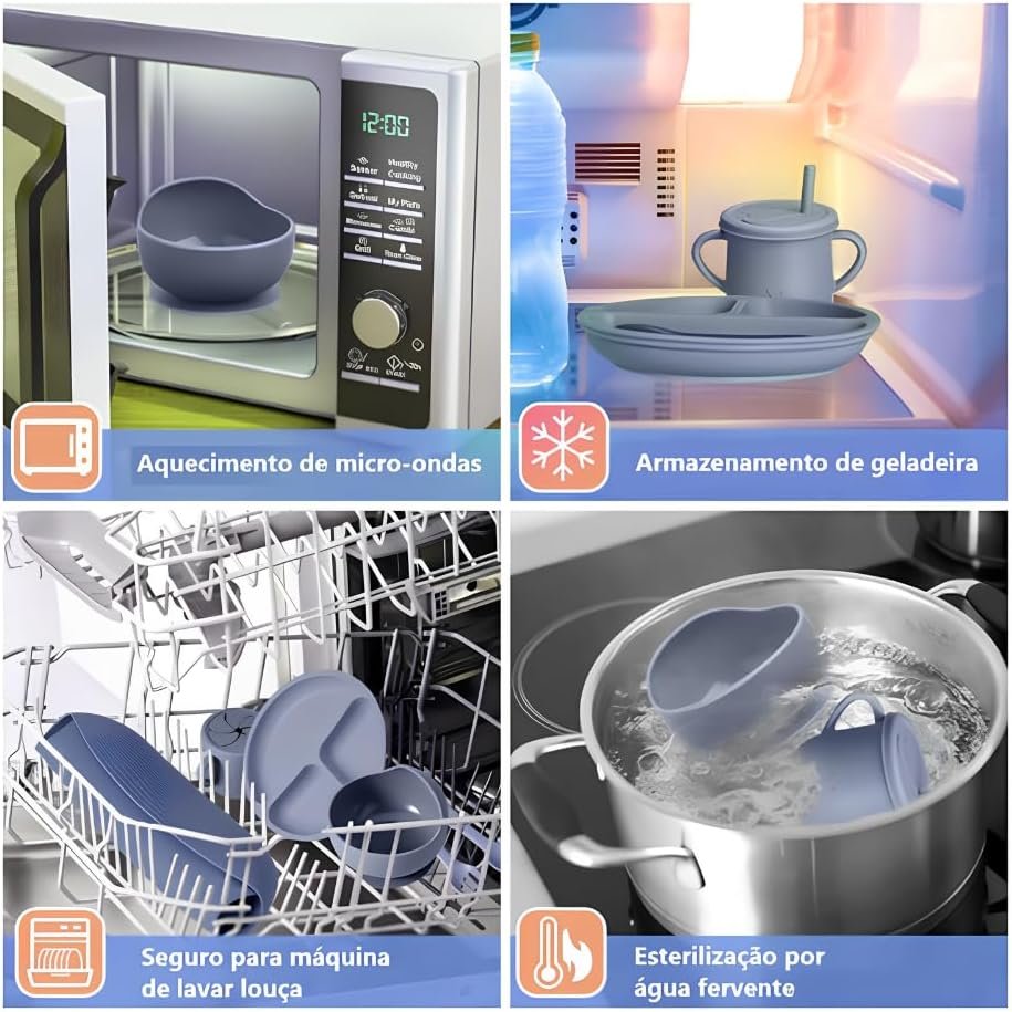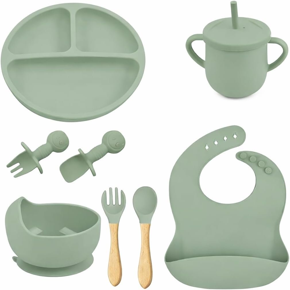 Kit Introdução Alimentar Bebê 8 Peças Prato + Bowl Babador Copo + Tampa com Canudo + 2 Talheres + 2 Talheres Ponta Silicone Cabo de Madeira 100% Silicone Antitóxico Premium (Verde)