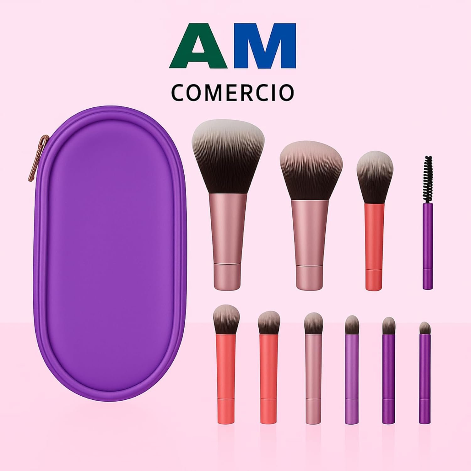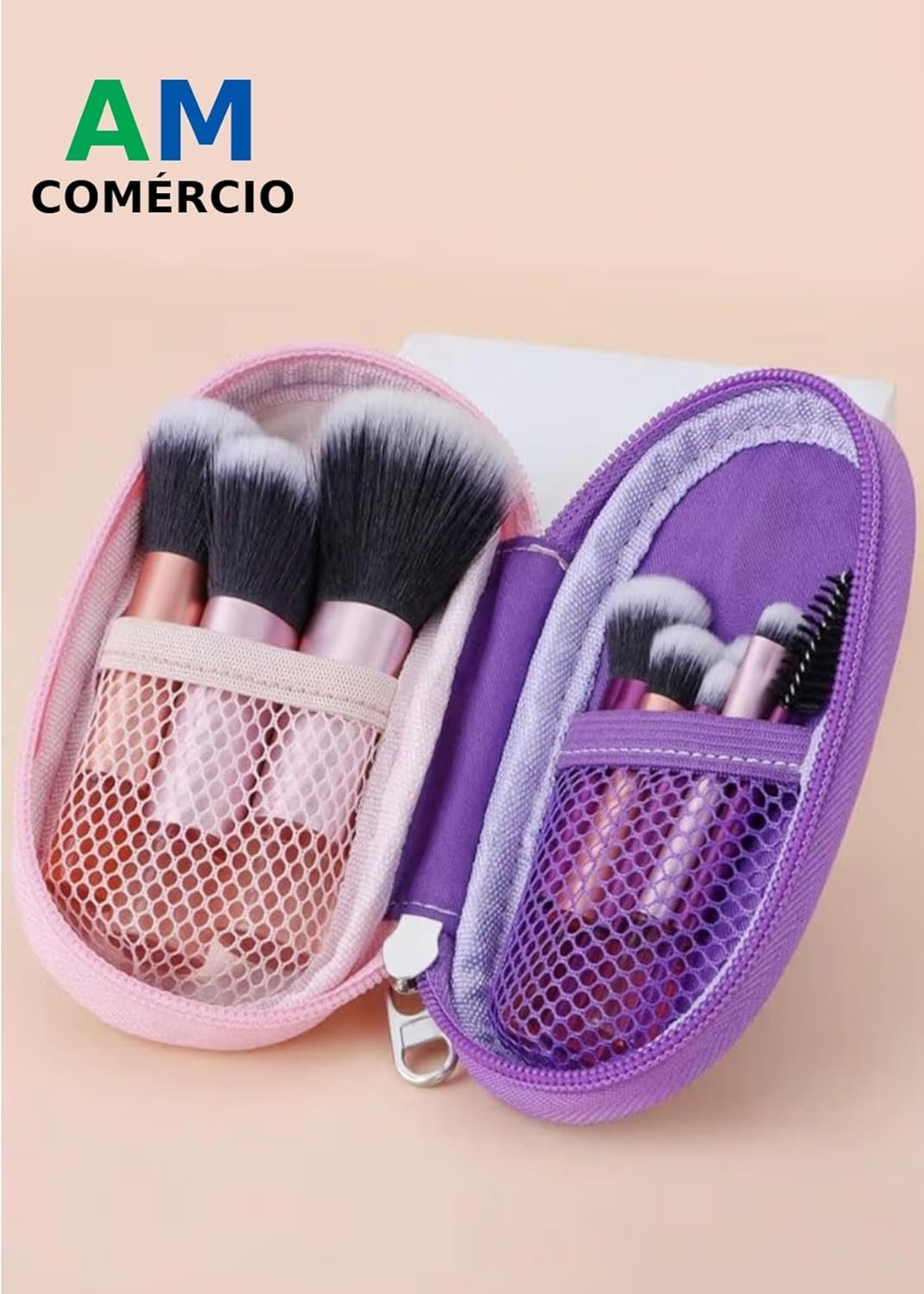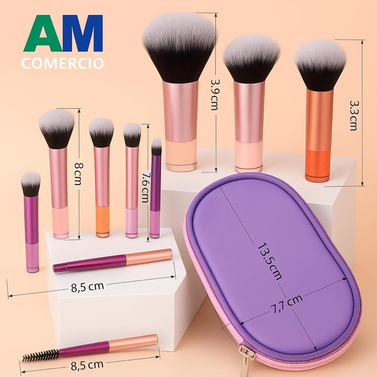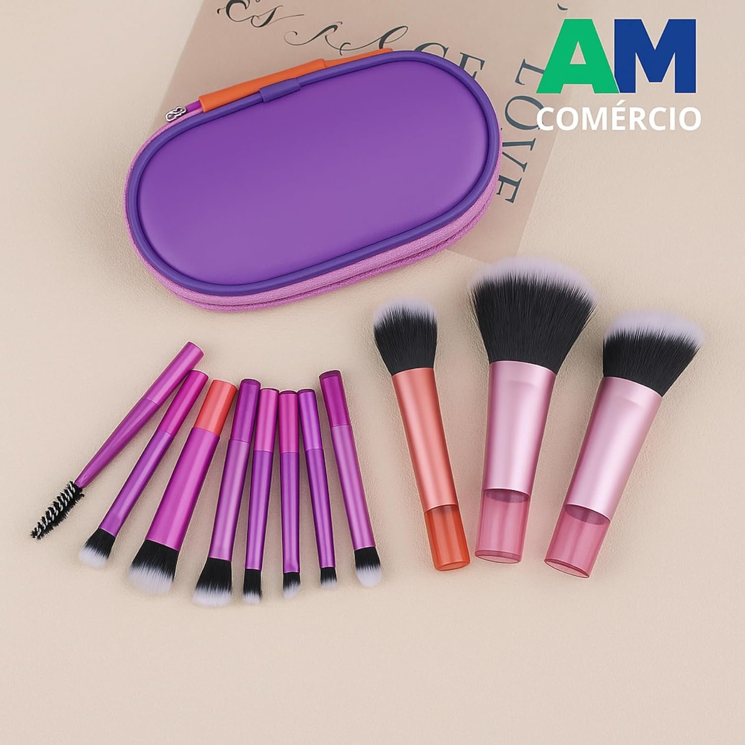 Kit Mini Pincéis de Maquiagem 10 Peças Travel Size com Nécessaire – Cerdas Macias para Make Completa – Rosa e Roxo