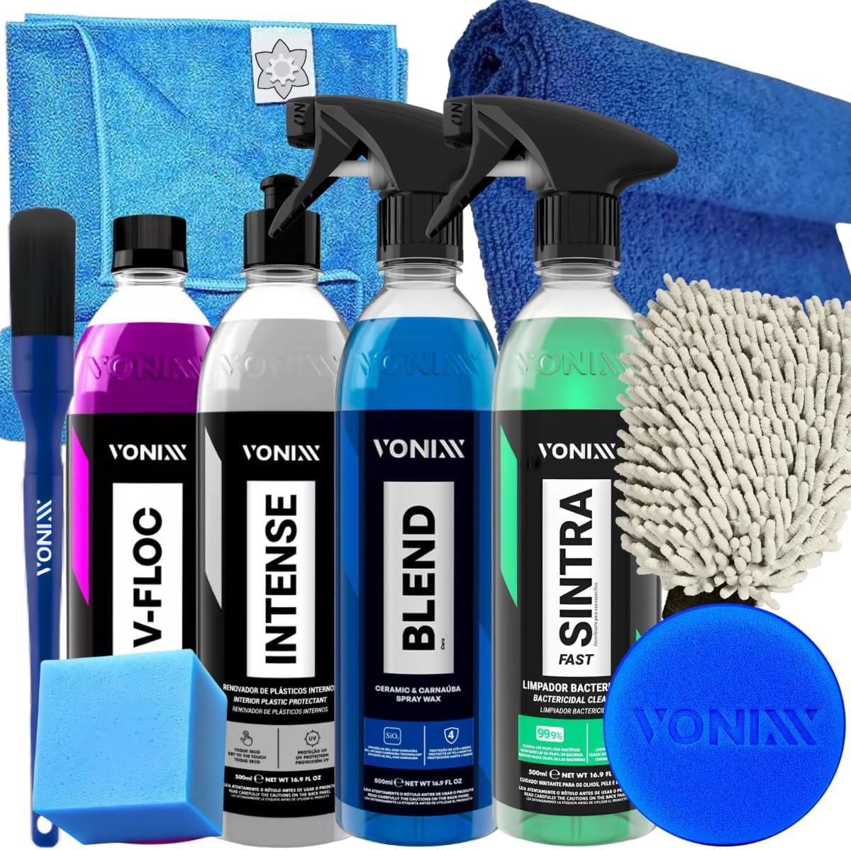 Descrição: Deixe seu veículo impecável com o Kit Vonixx! Contém produtos de alta qualidade, como o Blend Spray, Cera Líquida Sintra Fast, Shampoo Automotivo Intense e Restaurador de Plásticos Internos. Aplique com facilidade e obtenha resultados profissionais em casa!